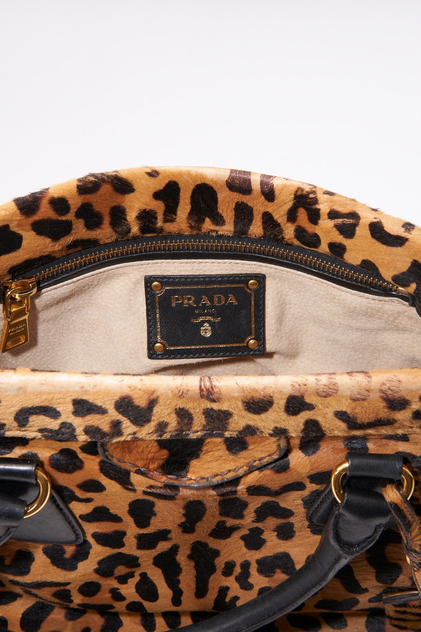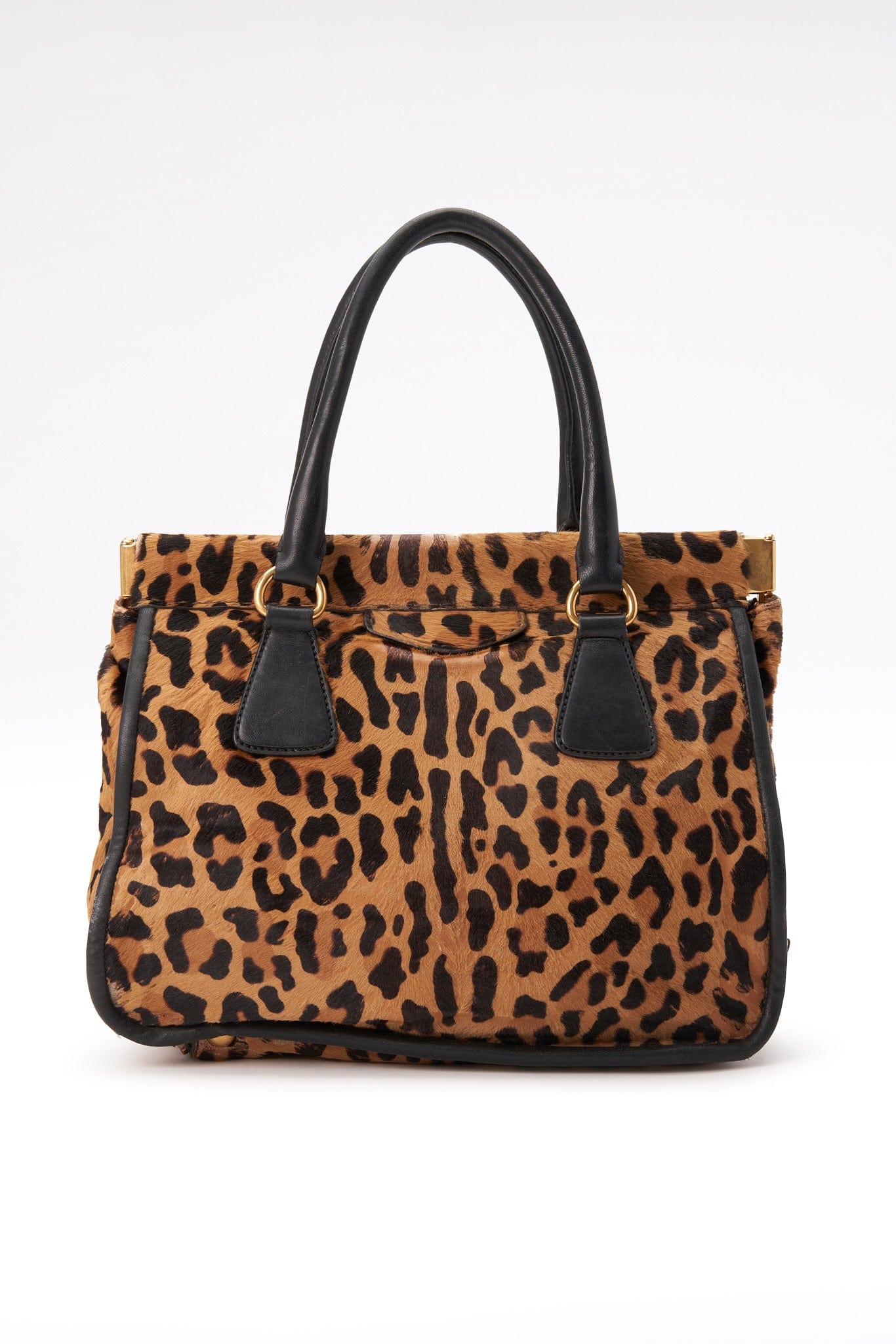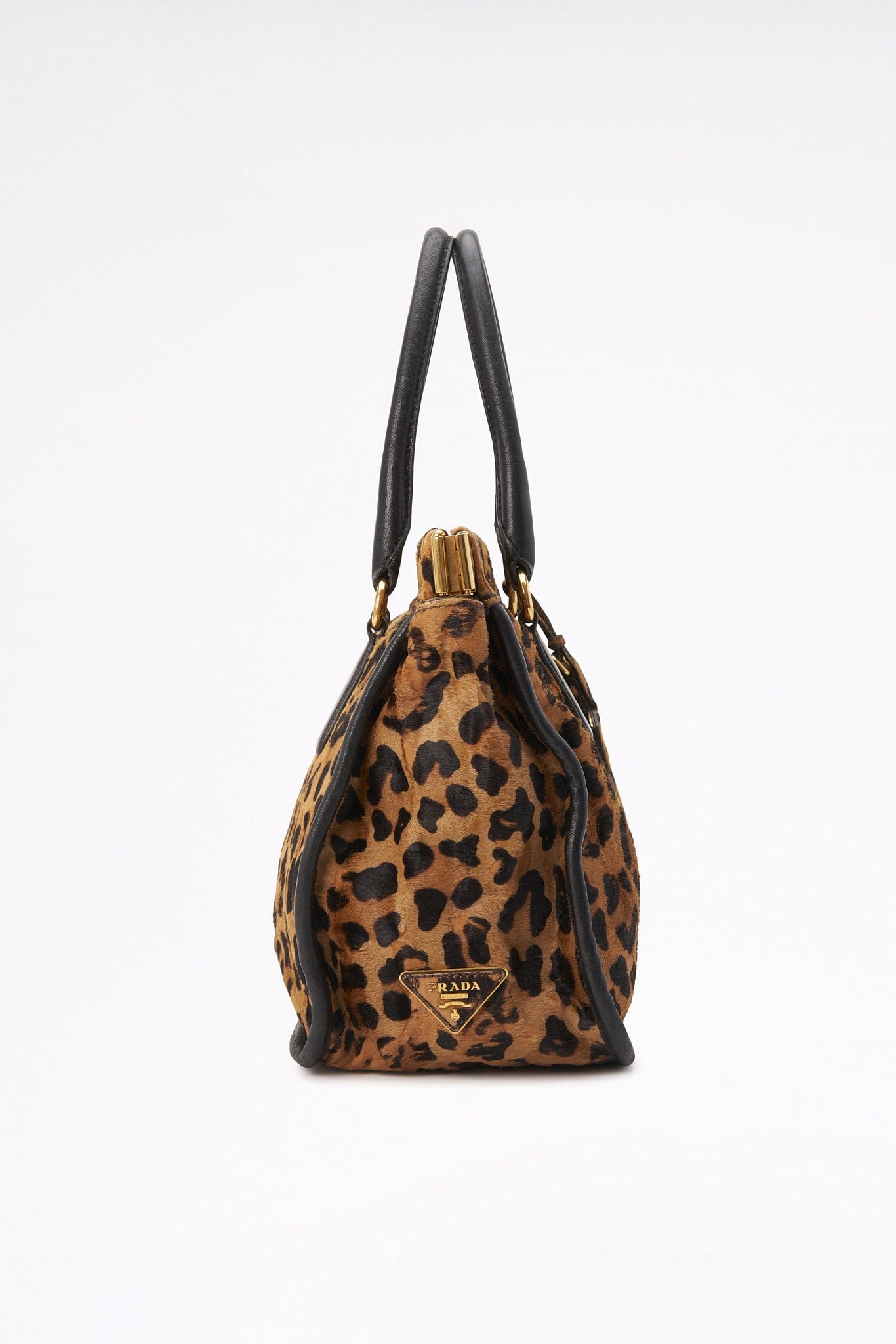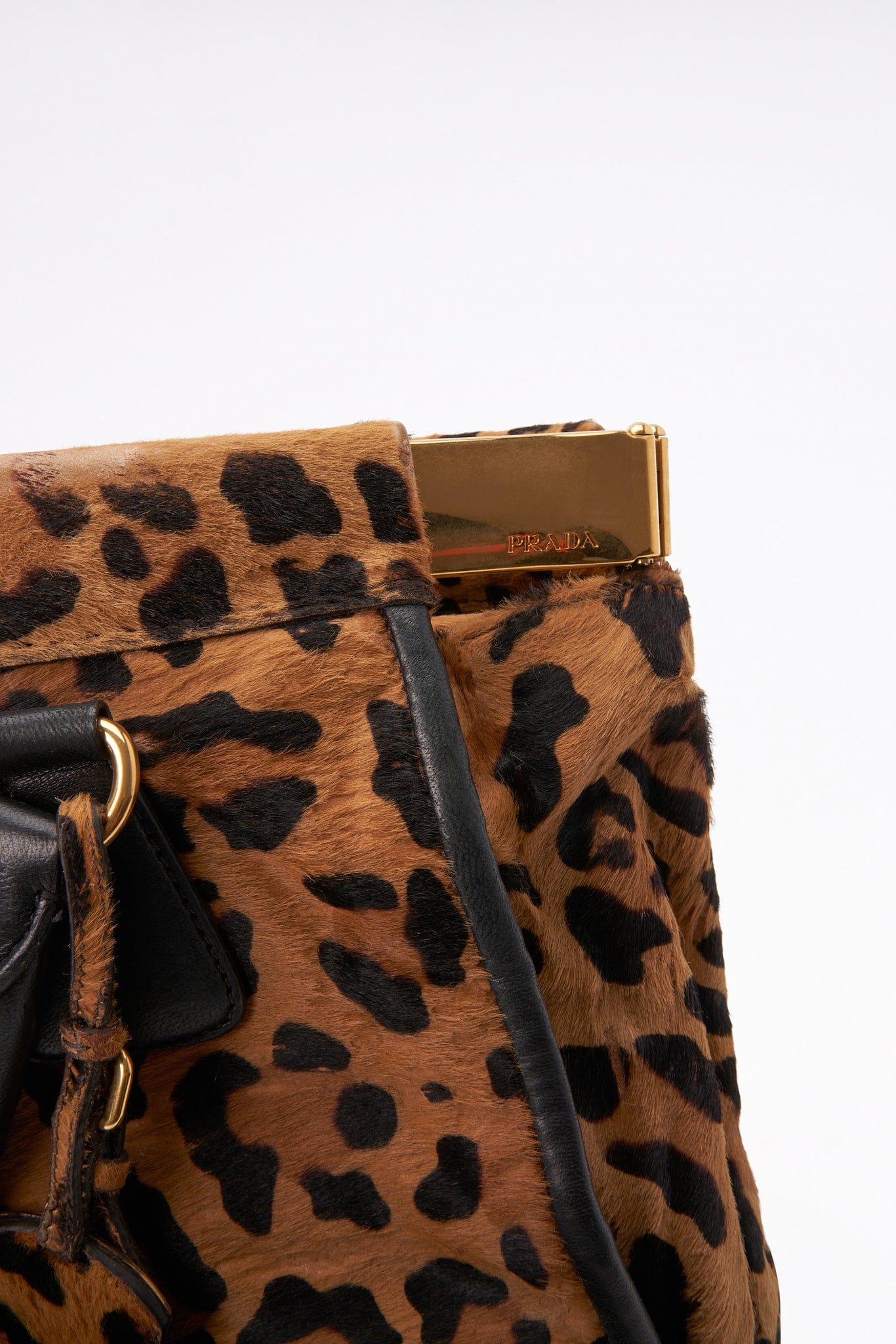 A divine vintage Prada bag crafted from leopard printed calf hair, a gold framed closure and black leather handles.
