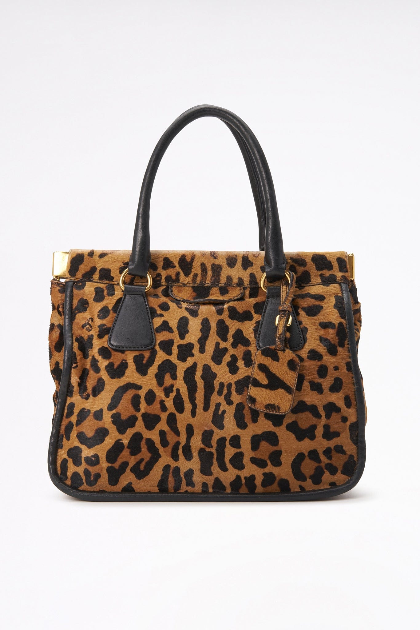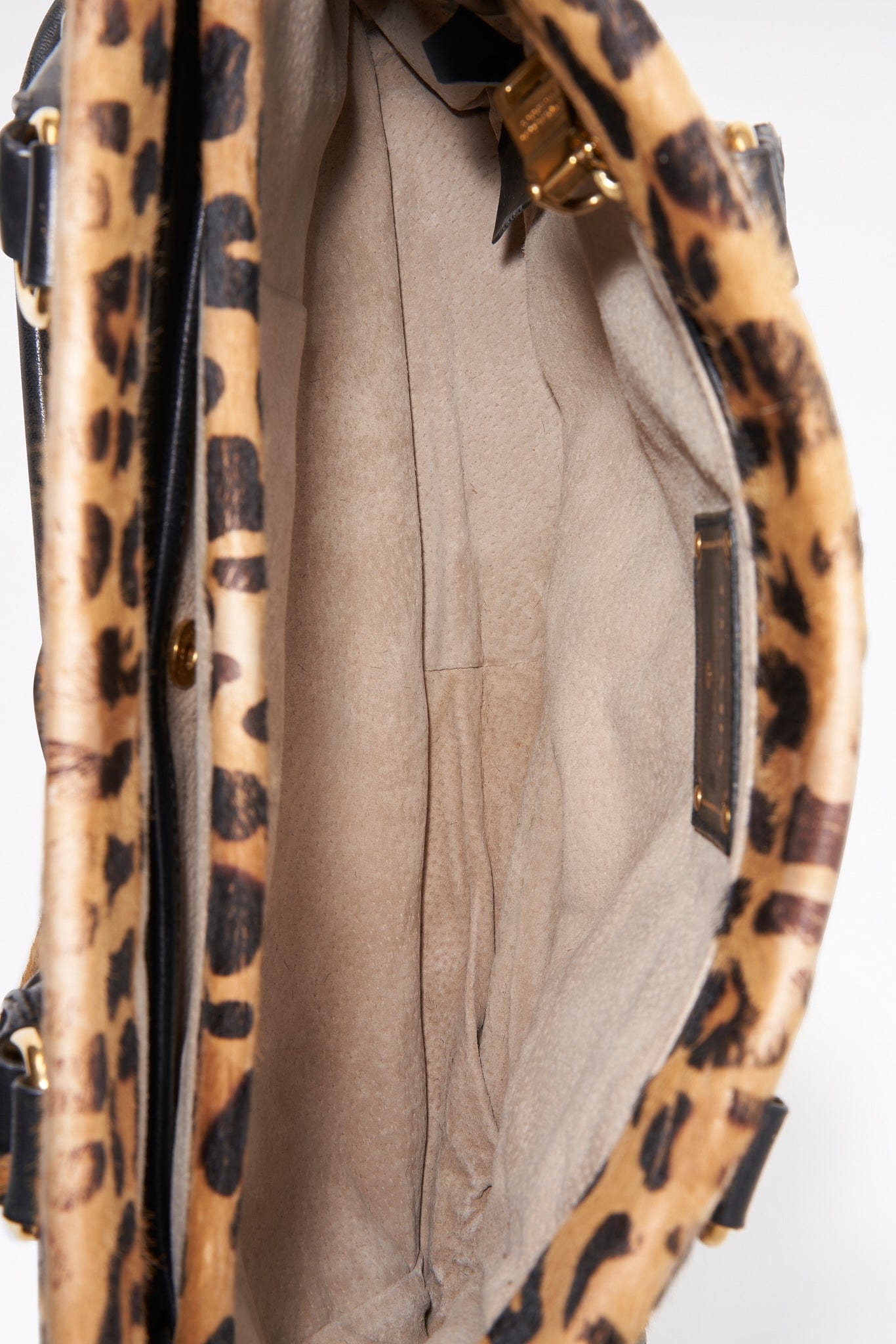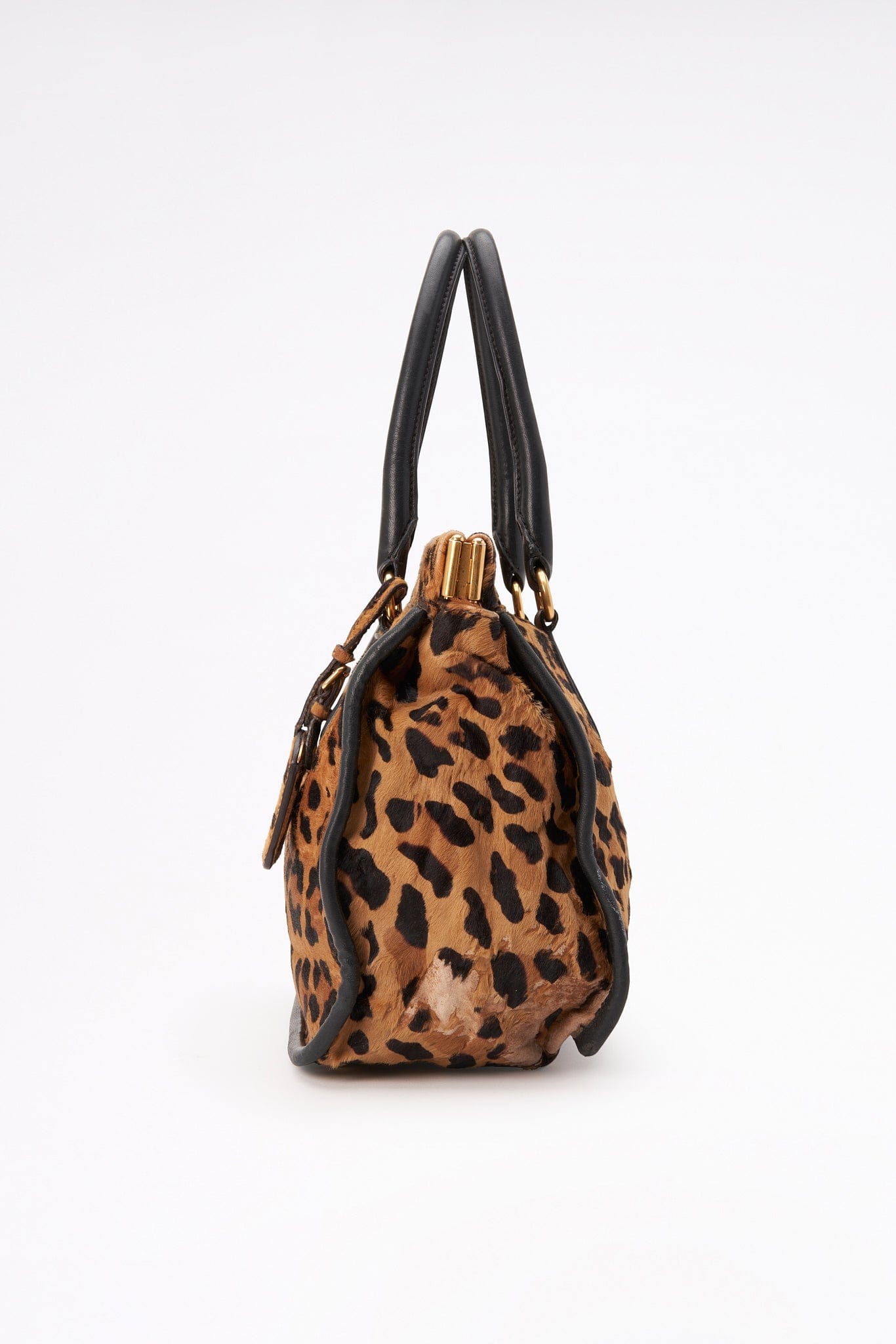 A divine vintage Prada bag crafted from leopard printed calf hair, a gold framed closure and black leather handles.