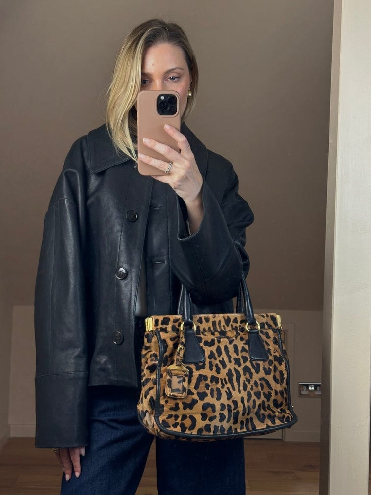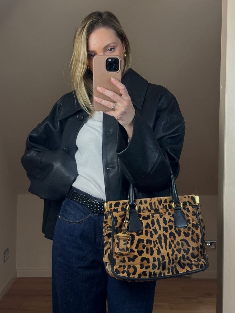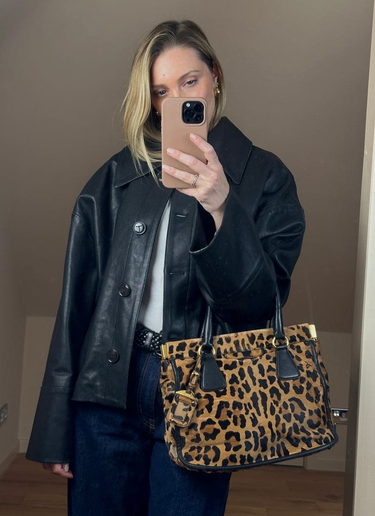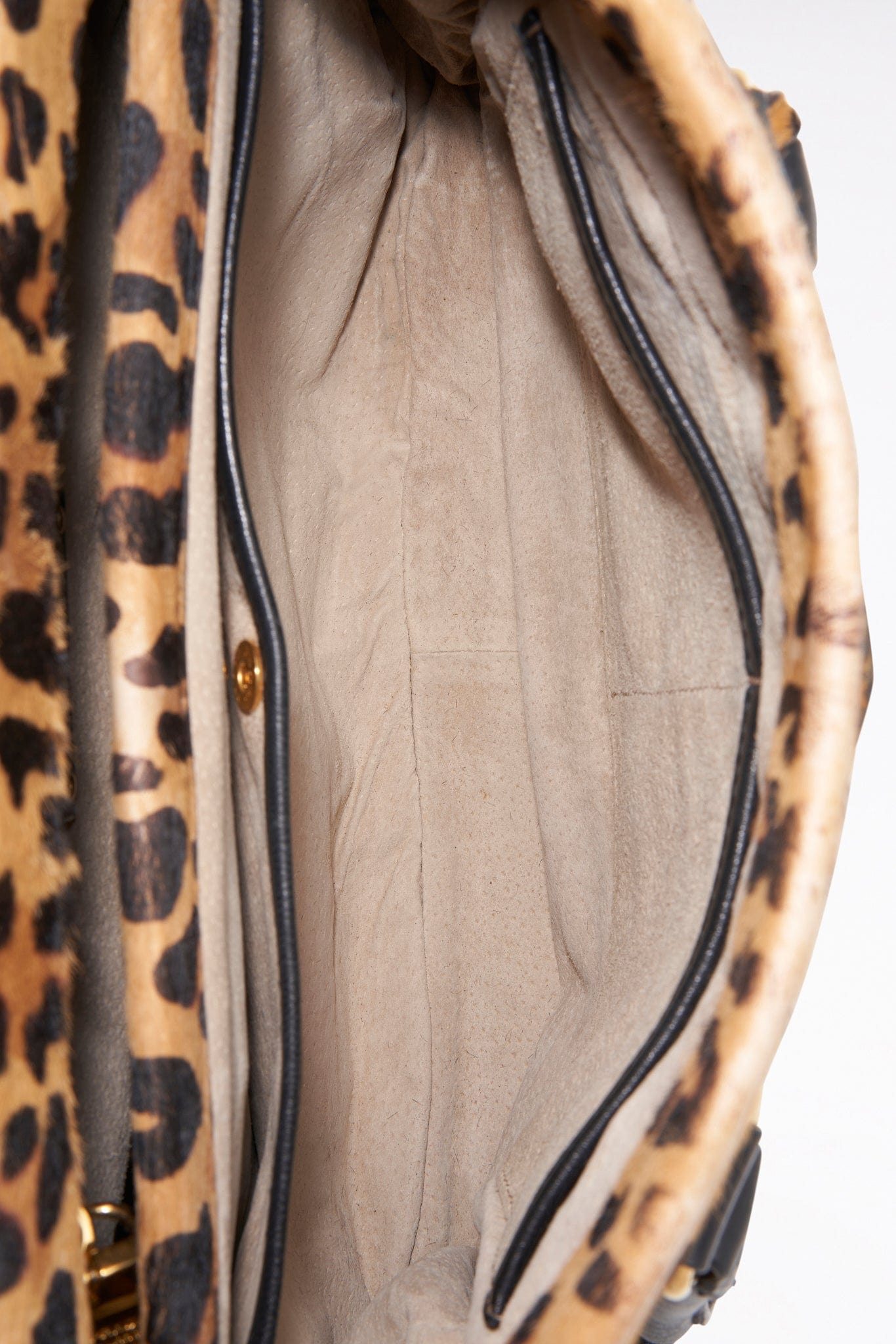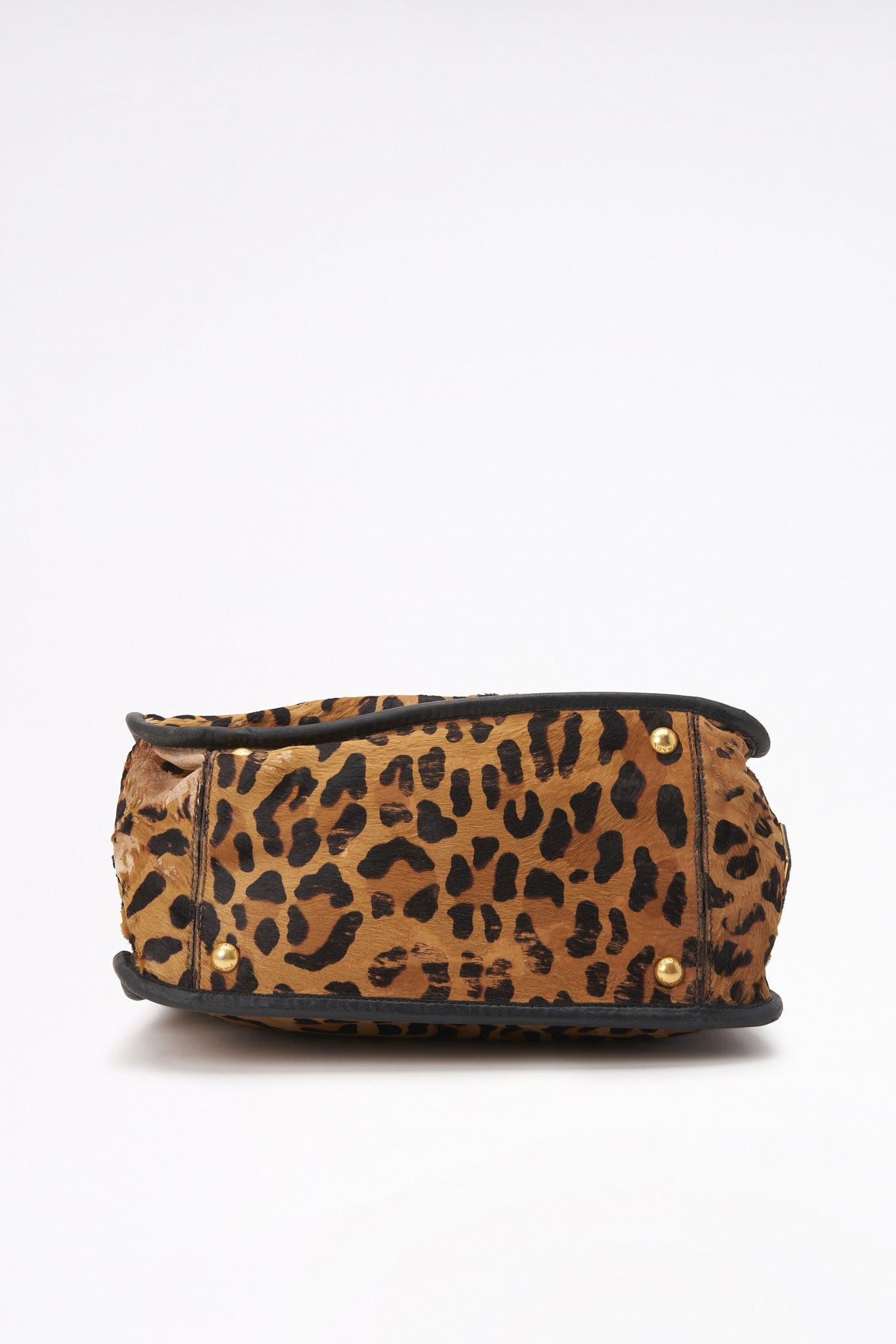 A divine vintage Prada bag crafted from leopard printed calf hair, a gold framed closure and black leather handles.