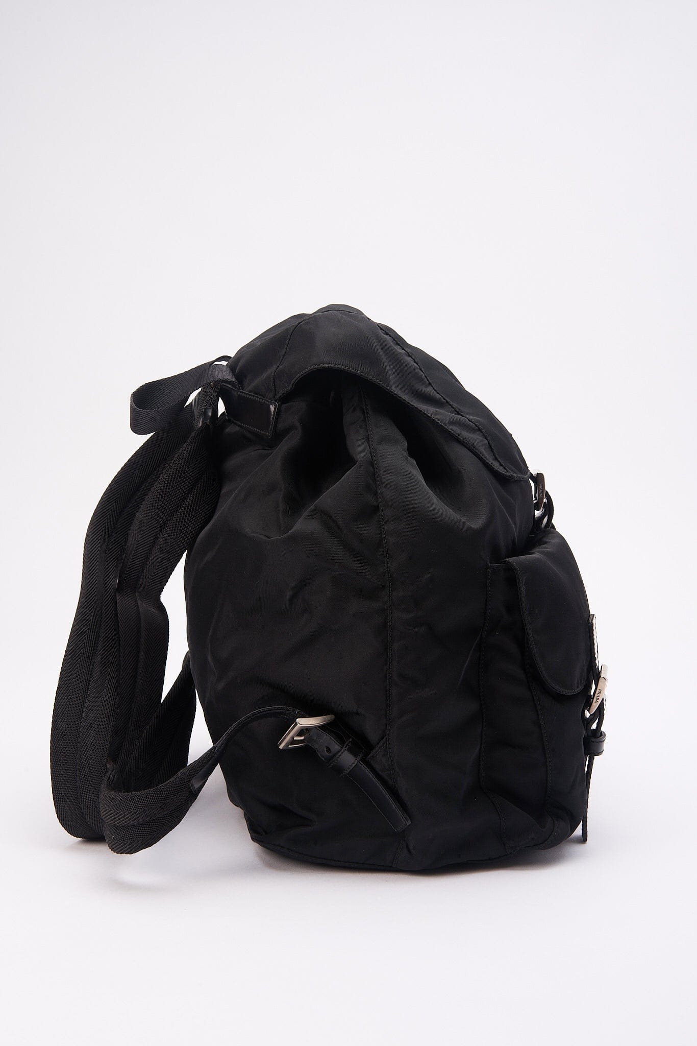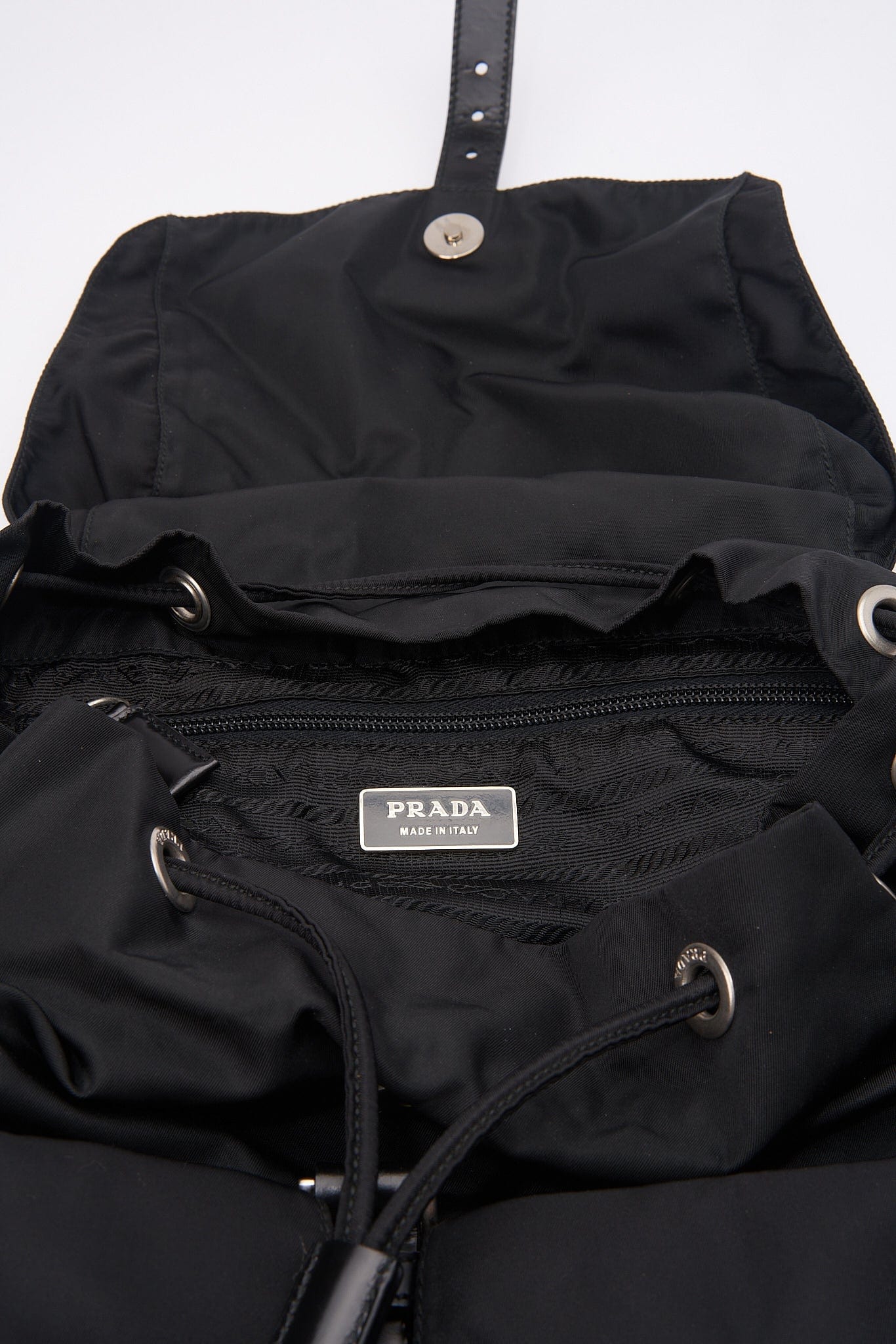 When Prada released its original nylon backpack in 1984 it was an instant hit. This nylon backpack with a modern, minimalist design is decorated with the Prada enamel triangle logo. Underneath the flap with a leather strap and buckle, is a drawstring closure.