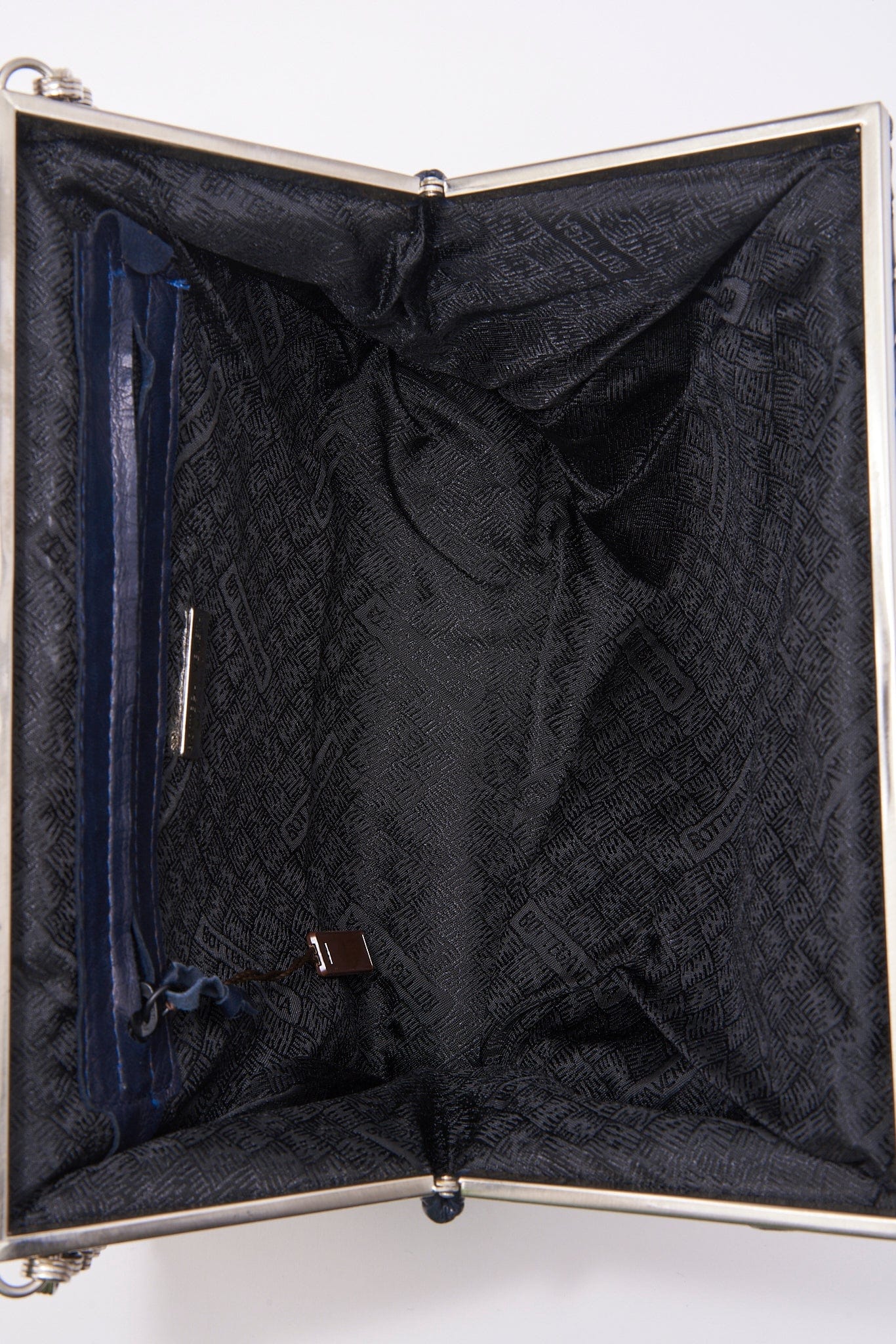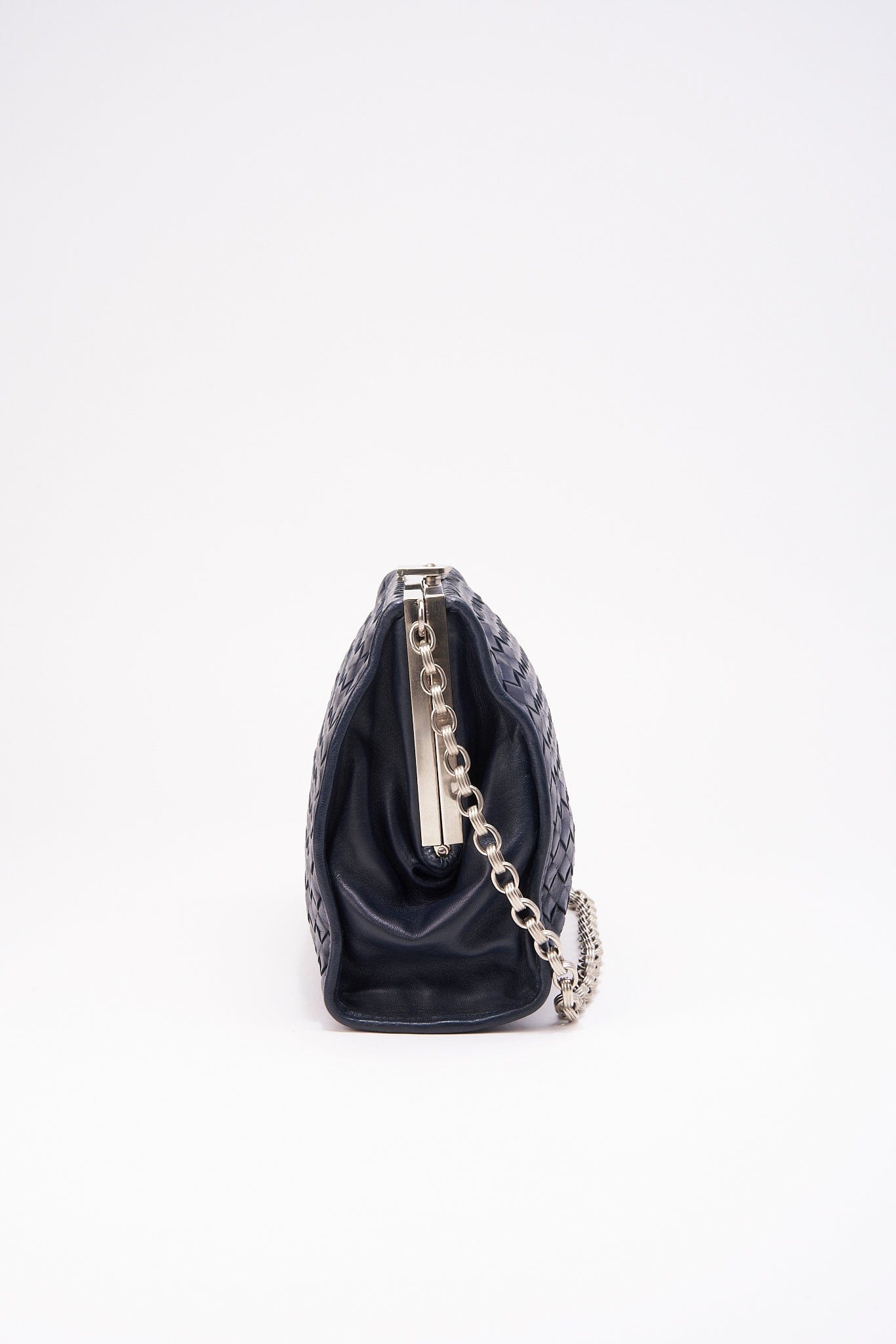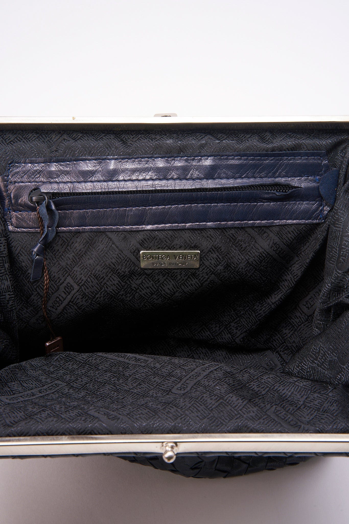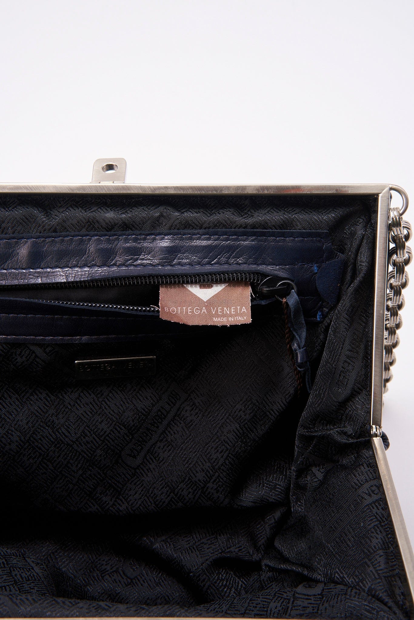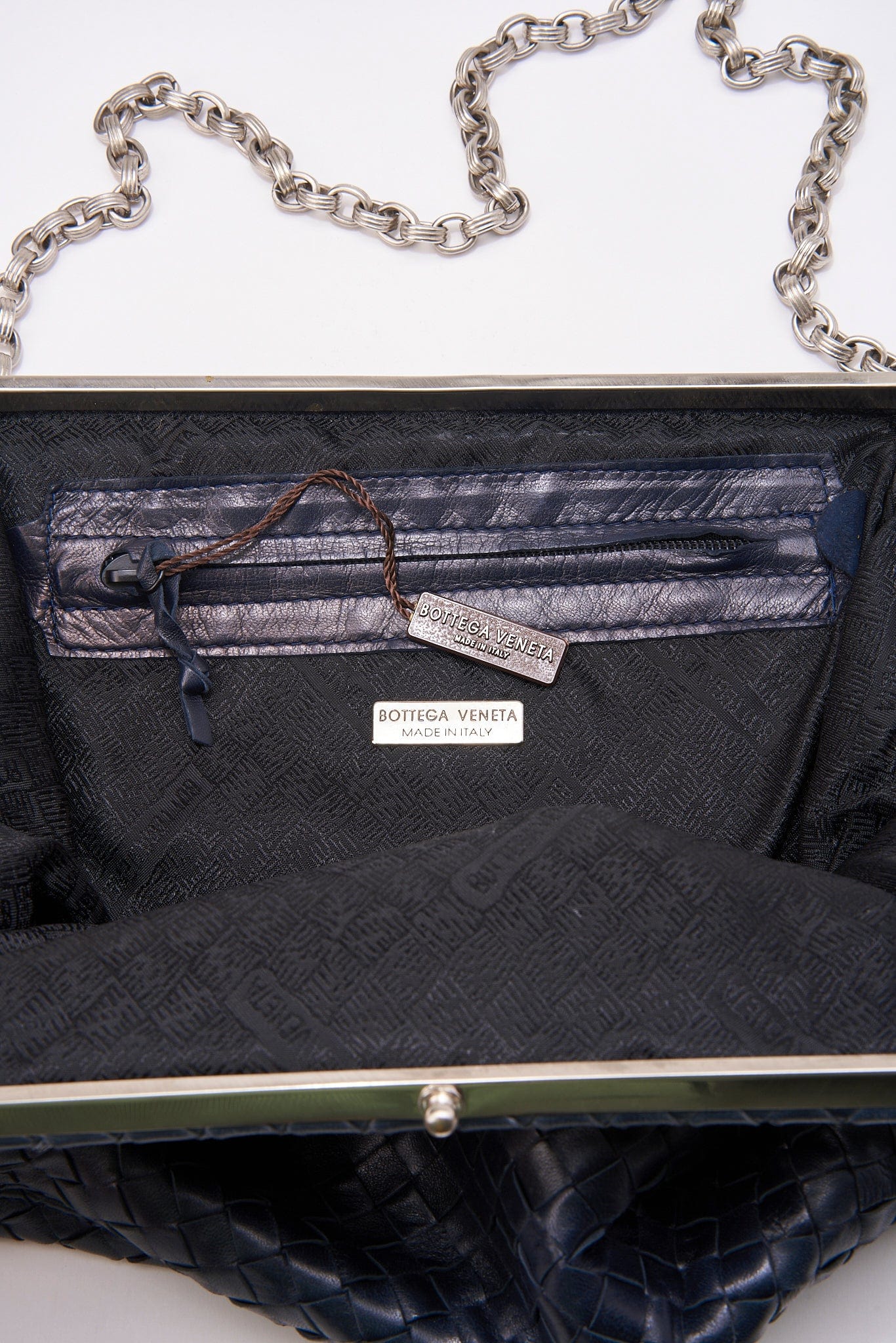 A beautiful vintage navy Bottega Veneta Intrecciato Leather bag with silver chain shoulder strap and silver hard frame closure to bag.