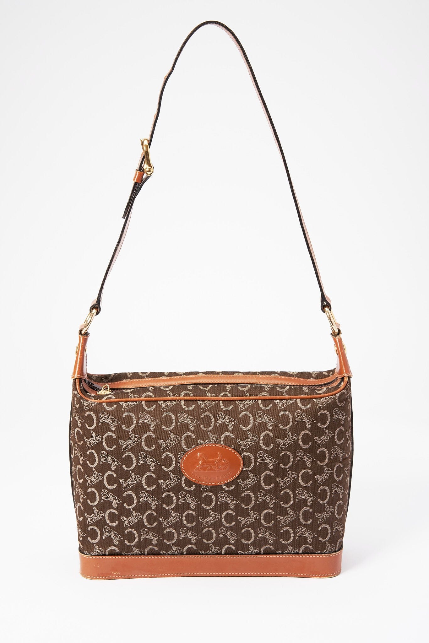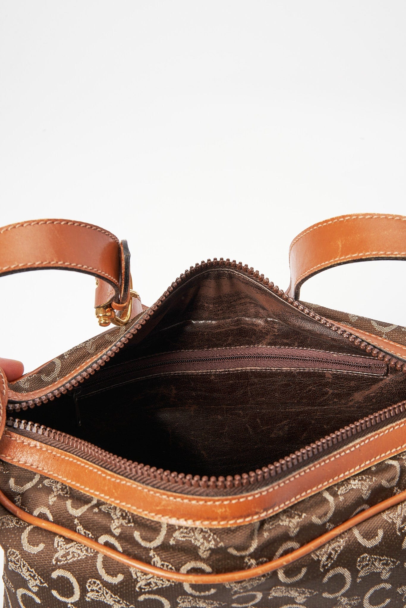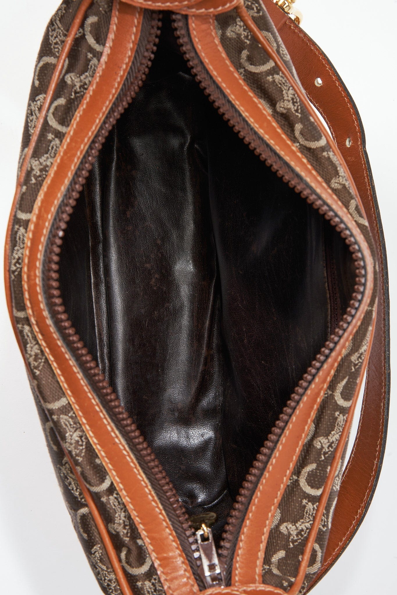A stunning vintage Celine bag crafted from brown canvas, tan leather trim with gold hardware.