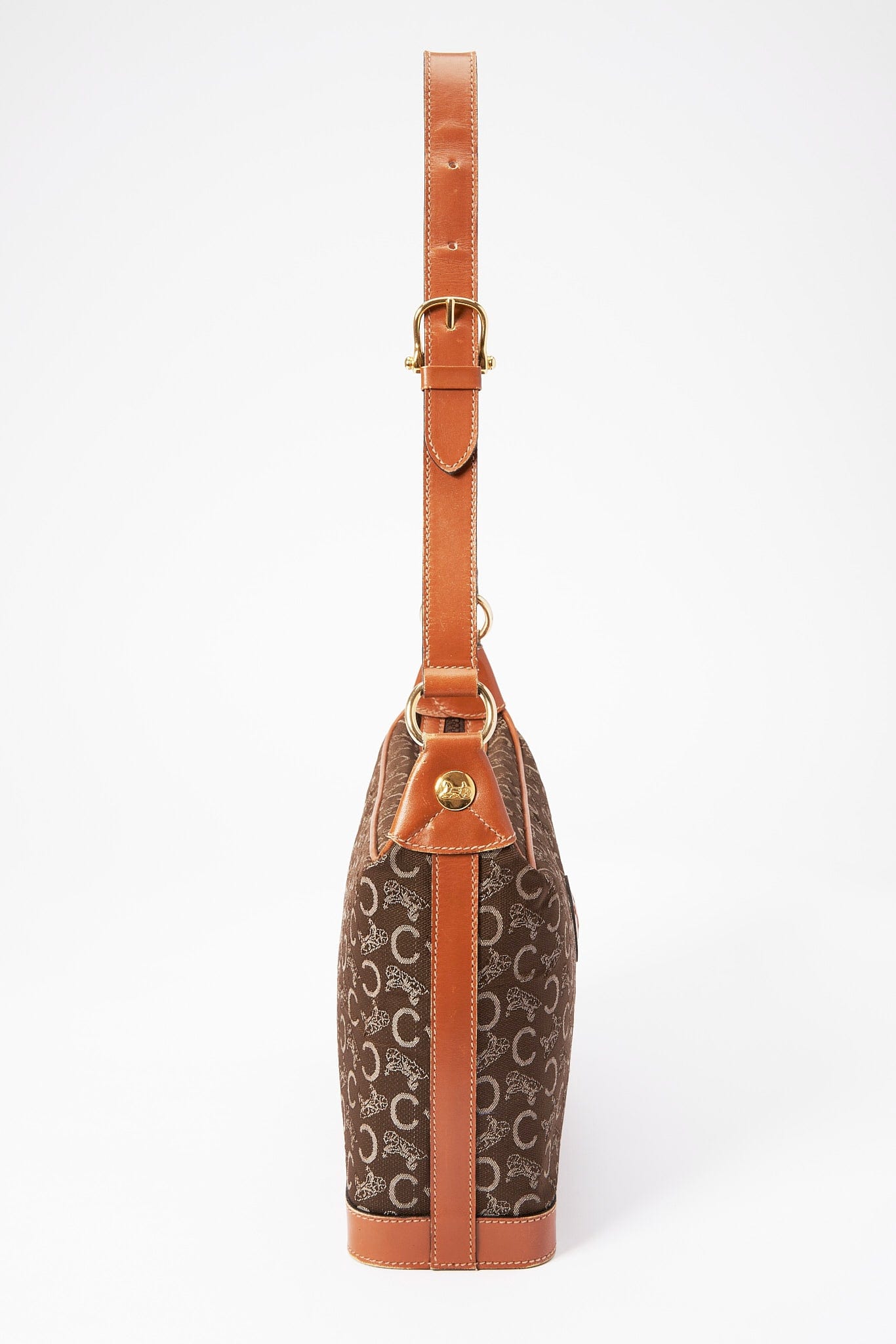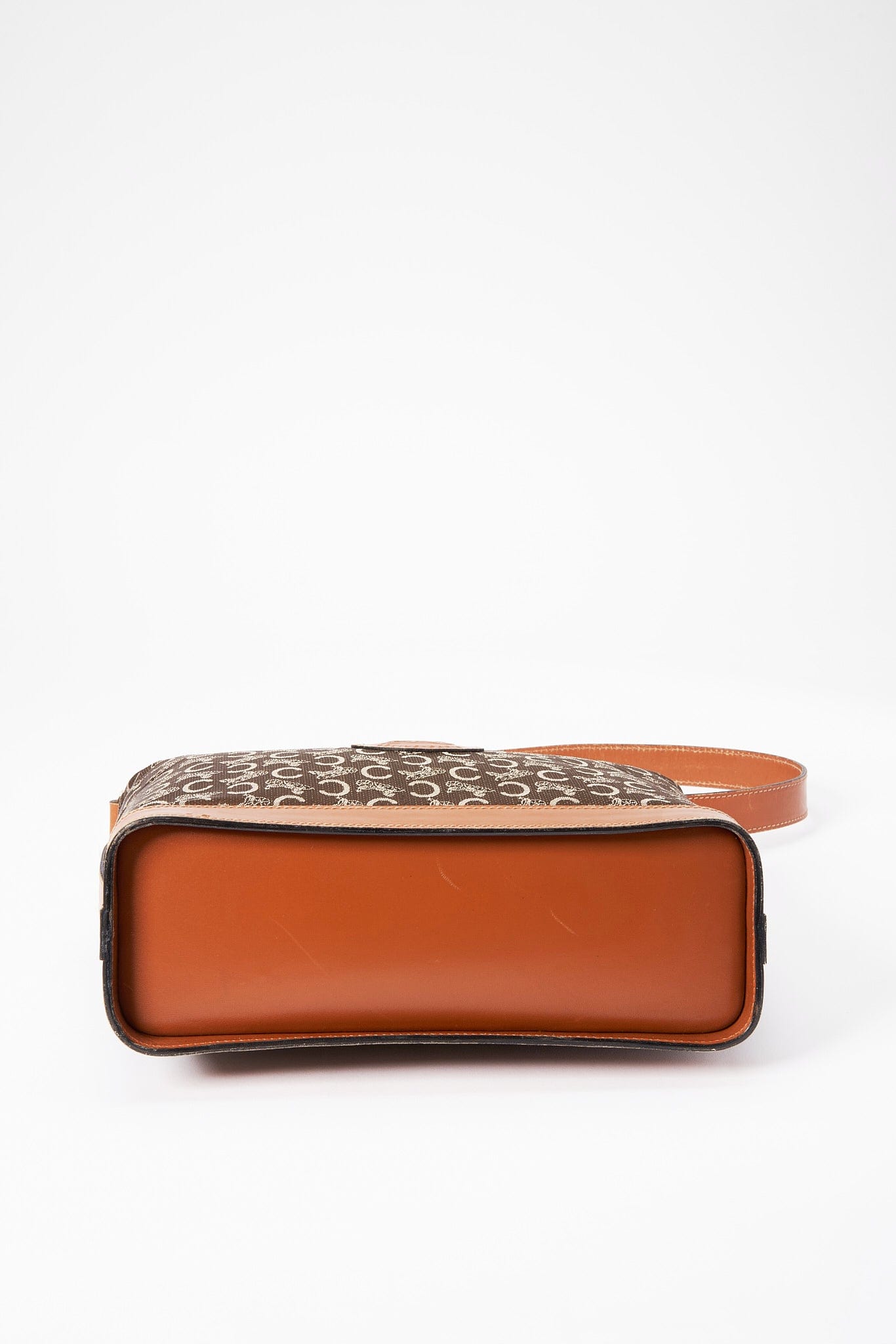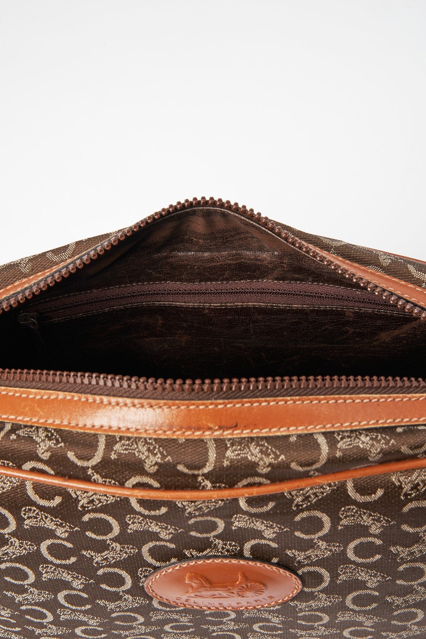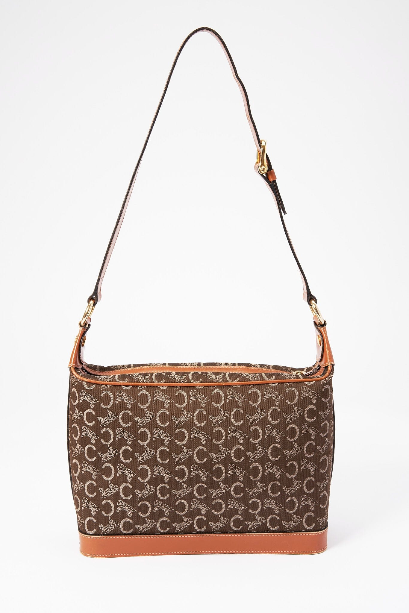 A stunning vintage Celine bag crafted from brown canvas, tan leather trim with gold hardware.