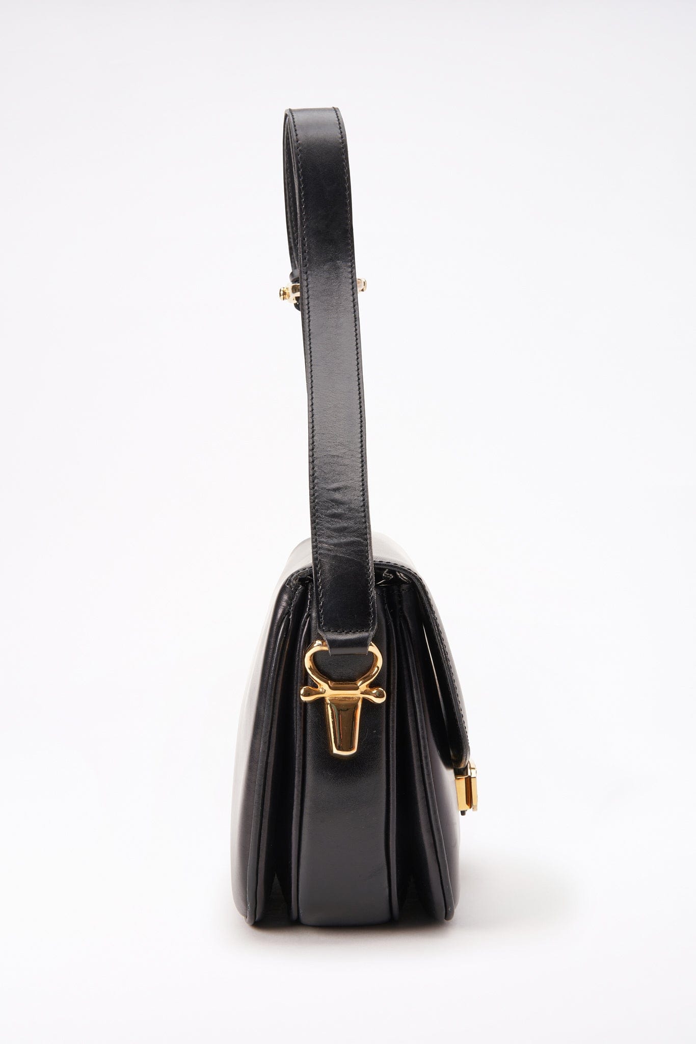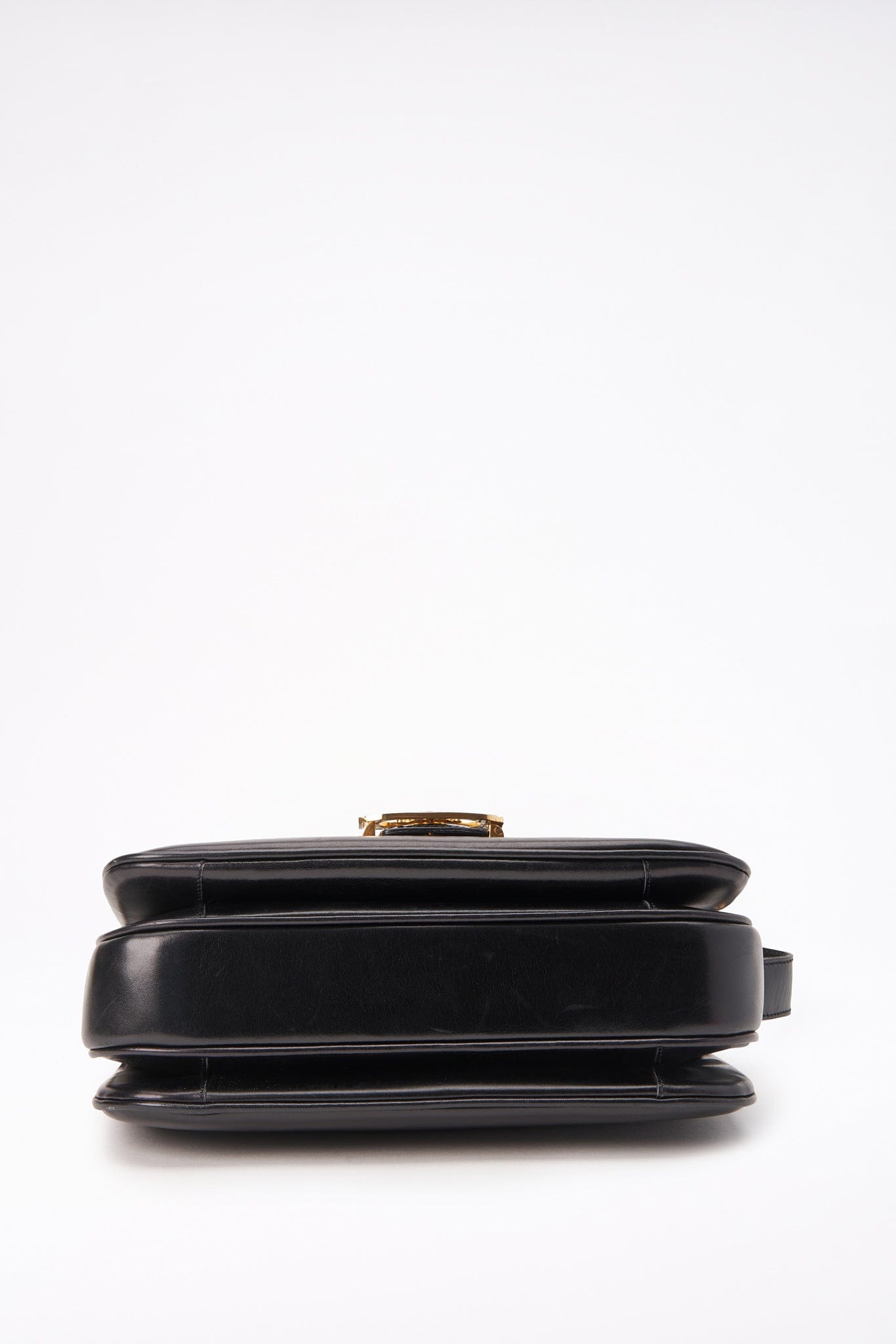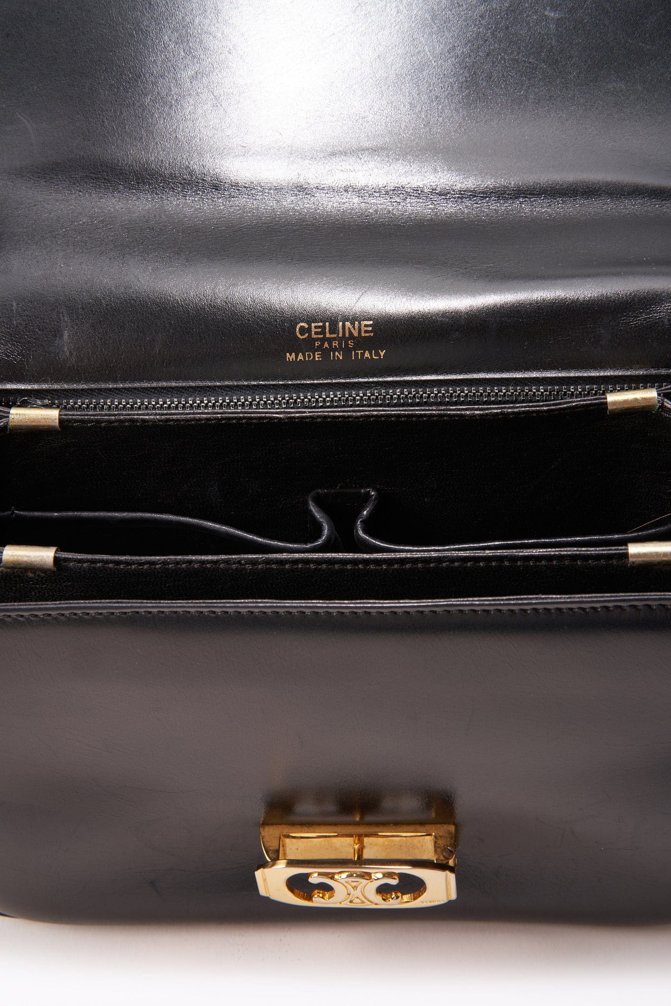 A stunning vintage Celine Triomphe box bag crafted from smooth black leather with a gold Triomphe logo clasp.