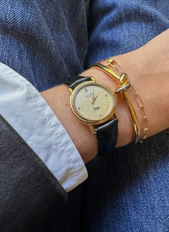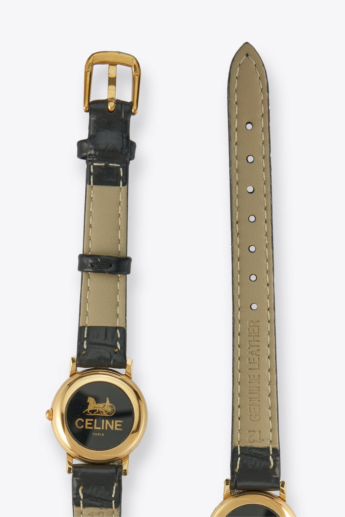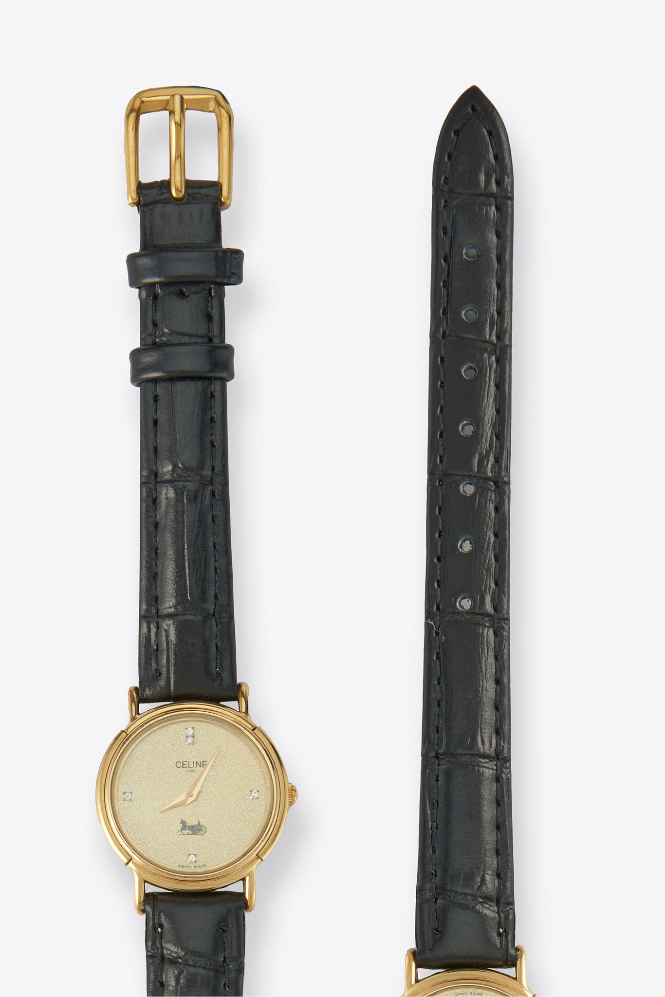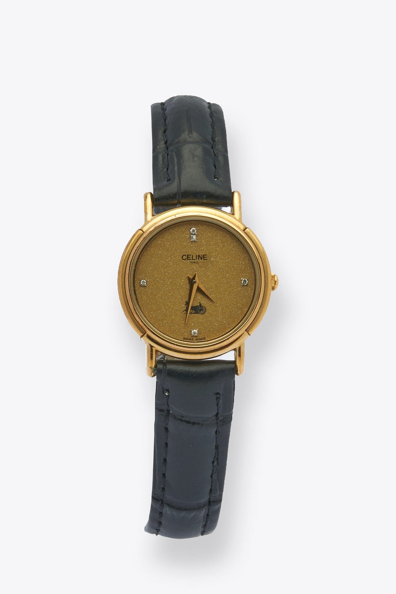 A super chic gold-plated Celine vintage watch, with a black leather strap and 5 diamonds on the dial.