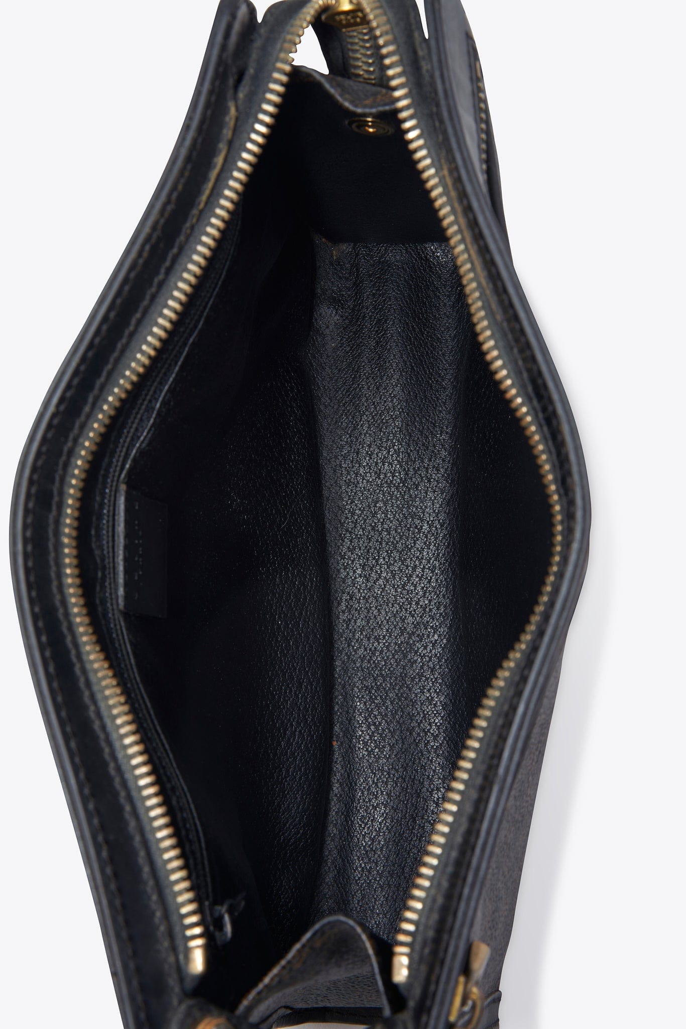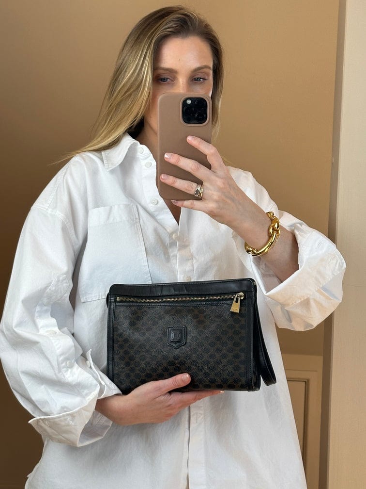 A stunning vintage Celine clutch bag crafted from brown and black Macadam canvas, black leather trim with gold hardware.