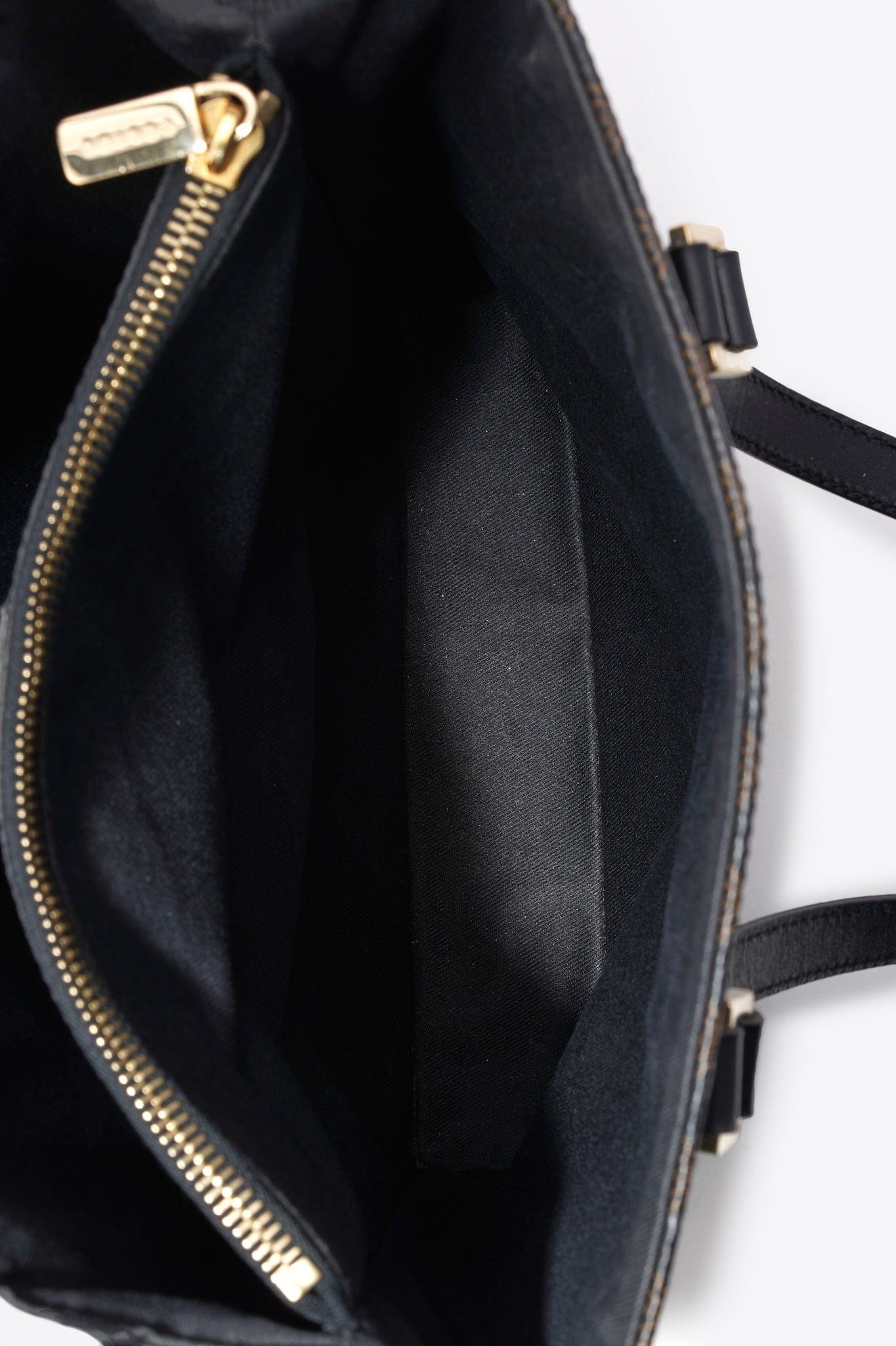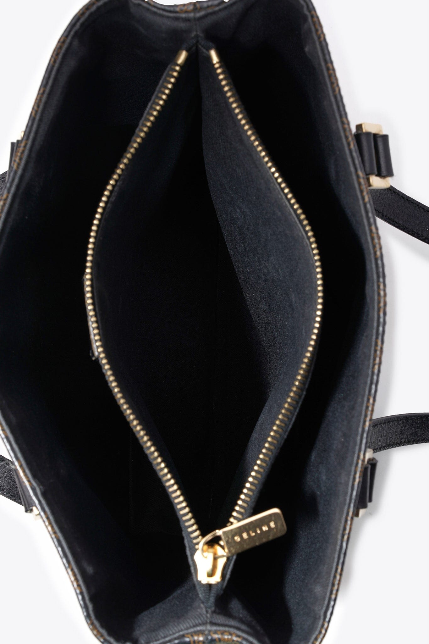 A stunning vintage Celine tote bag crafted from brown and black Macadam canvas, black leather trim with gold hardware.