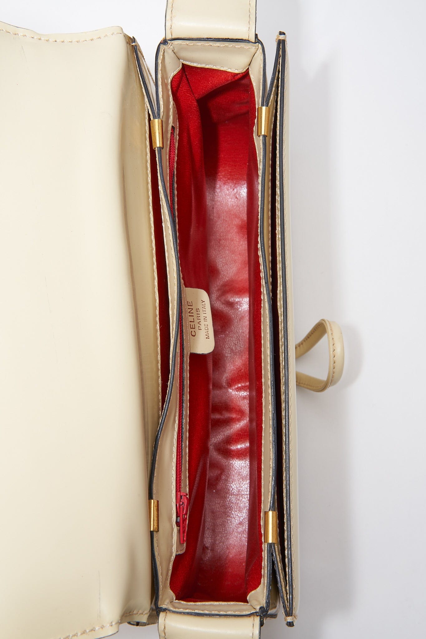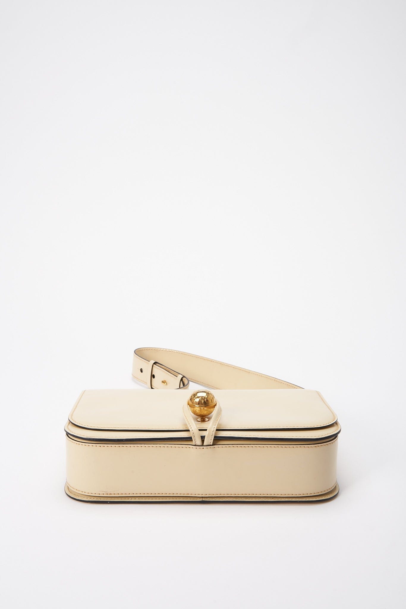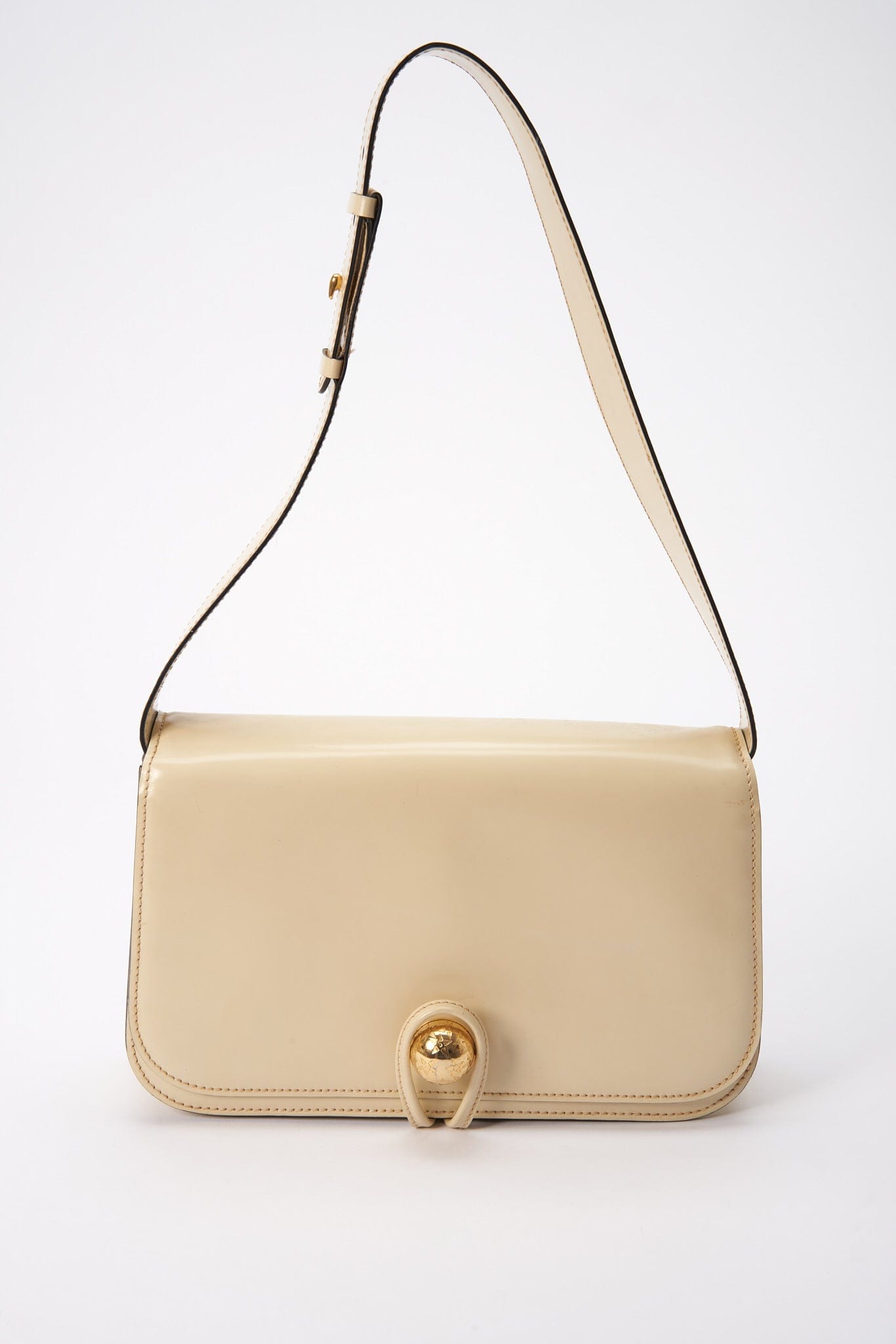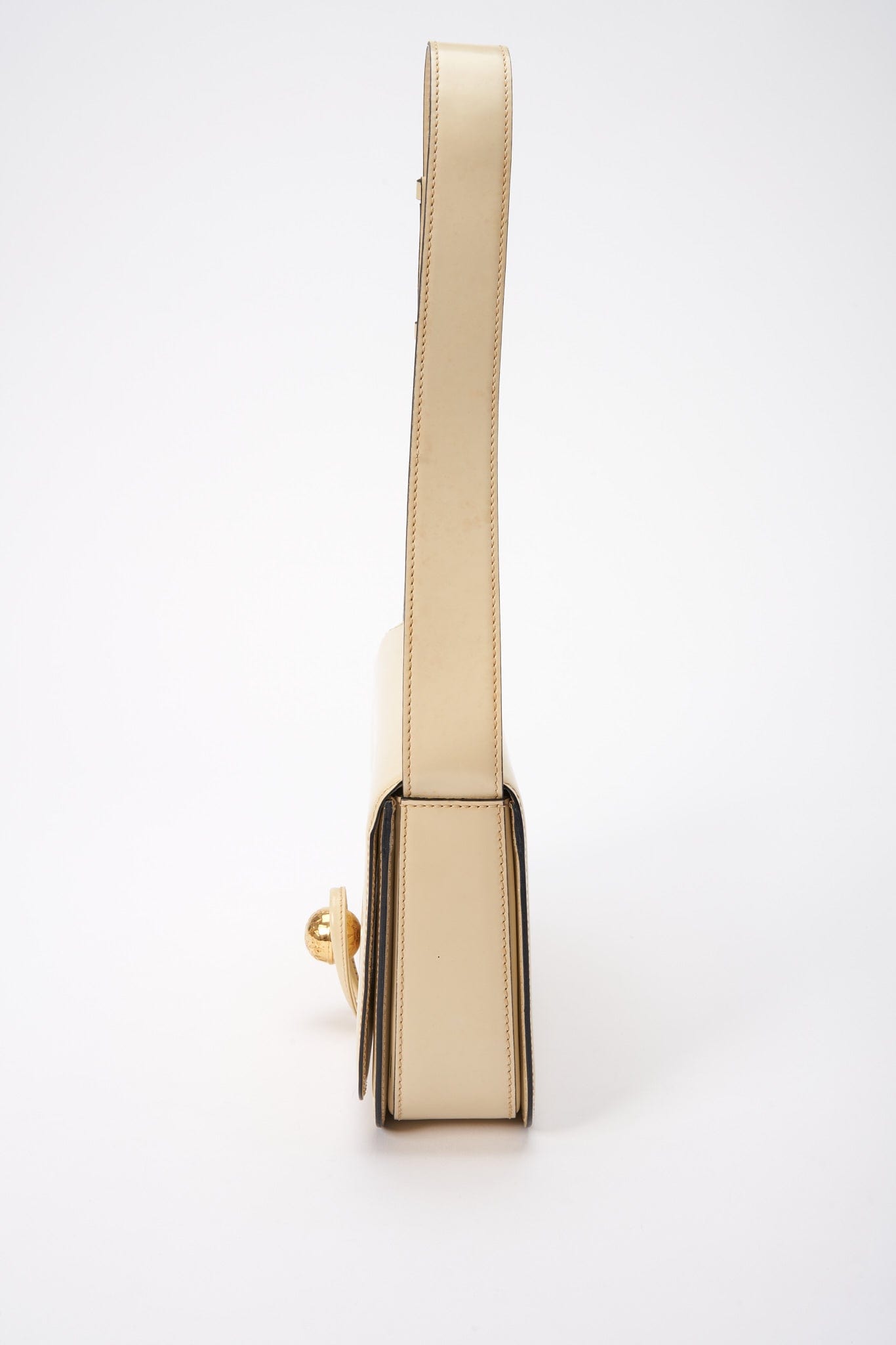 A stunning vintage Celine shoulder box bag crafted from a super smooth cream leather with gold Celine branded hardware. The feature of this bag is the incredible ball closure, a rare and special Celine item.