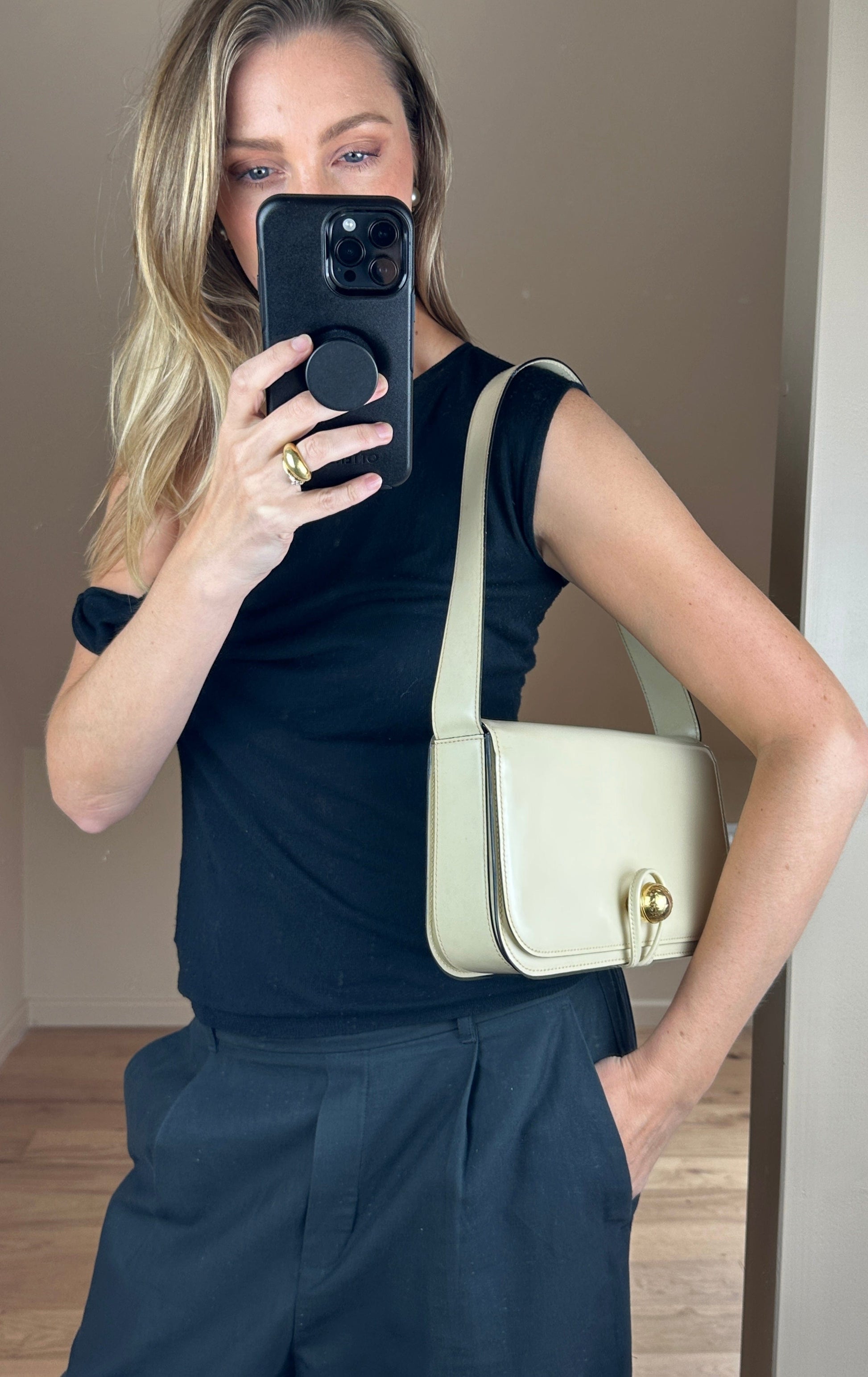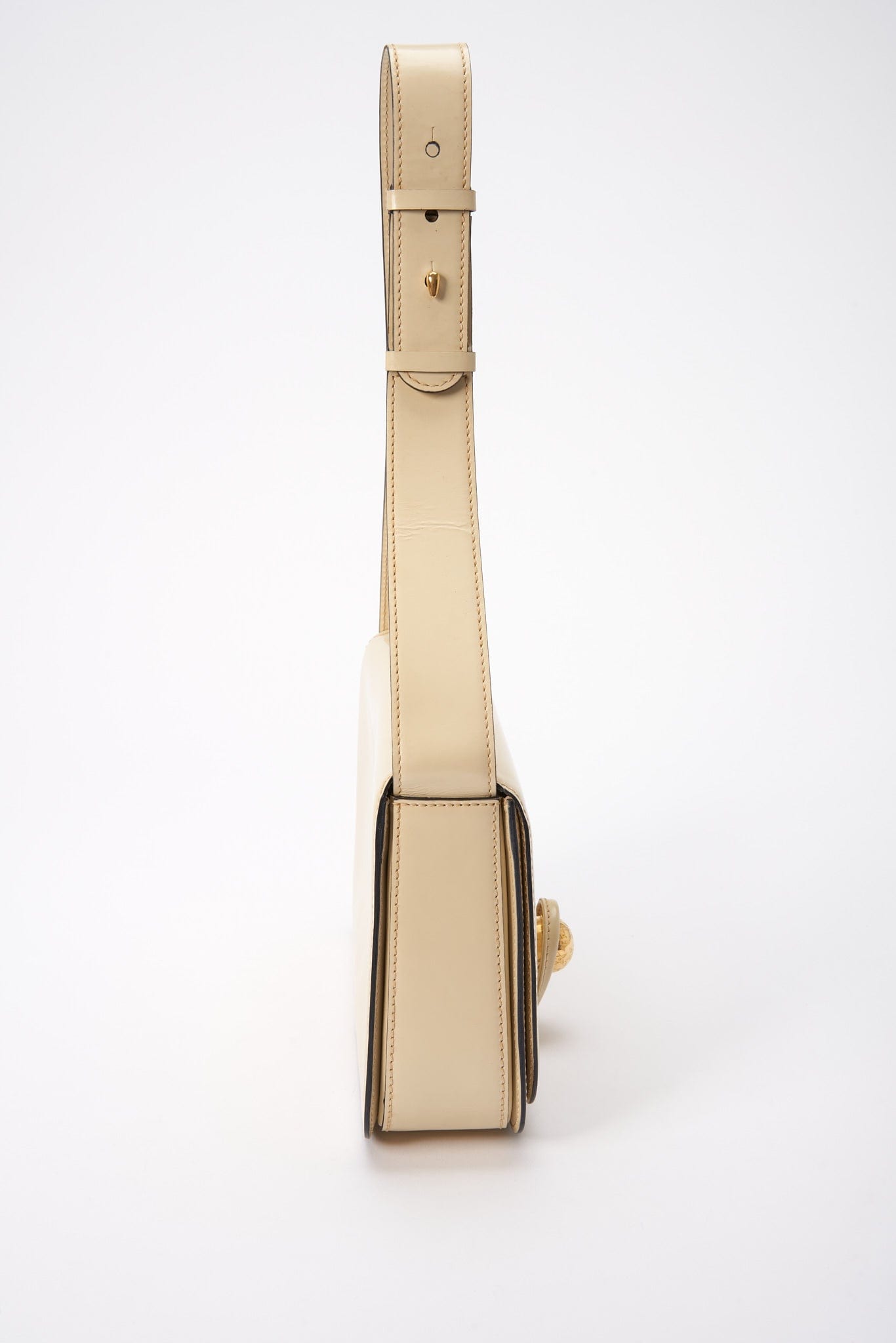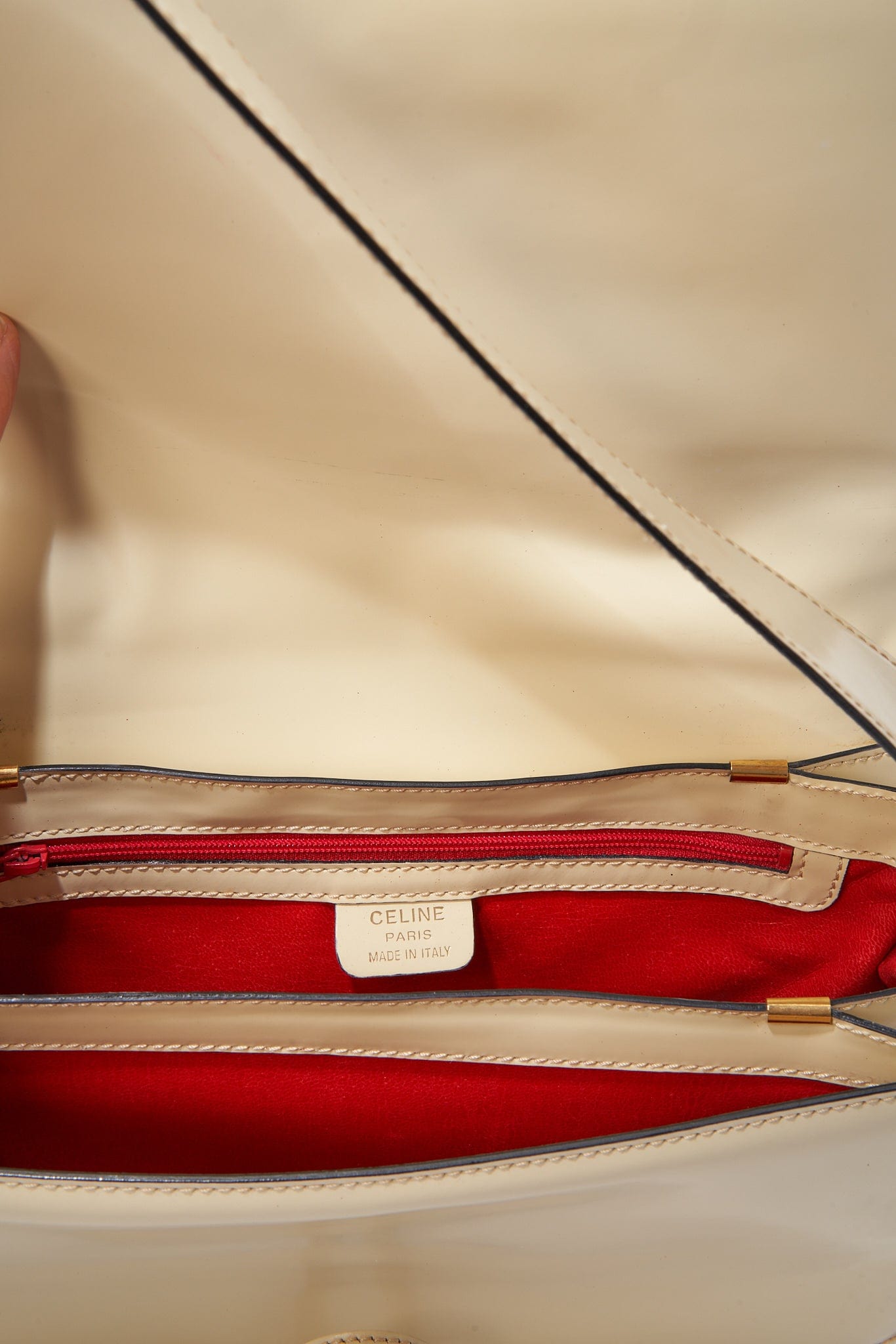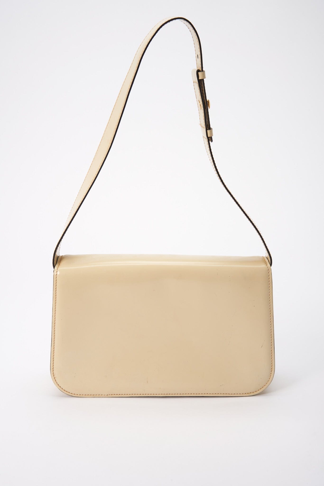 A stunning vintage Celine shoulder box bag crafted from a super smooth cream leather with gold Celine branded hardware. The feature of this bag is the incredible ball closure, a rare and special Celine item.