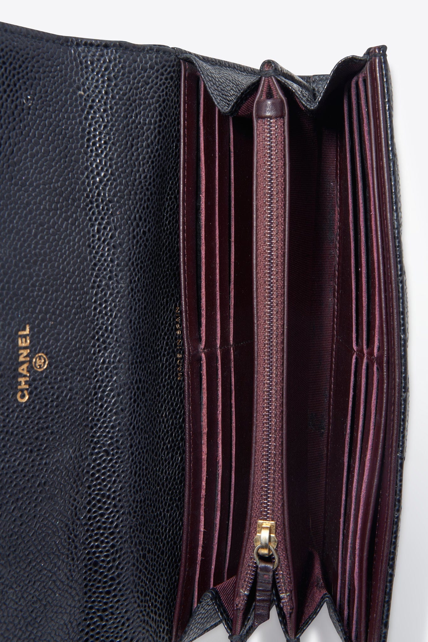 This beautiful vintage Chanel wallet is crafted from black caviar leather with gold hardware.