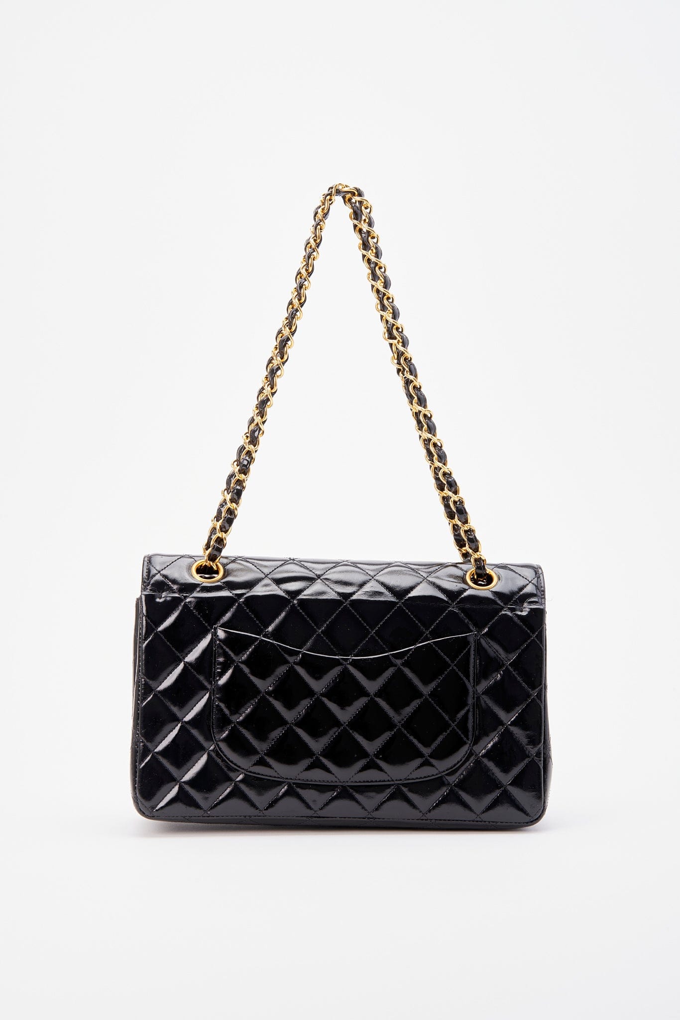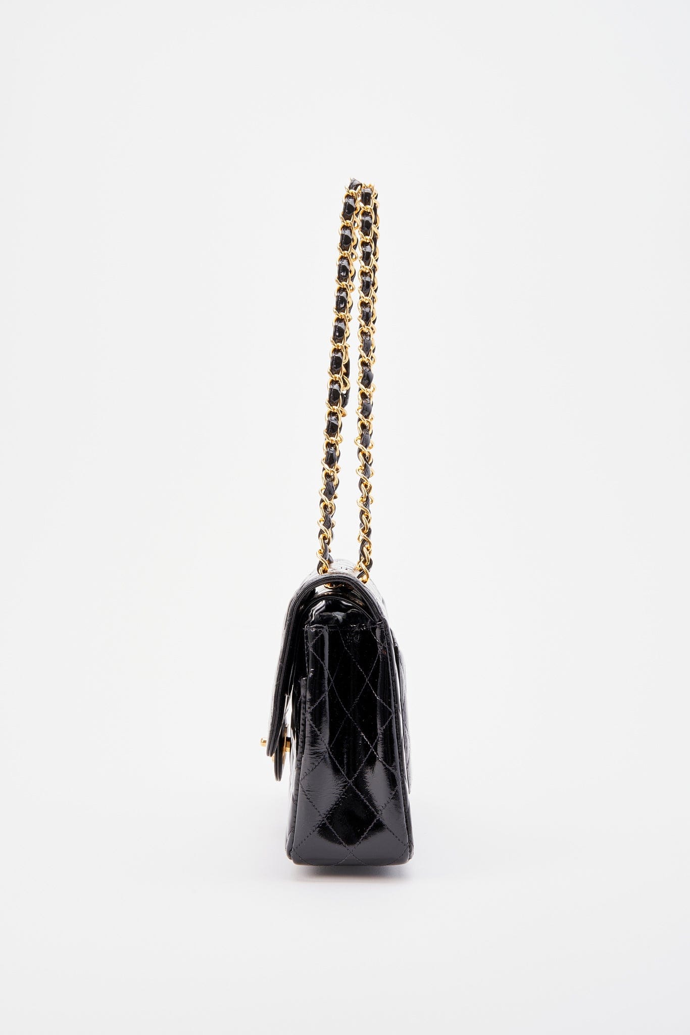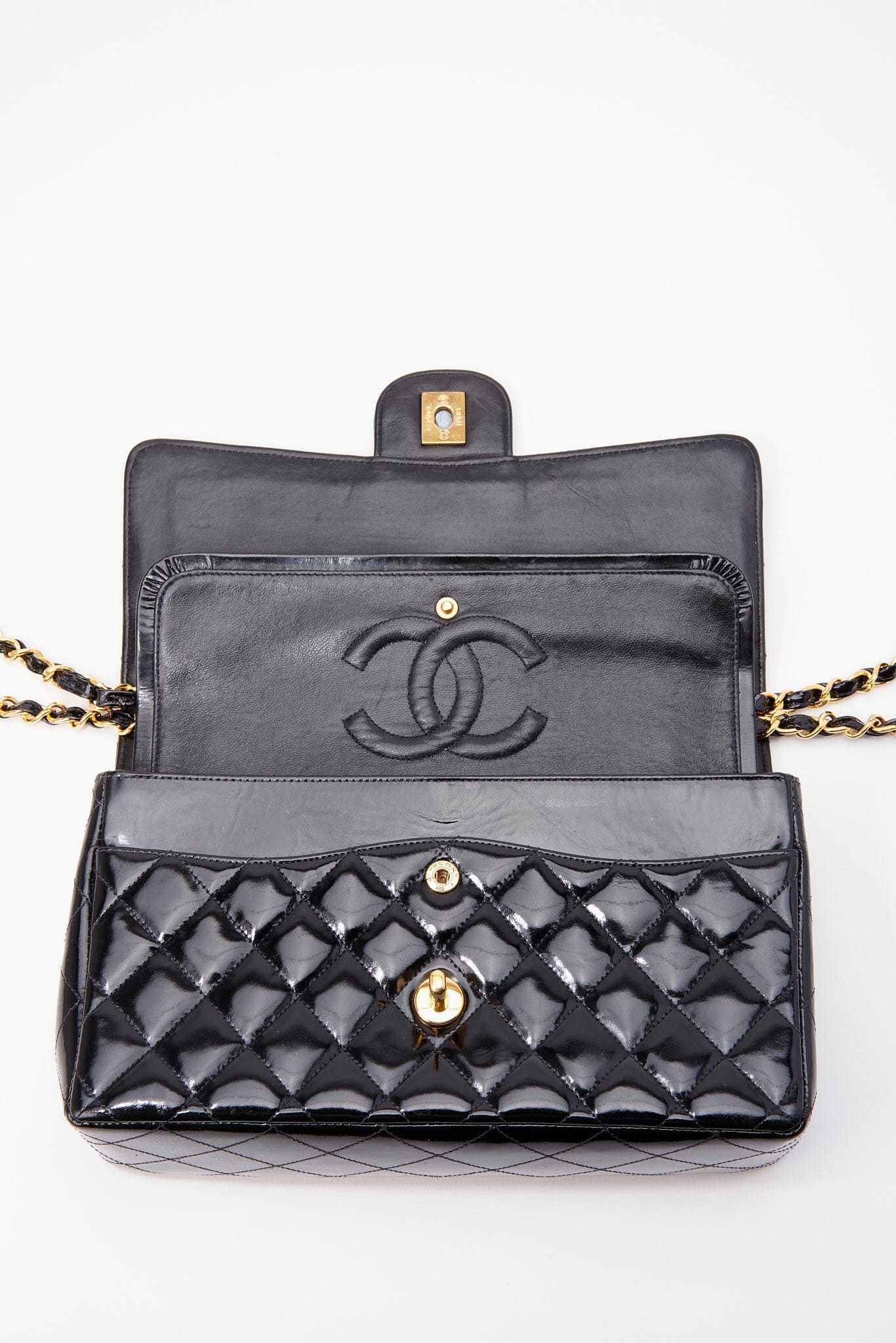 Vintage Chanel Classic Double Flap Bag Medium Black Patent Leather With 24K Gold Plated Hardware