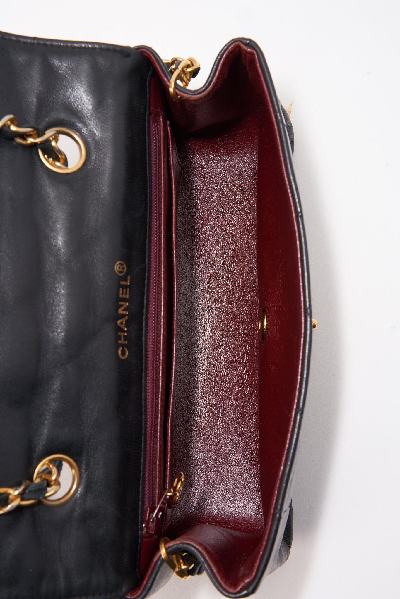 This vintage Chanel Diana Single Flap bag is crafted with black diamond quilted lambskin leather with 24k gold-plated hardware and a single leather-trimmed chain-link shoulder strap. There is a zip and a slip pocket inside this bag plus the interior is lined with maroon leather.