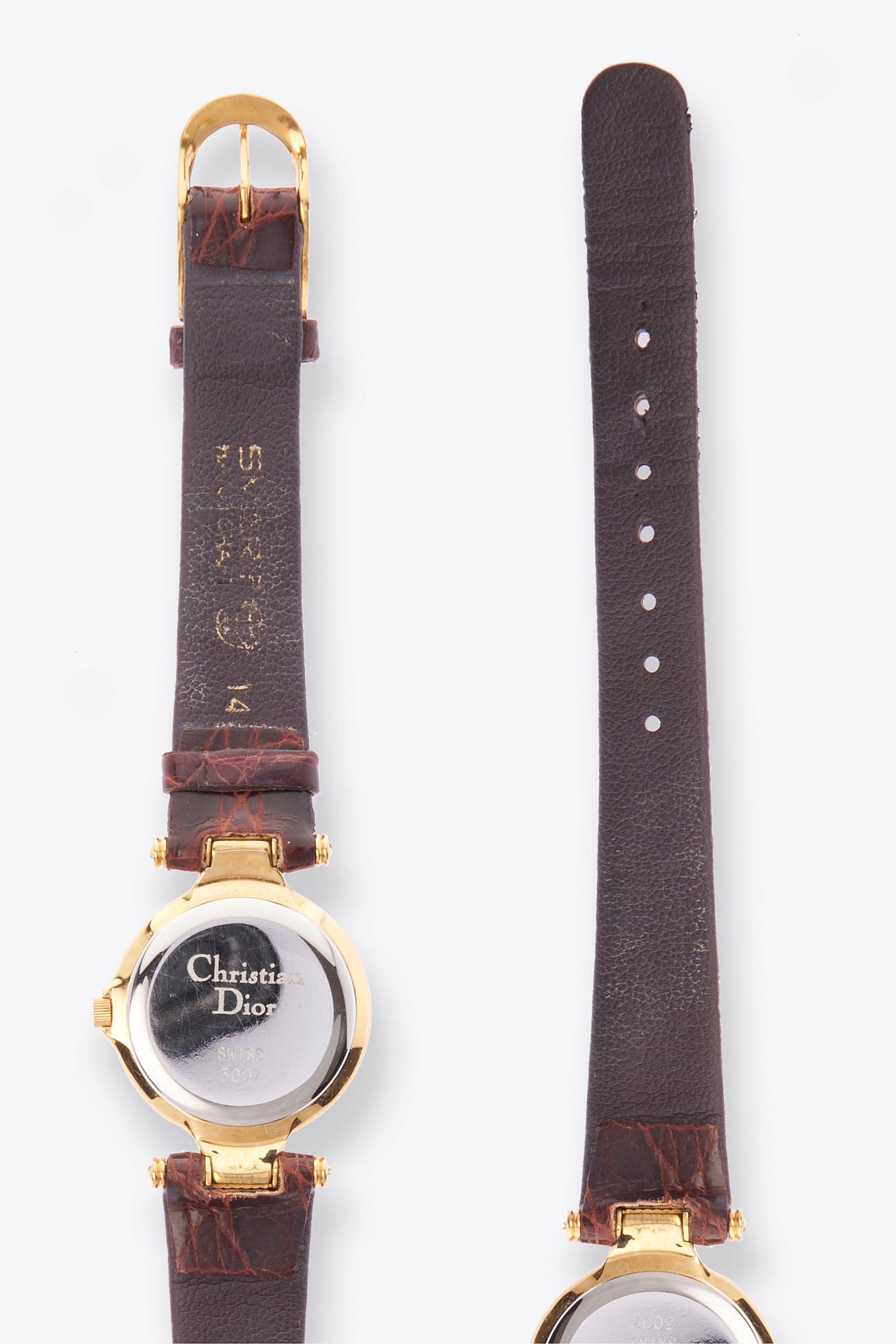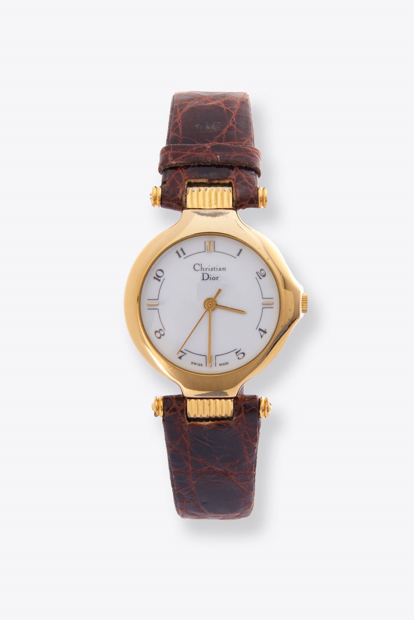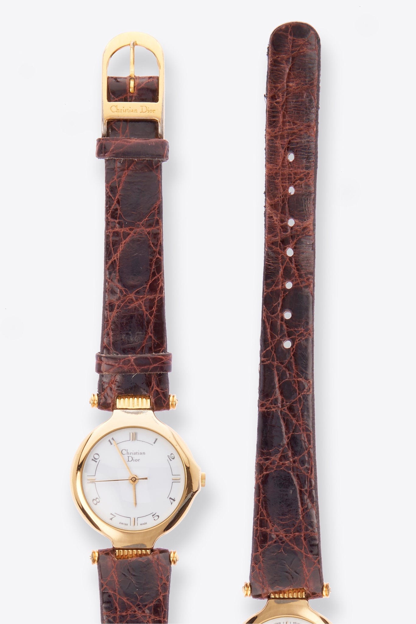 A super chic gold-plated Dior vintage watch, with a brown croc embossed leather strap.