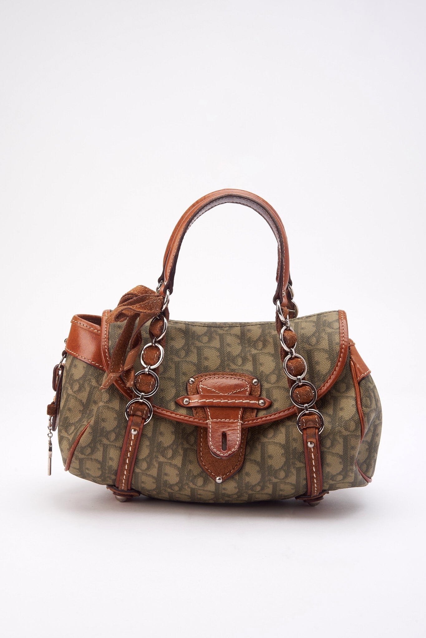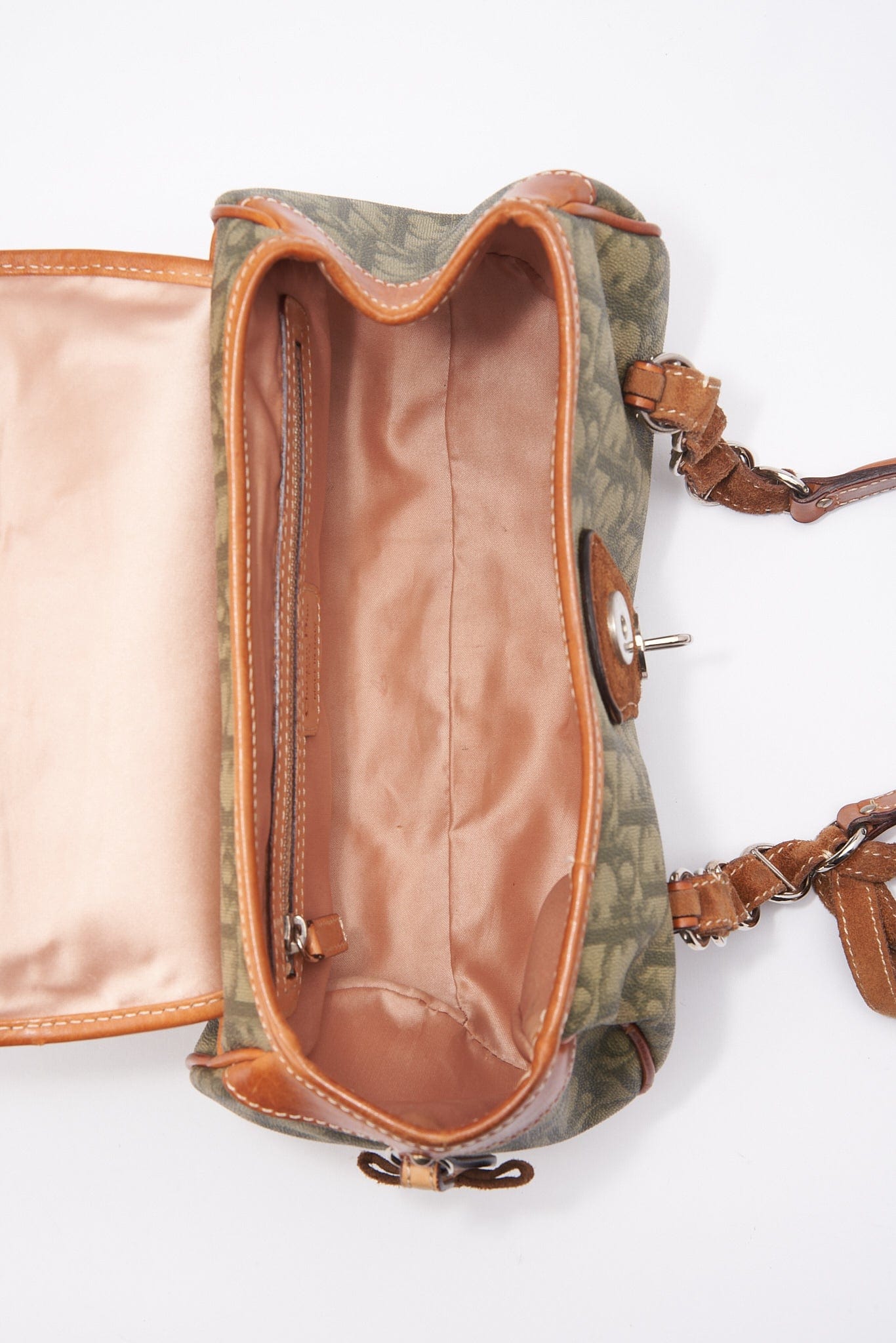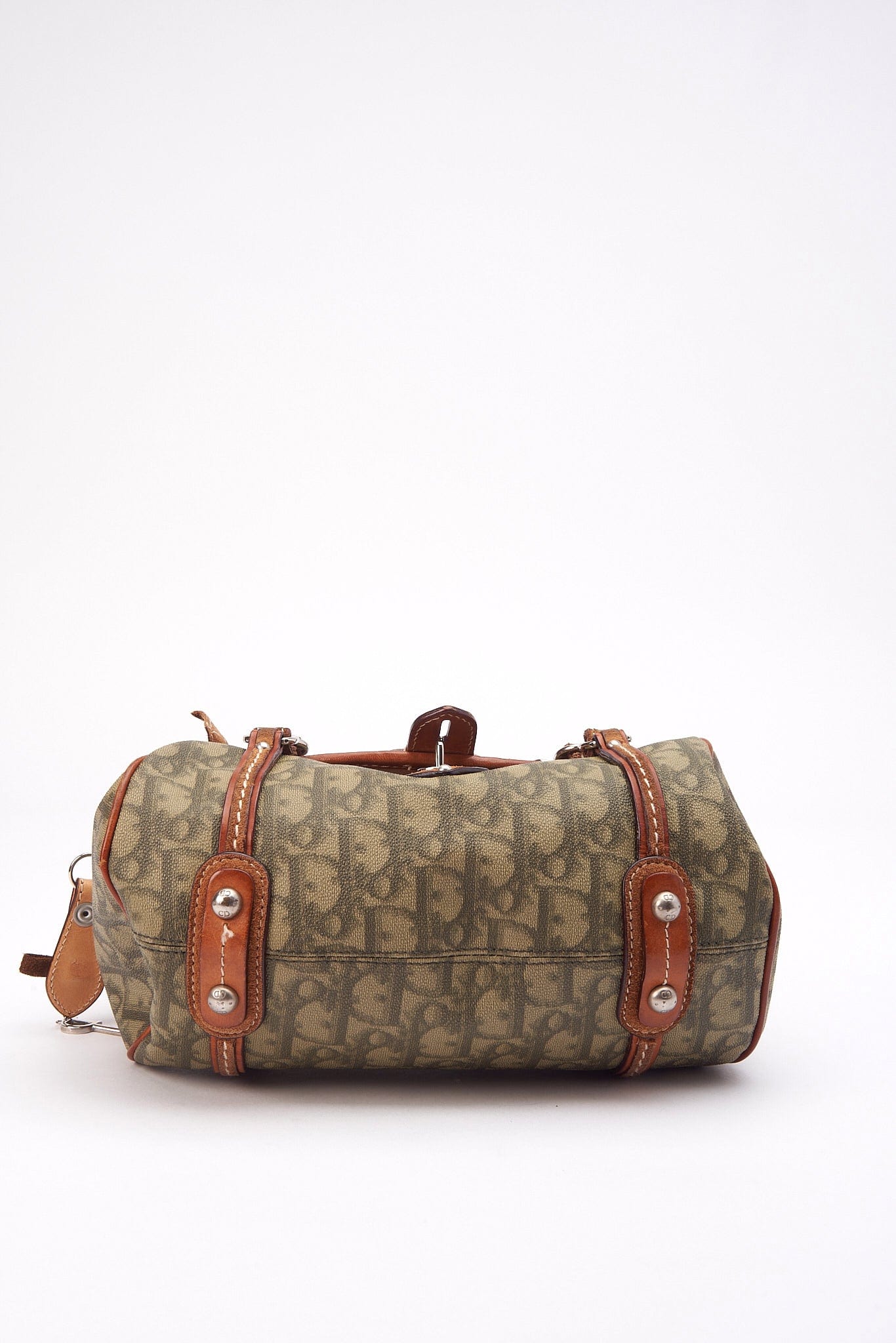A vintage Christian Dior Mini Trotter Romantique bag crafted from a green Dior Oblique canvas with tan leather trim.
