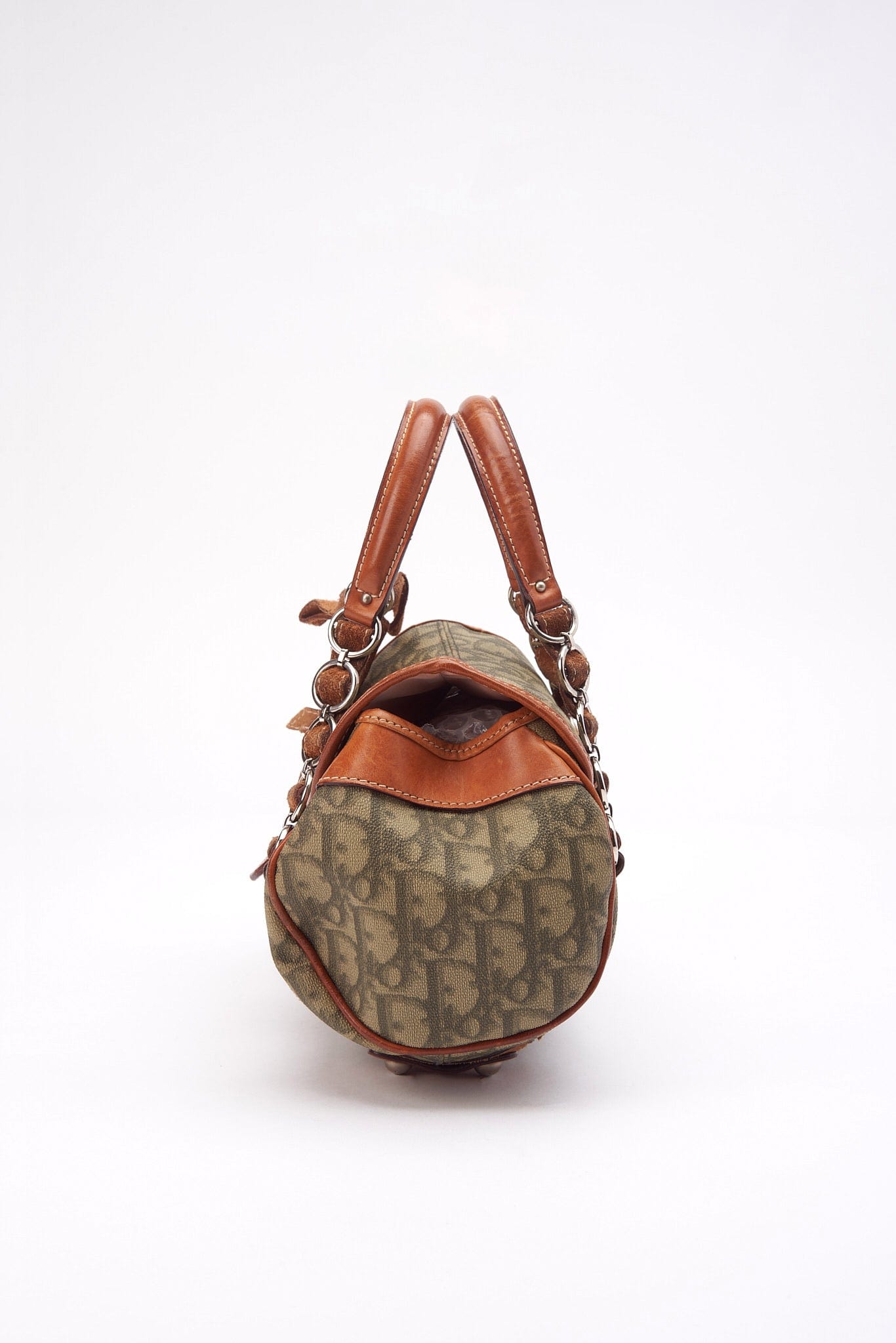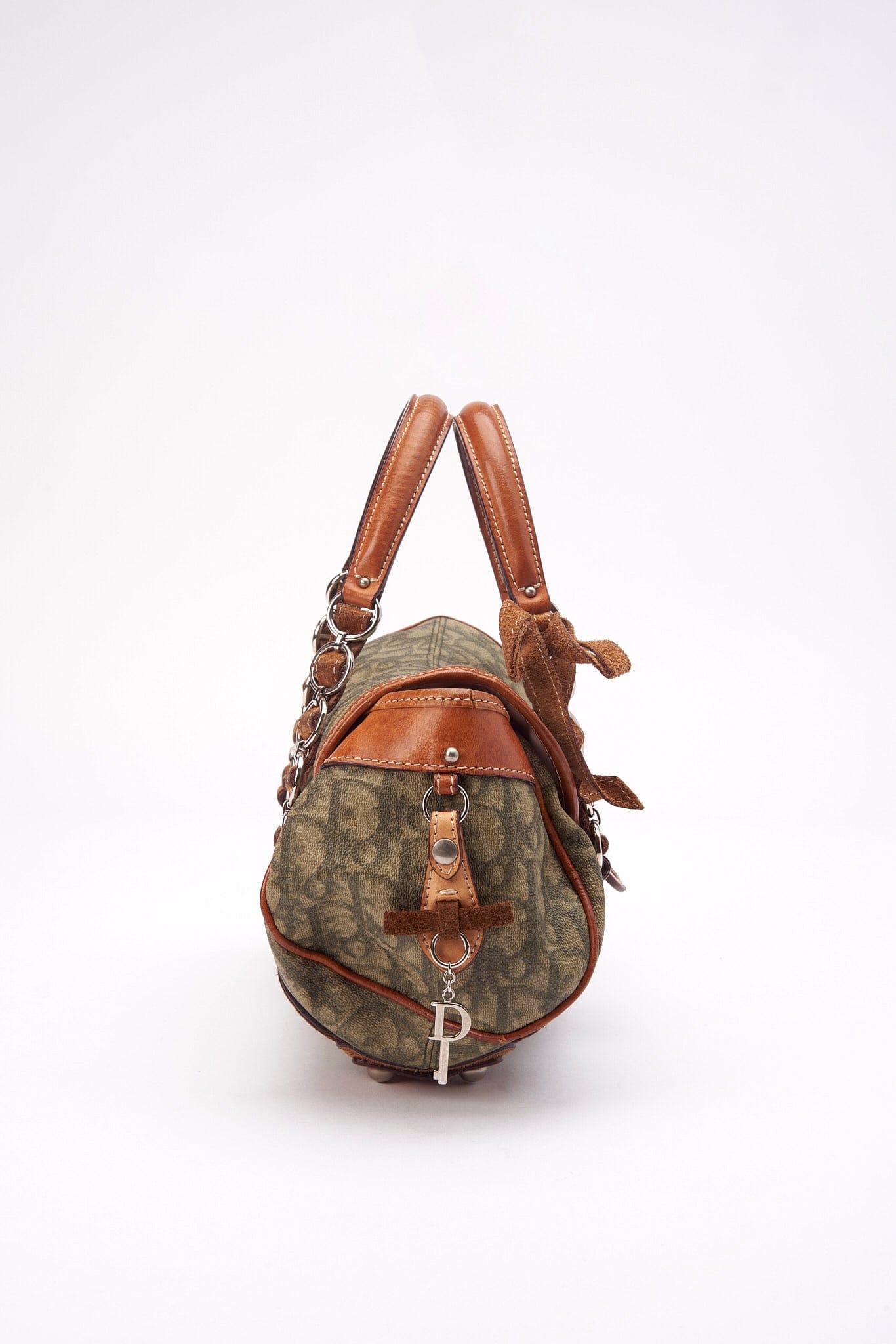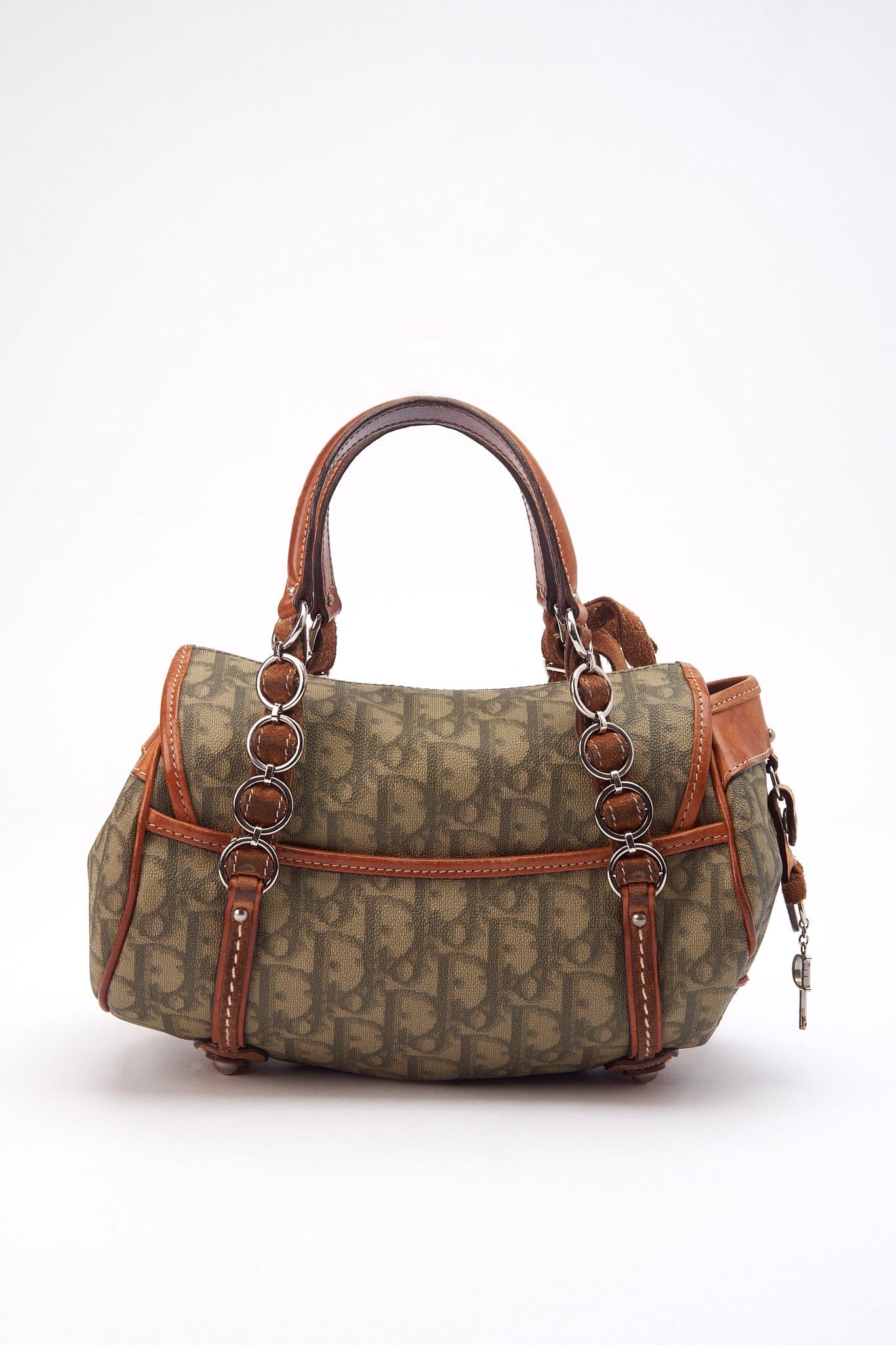 A vintage Christian Dior Mini Trotter Romantique bag crafted from a green Dior Oblique canvas with tan leather trim.