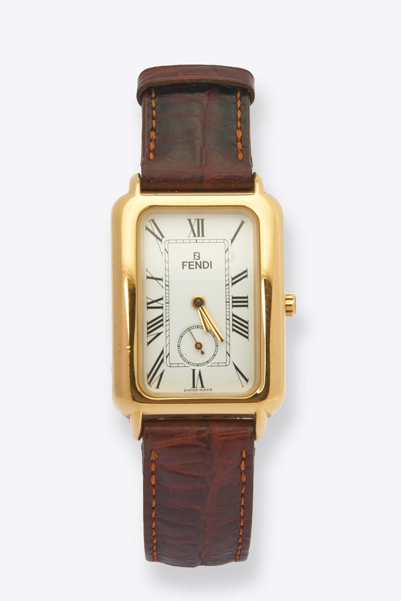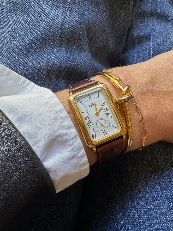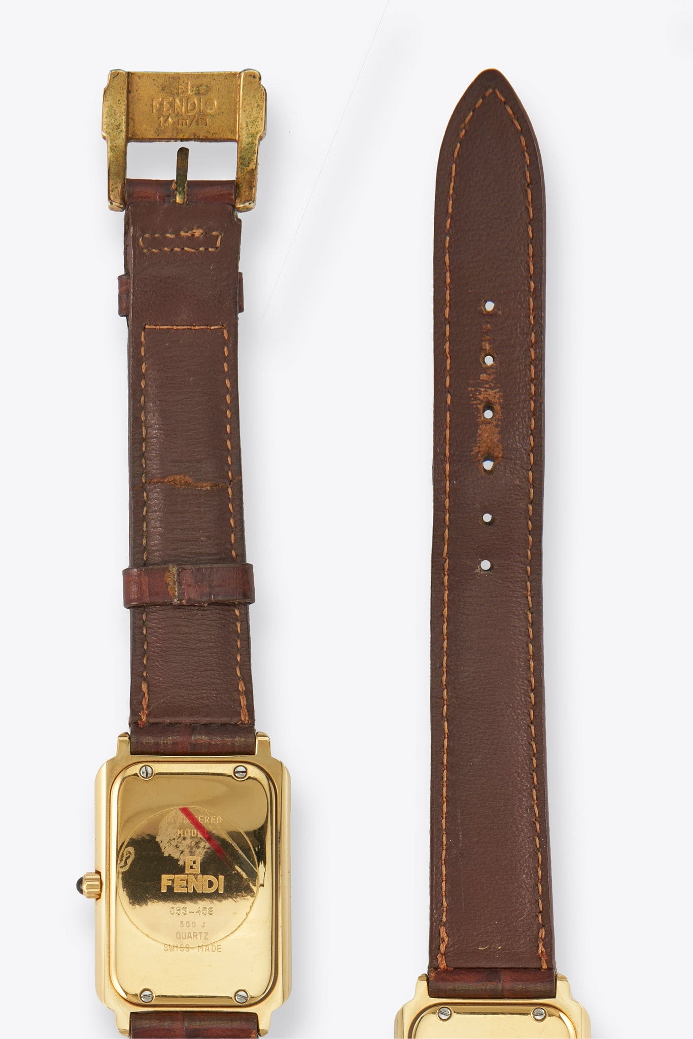 A super chic gold-plated Fendi vintage watch, with brown croc embossed leather strap.