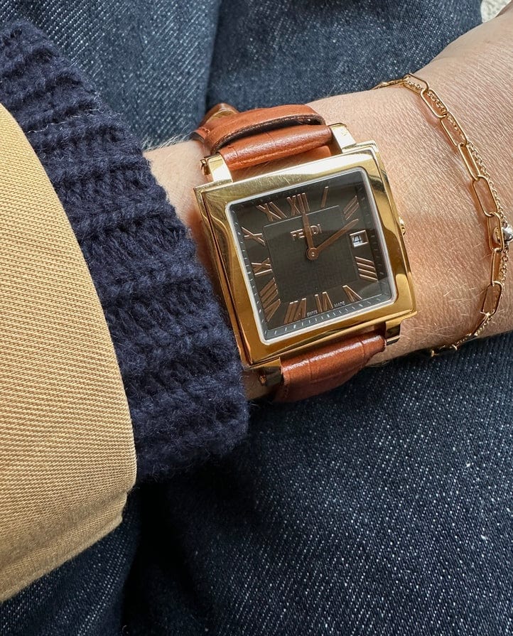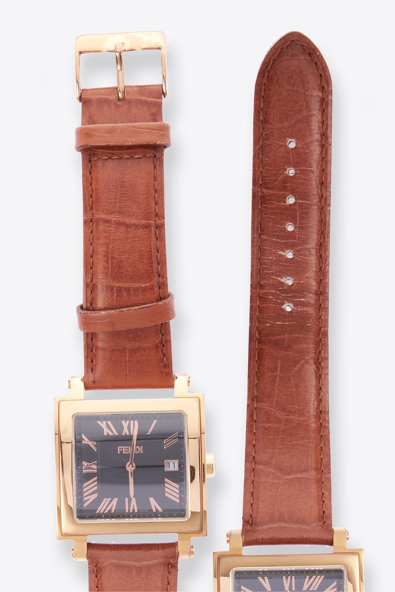 A super chic gold-plated Fendi vintage watch, with a tan croc embossed leather strap.