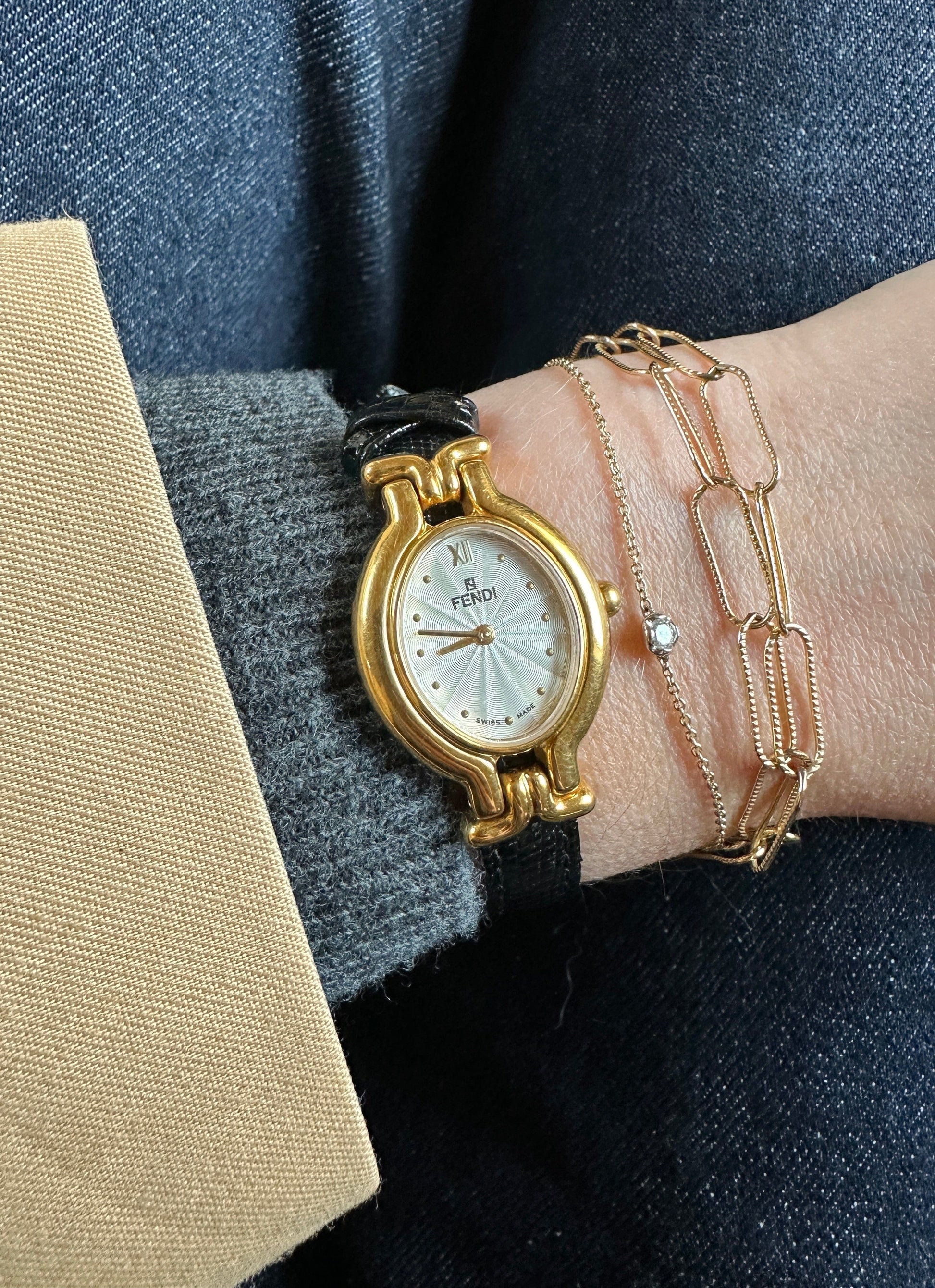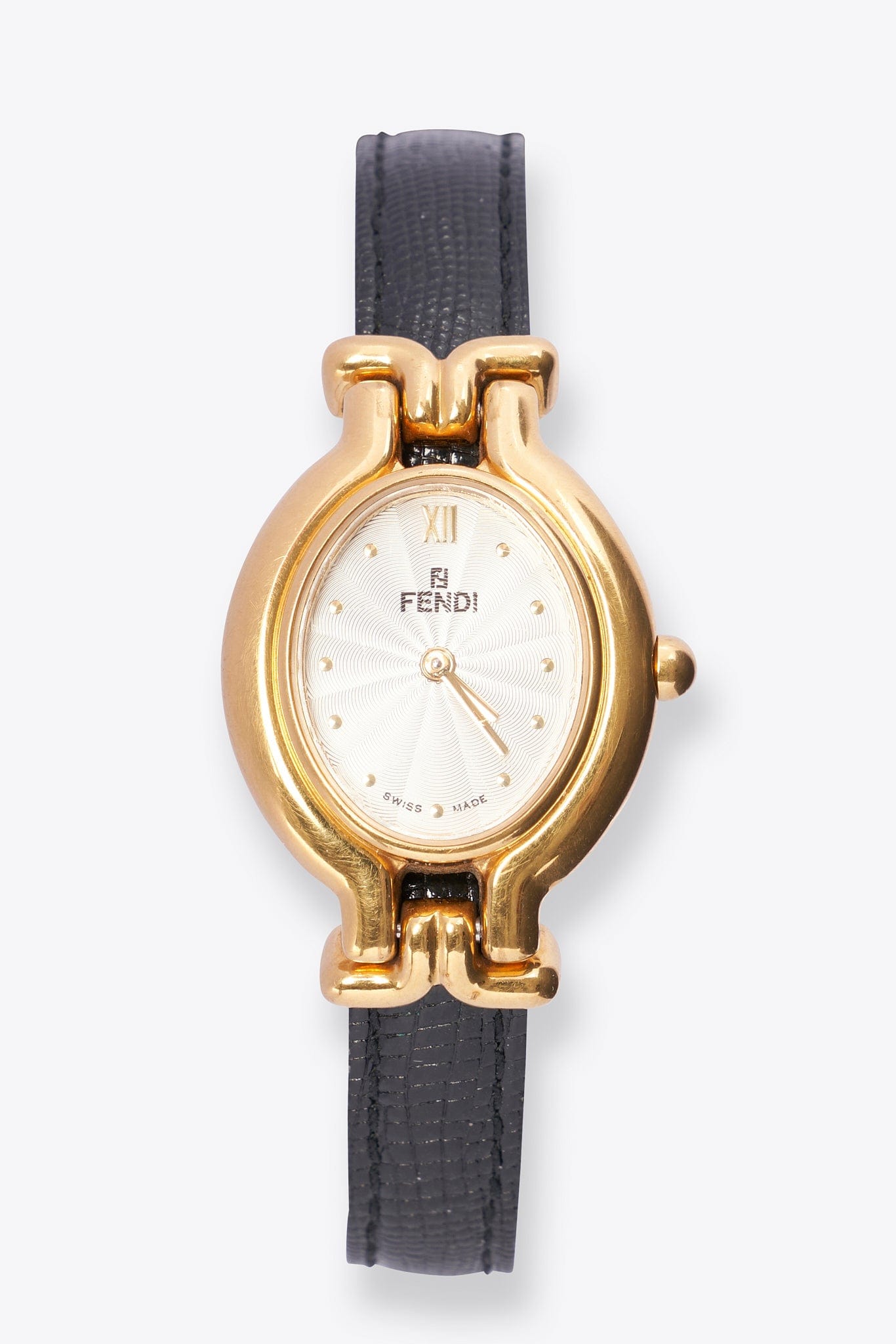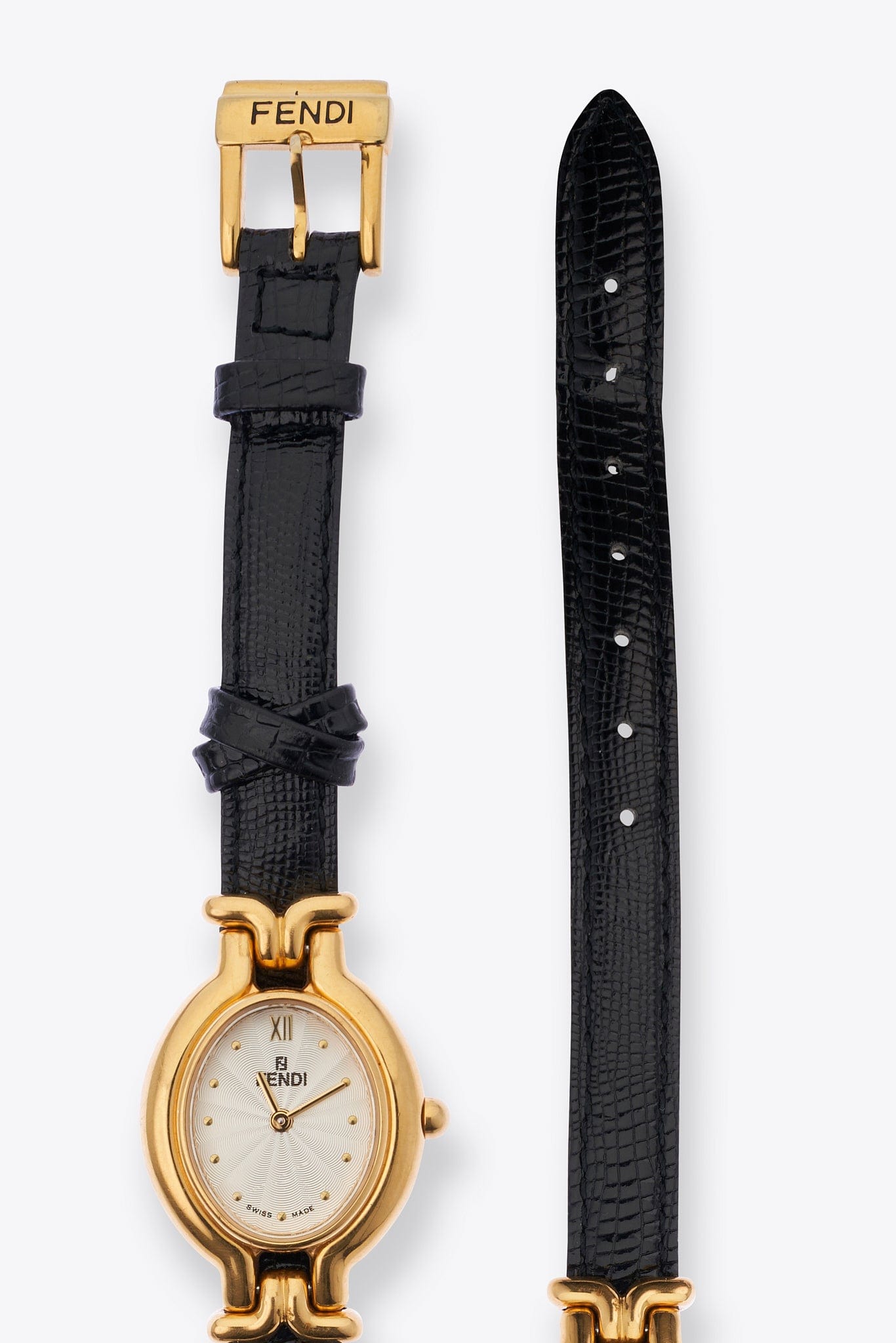 Vintage Fendi Oval Gold Plated Watch with Black Lizard Leather Strap