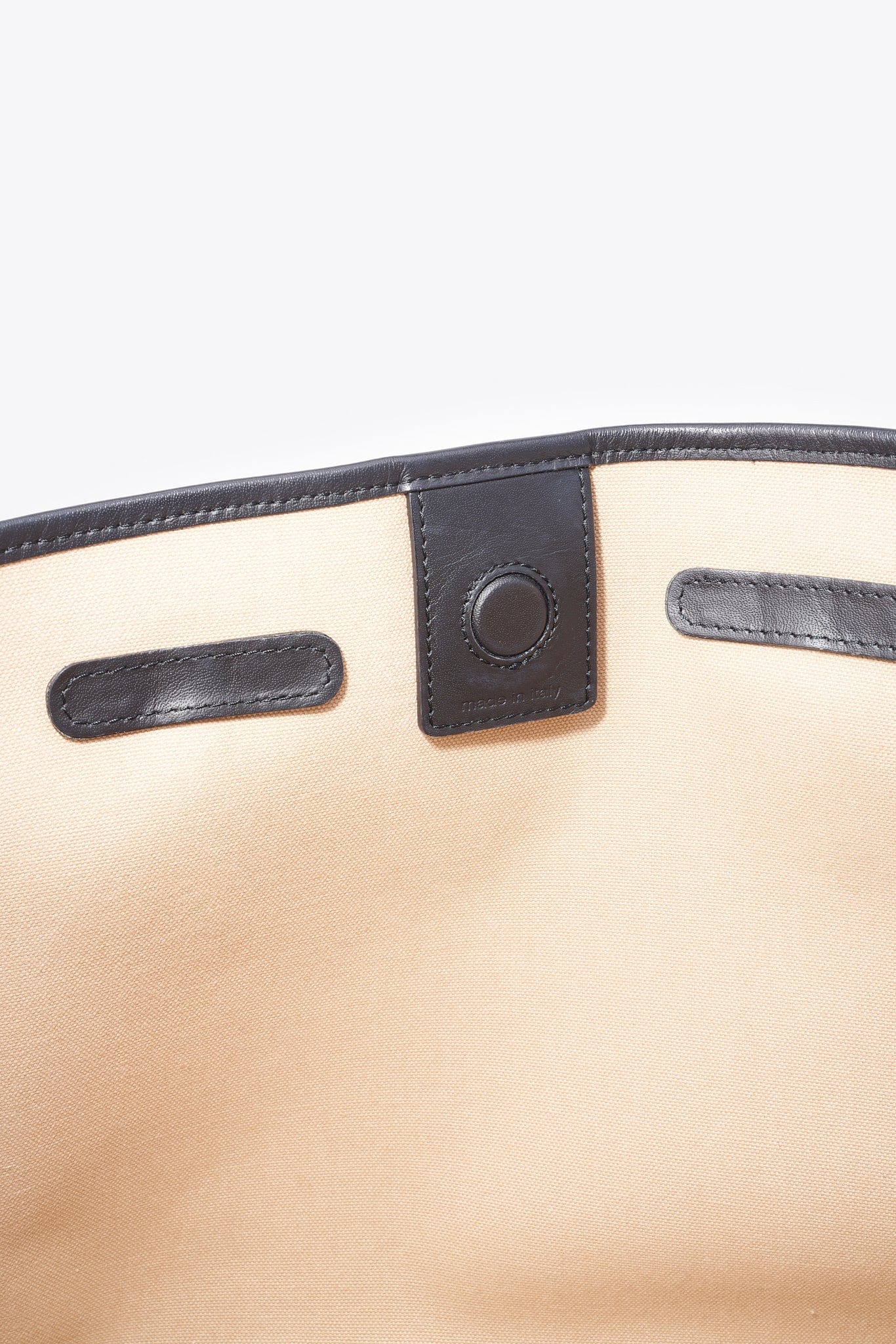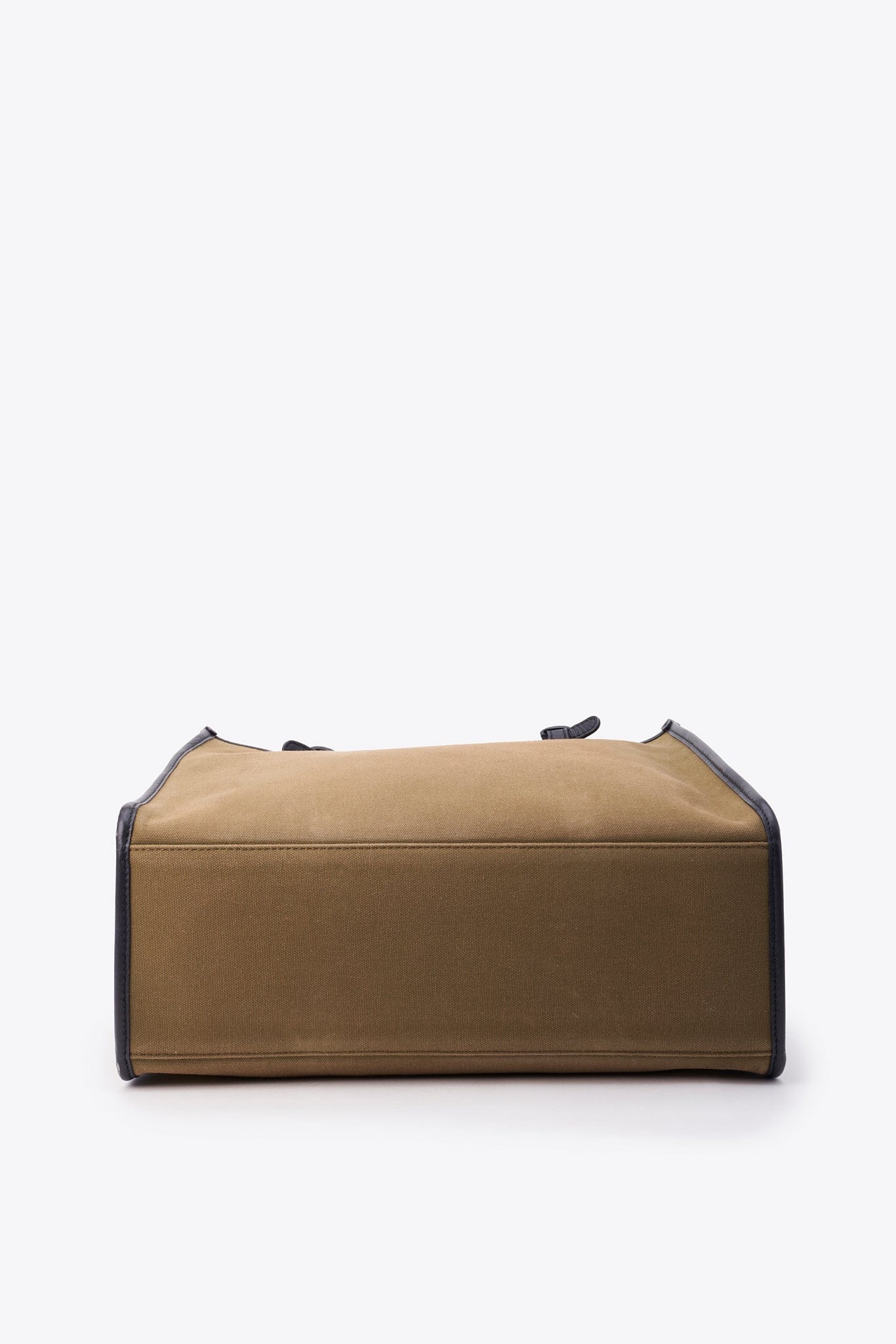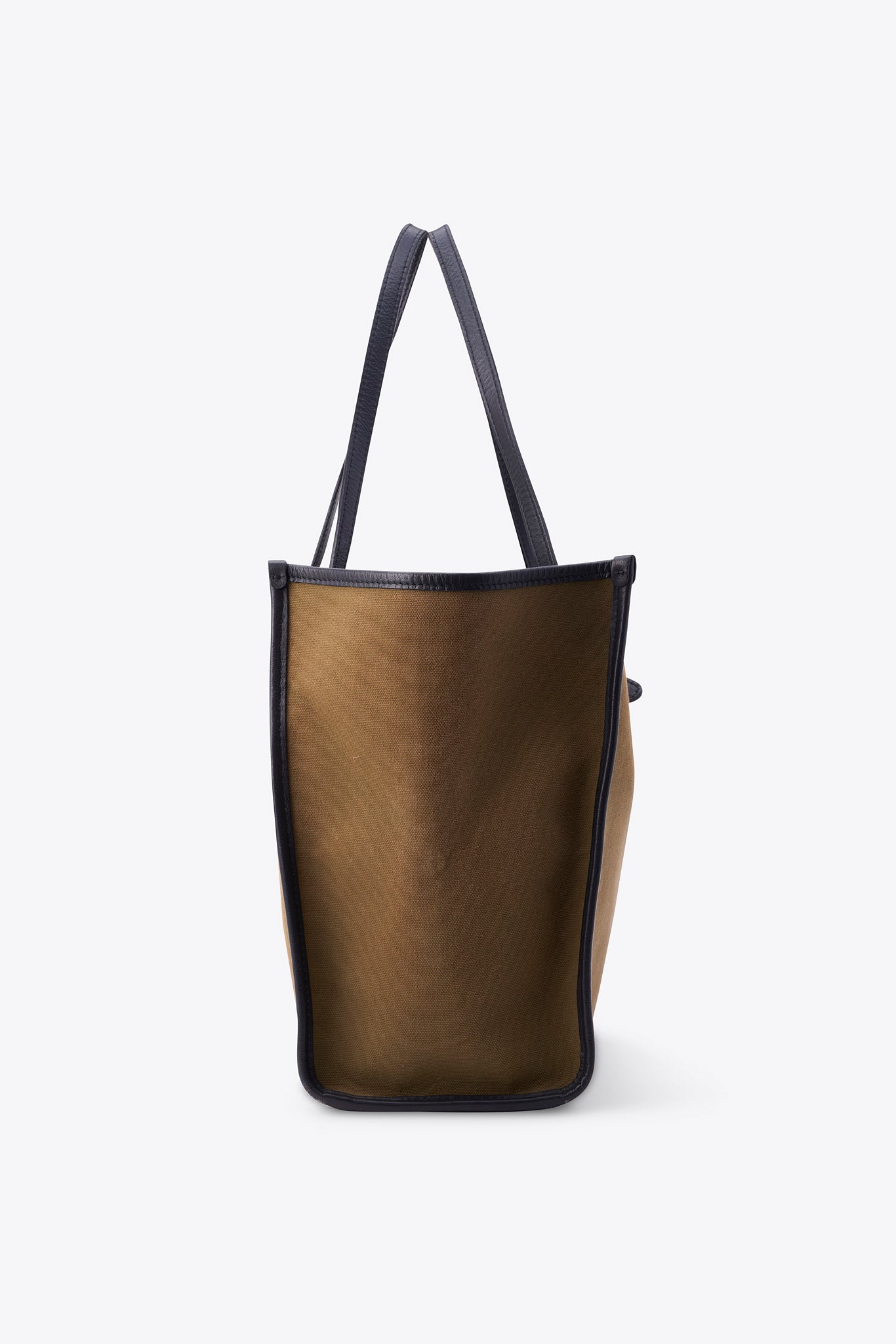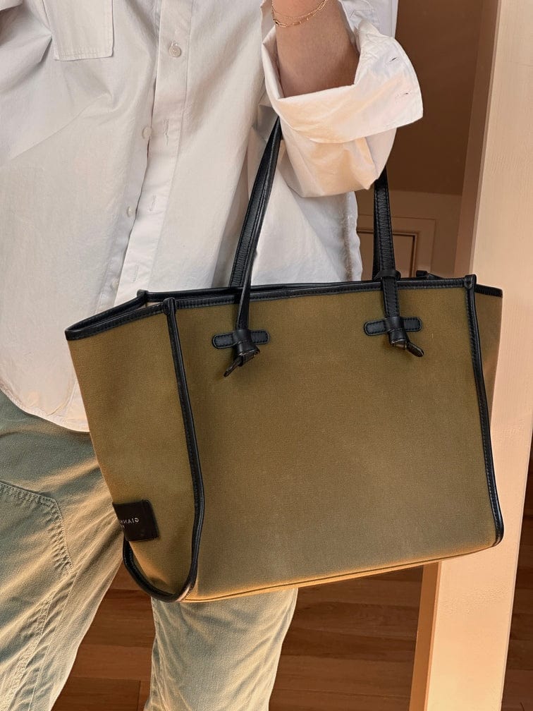 A minimal yet standout tote with a structured silhouette and elevated detailing. Crafted in Italy from structured olive canvas with contrasting black leather trim and handles, this vintage Gianni Chiarini piece gives effortless Phoebe Philo-era Céline vibes, considered, confident, and utterly timeless.