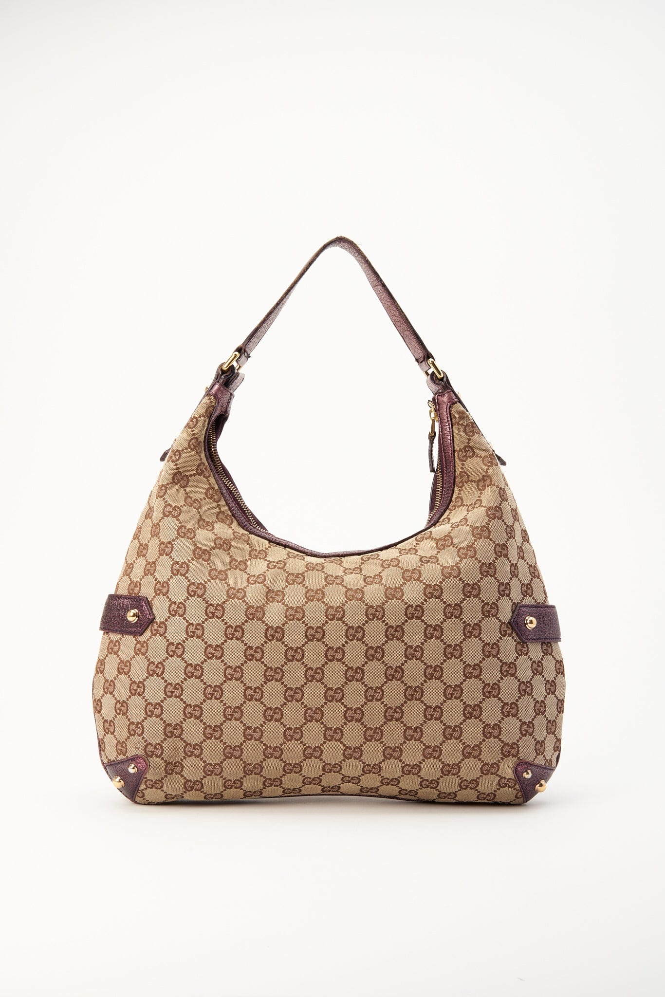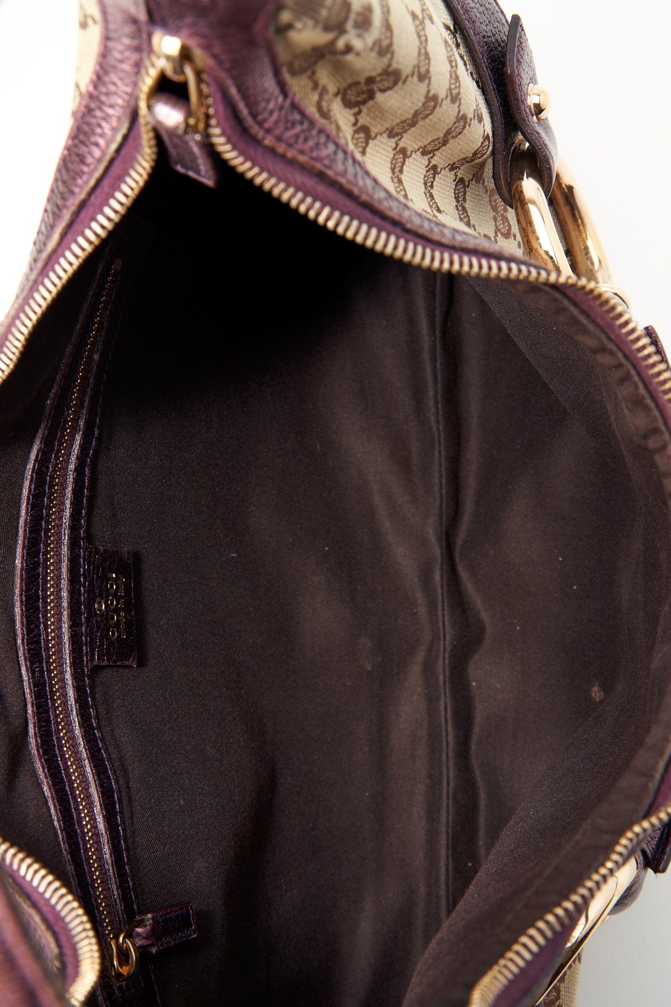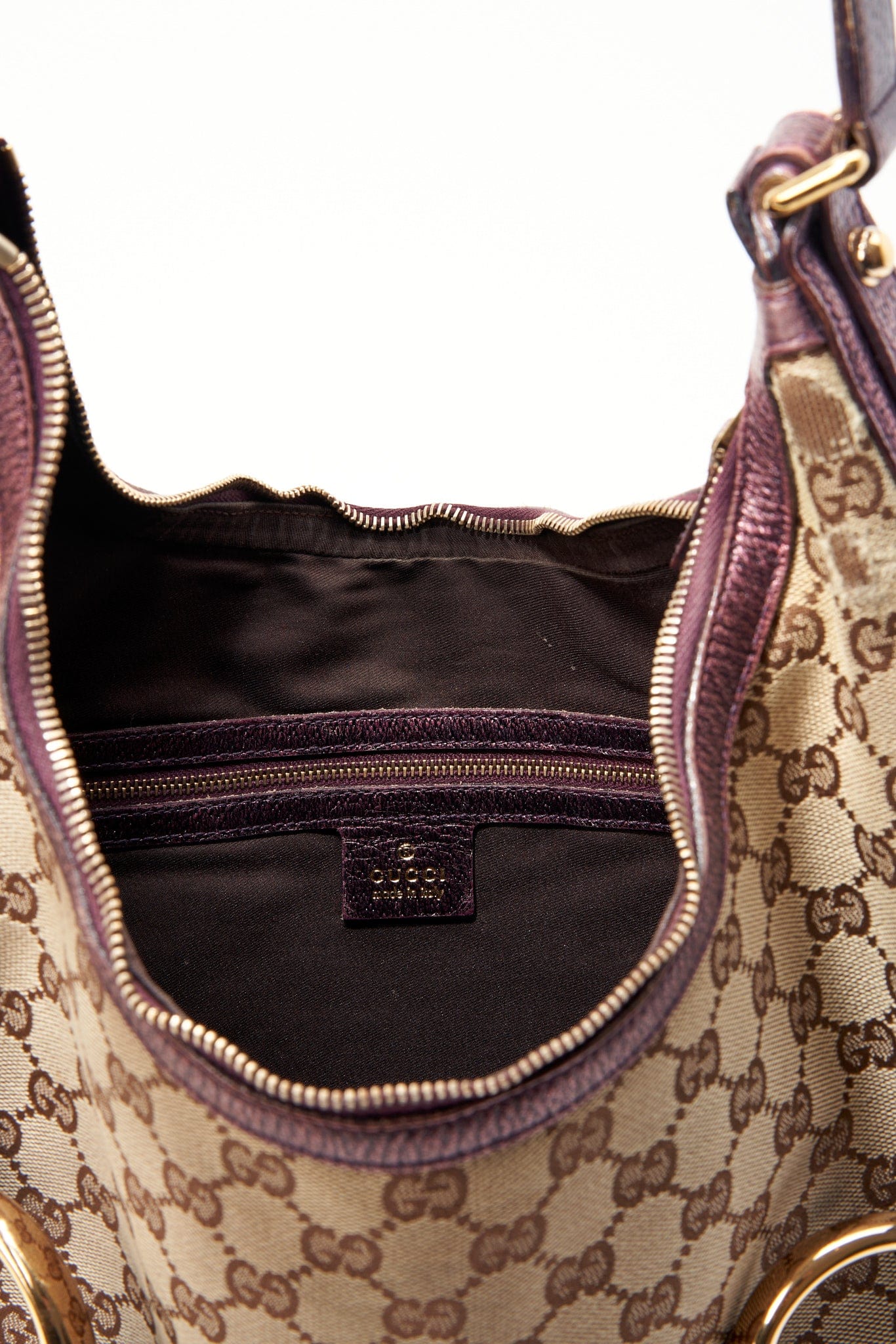 A stunning vintage Gucci bag made from the iconic GG beige/brown canvas with purple leather trim and gold hardware.