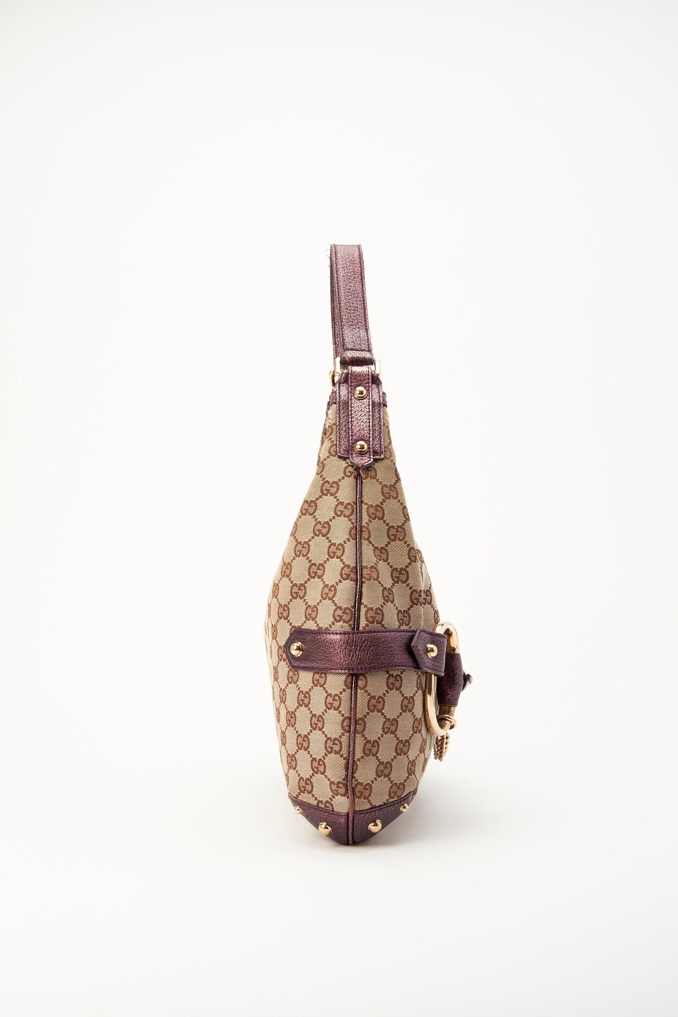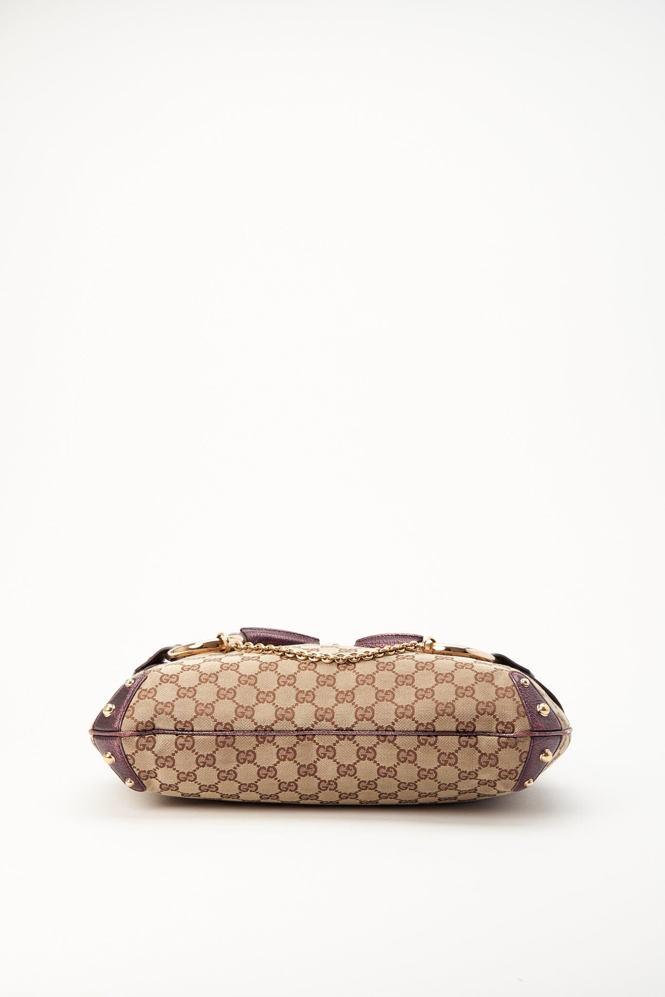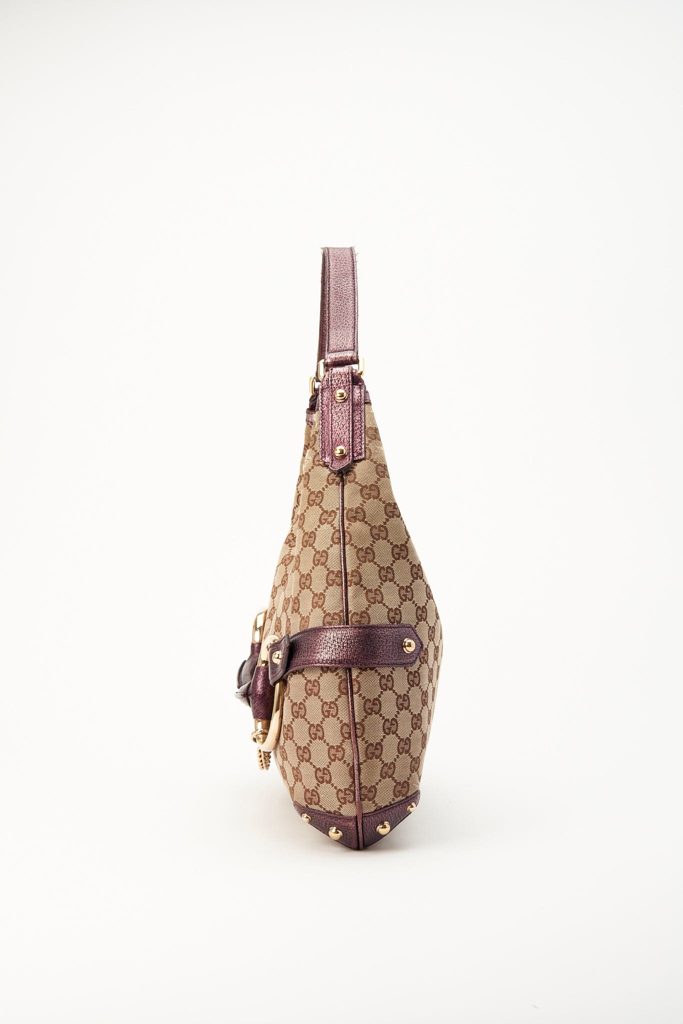 A stunning vintage Gucci bag made from the iconic GG beige/brown canvas with purple leather trim and gold hardware.