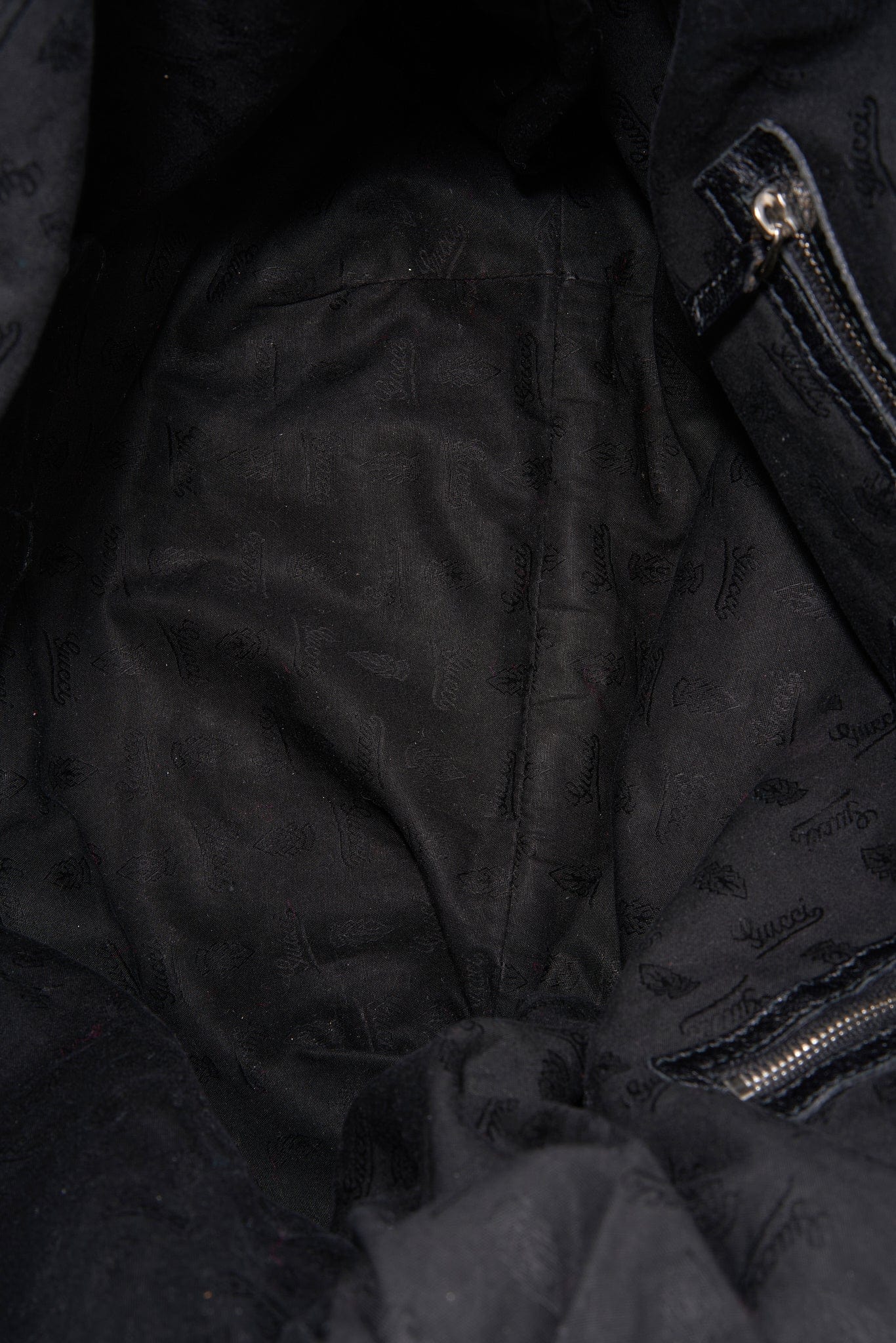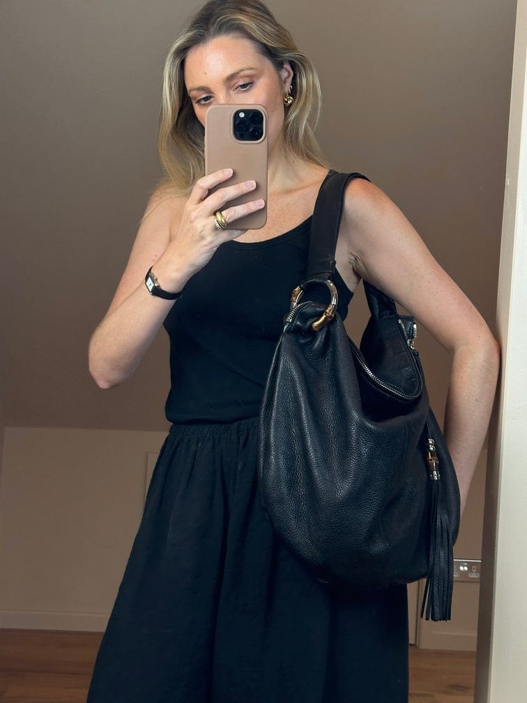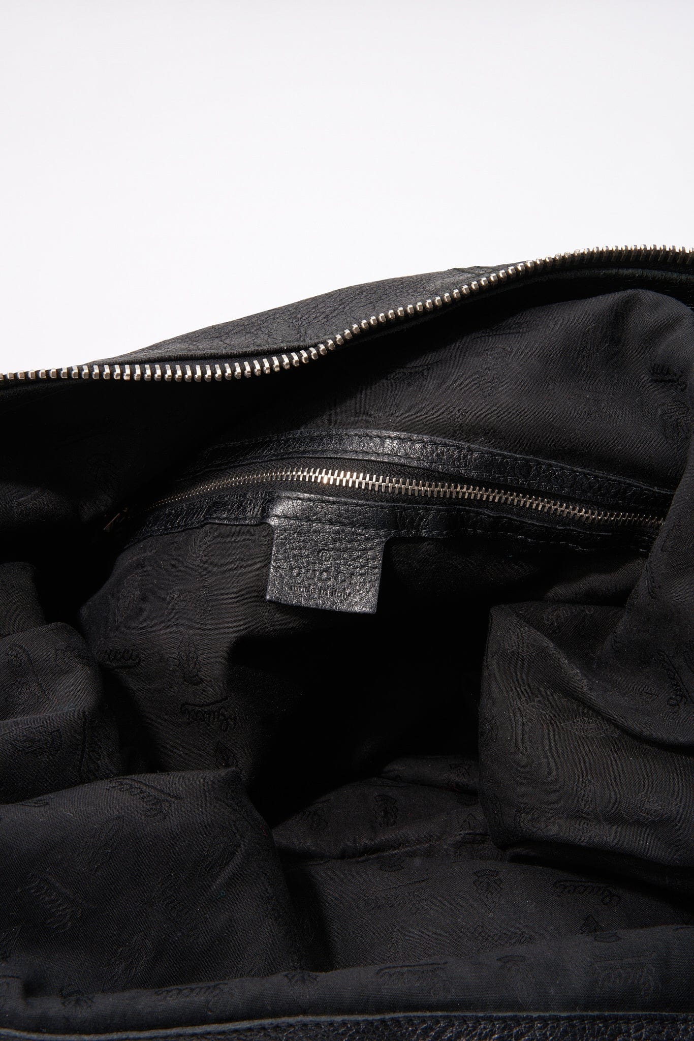 A stunning vintage slouchy Gucci hobo bag made from black leather with silver hardware and iconic bamboo details.