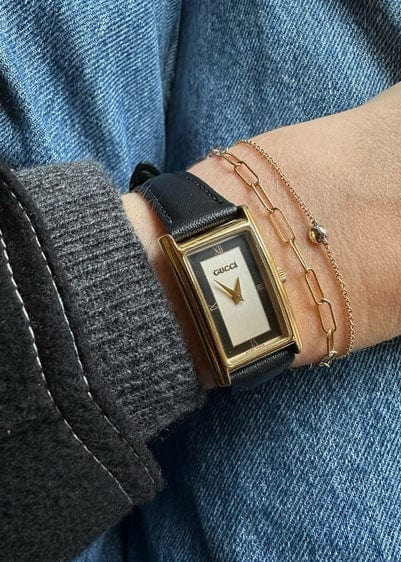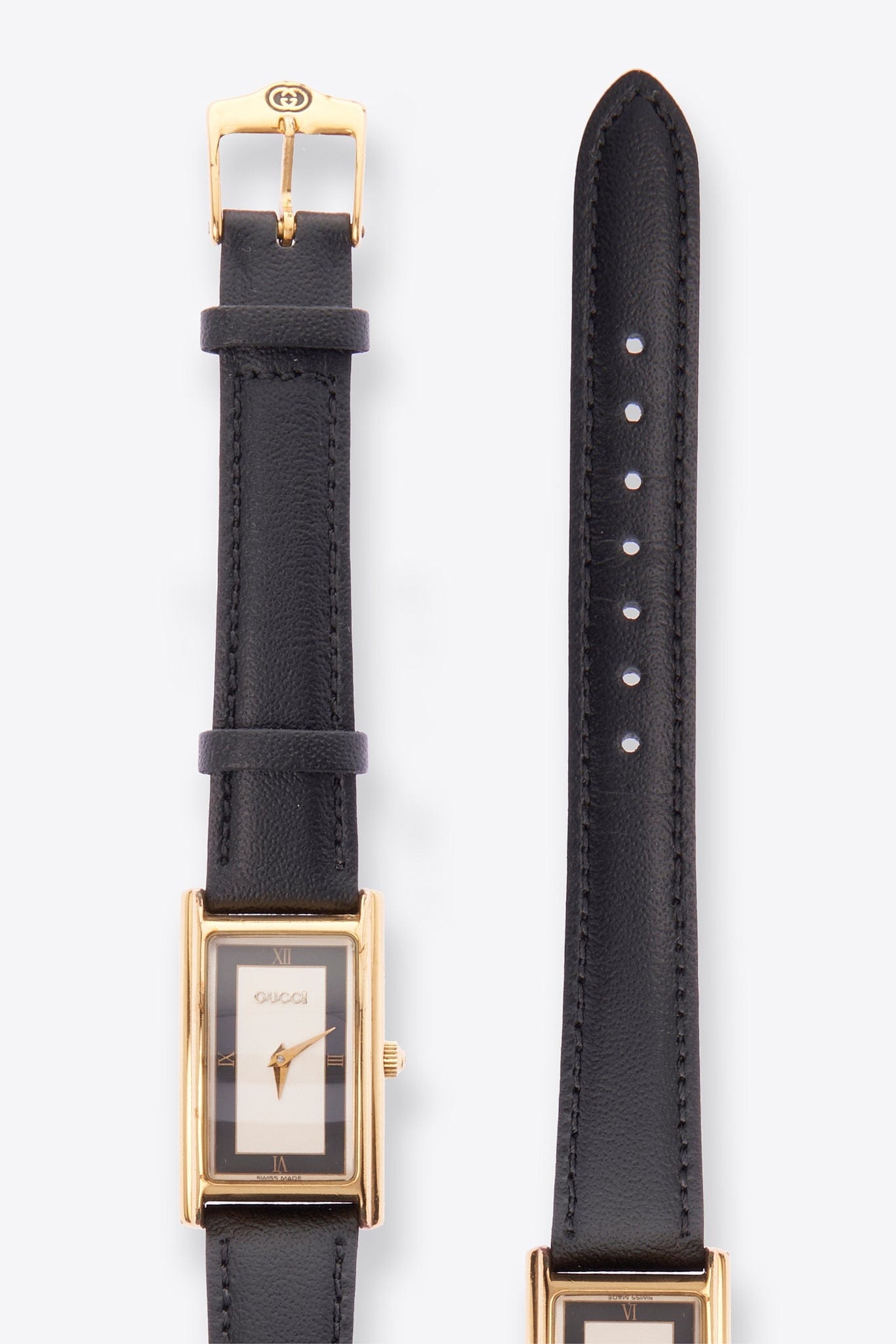 A super chic gold-plated Gucci vintage watch with a black leather strap.