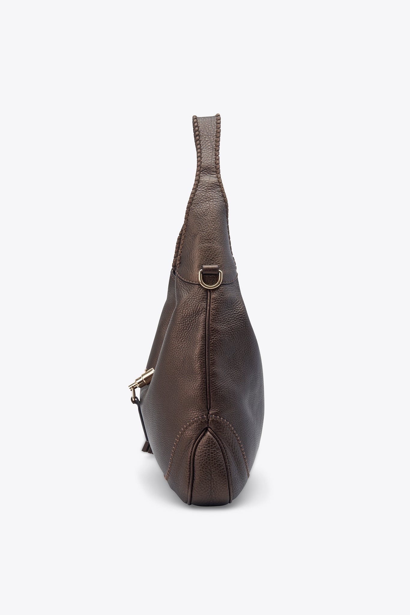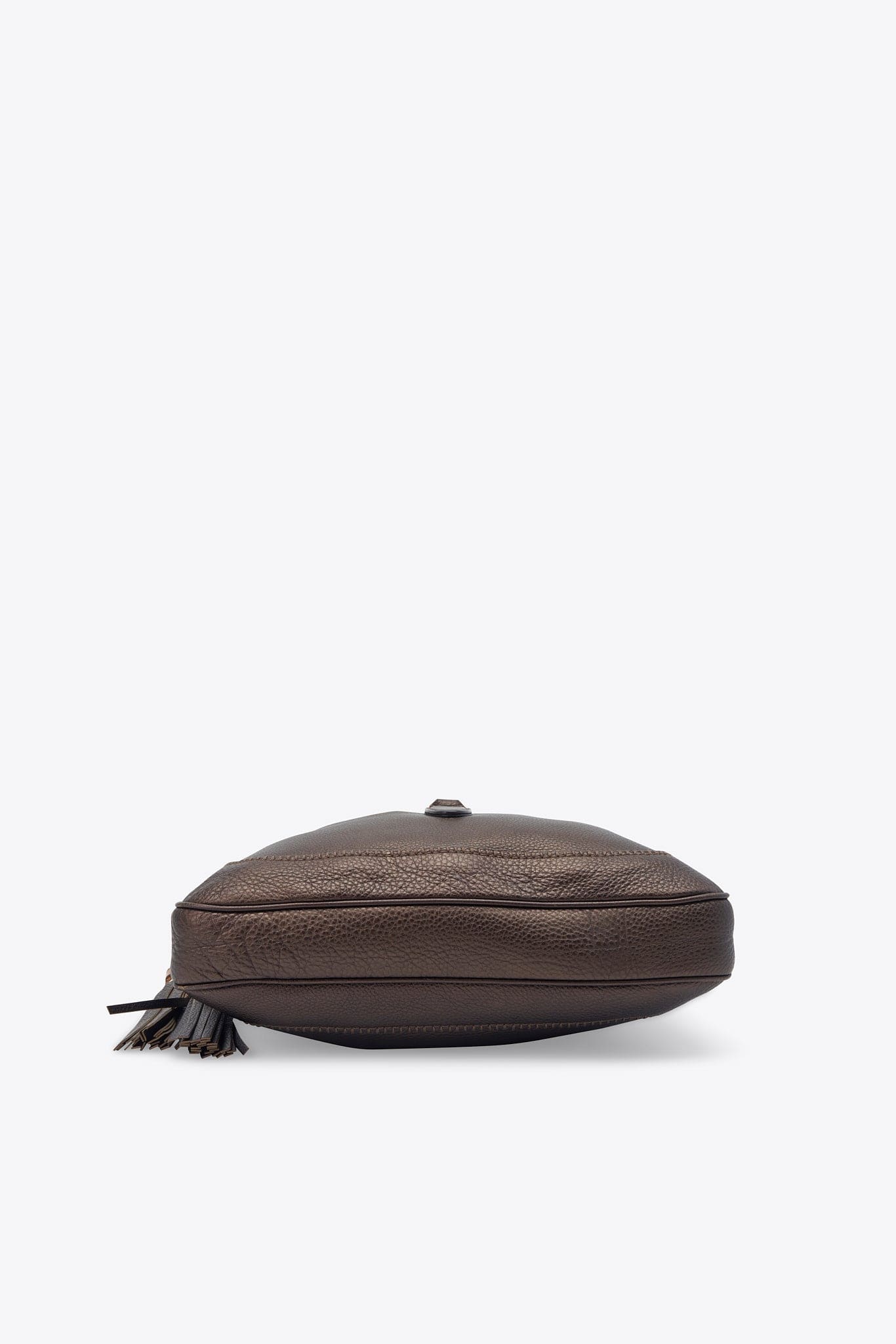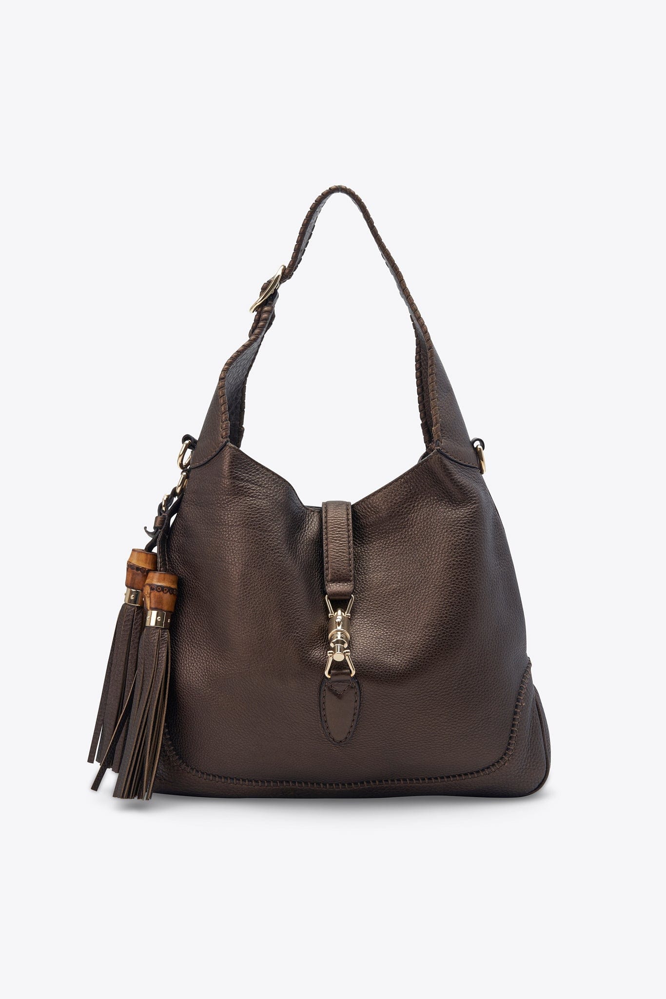 A stunning vintage Gucci bag made from an incredible textured brown leather, with a slight metallic sheen and pale gold hardware. Featuring two larges tassels with bamboo details.