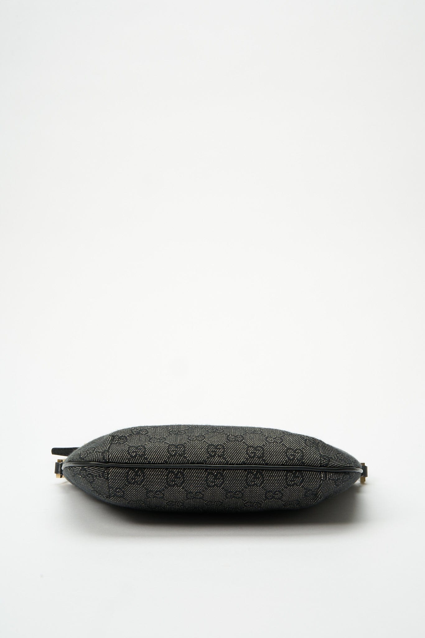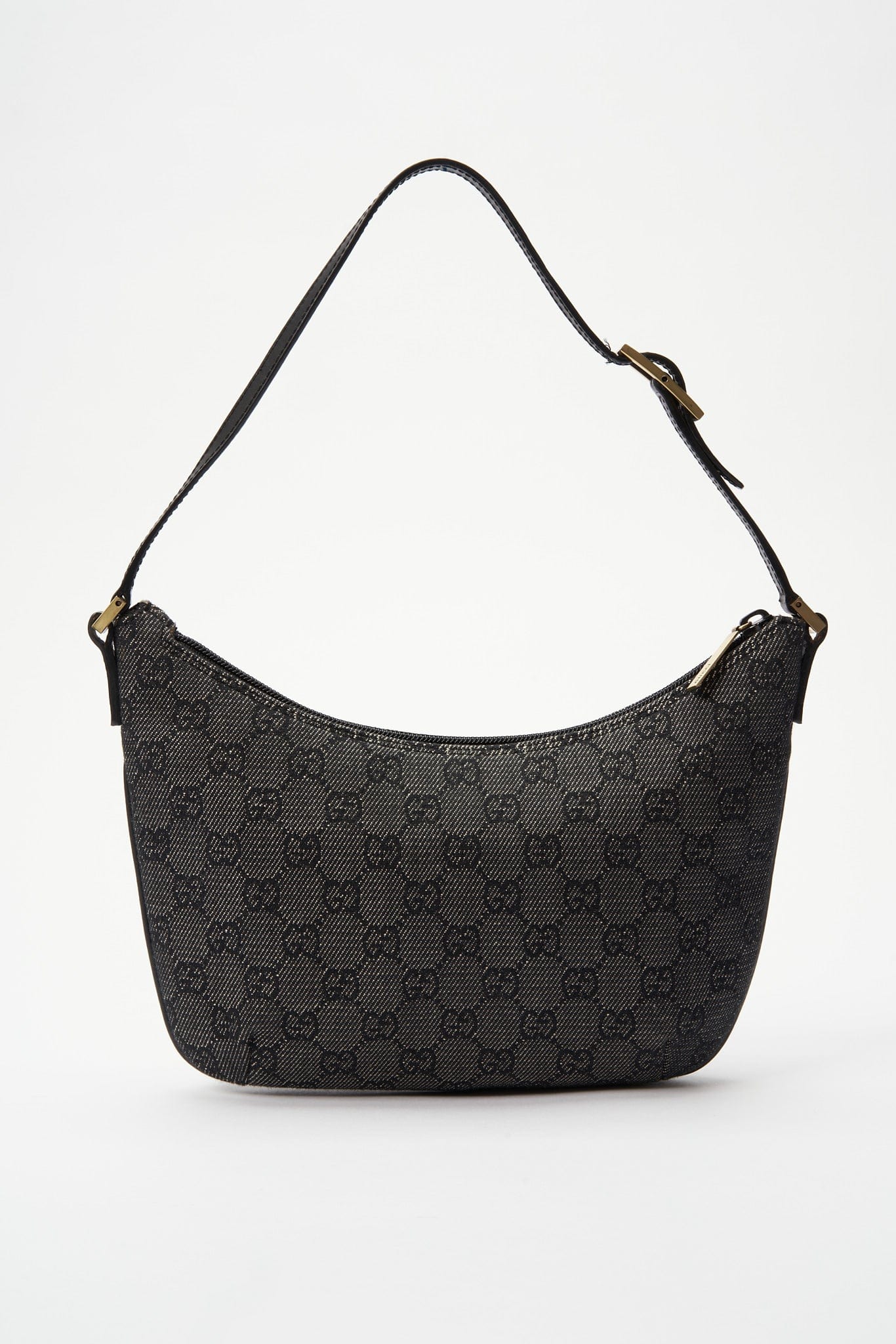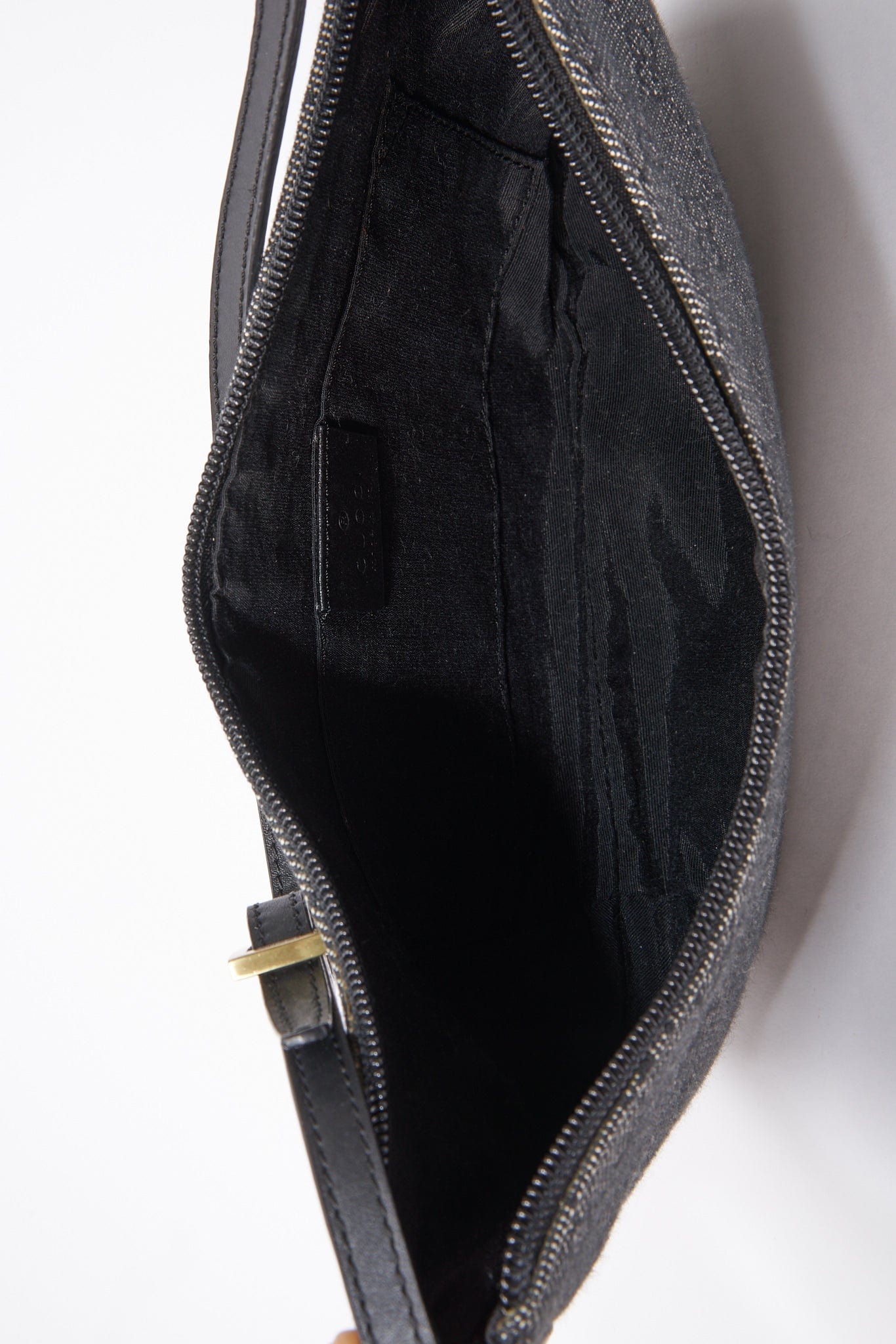 A stunning vintage Gucci pochette style shoulder bag made from the iconic GG black canvas with black leather trim and Gucci branded gold hardware.