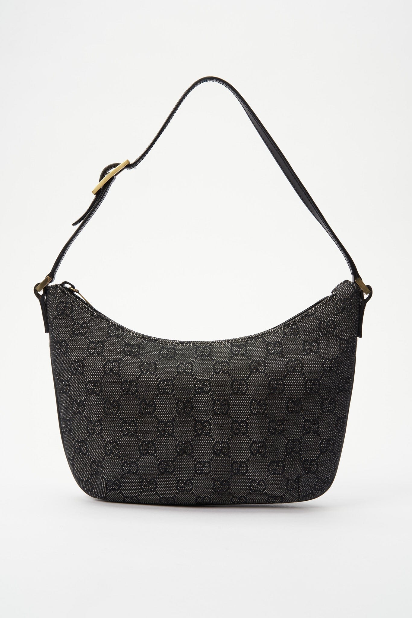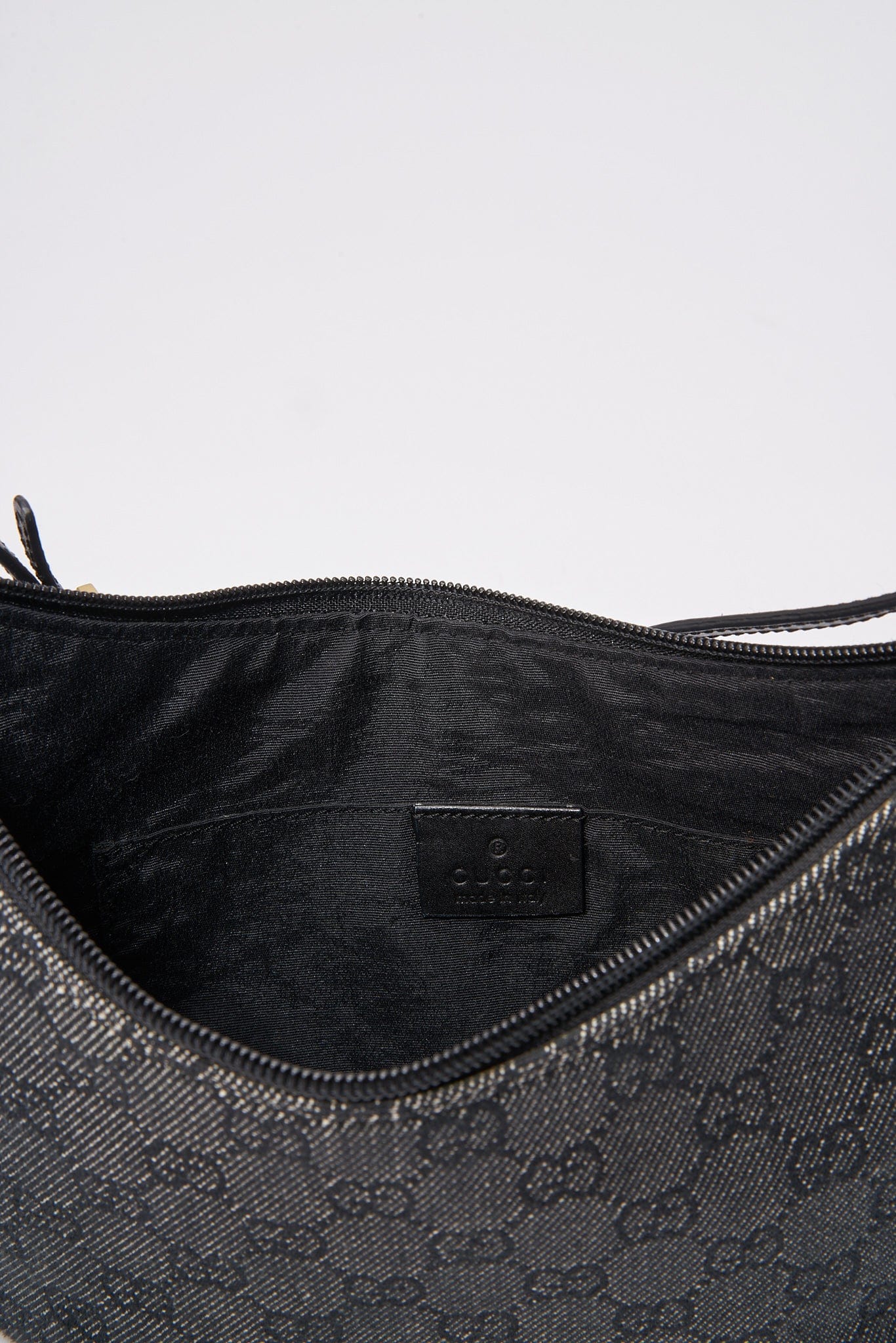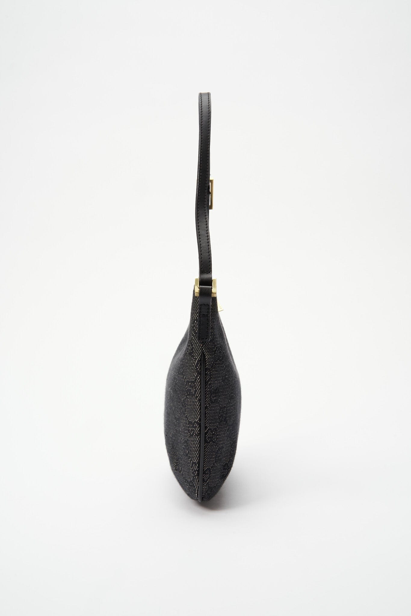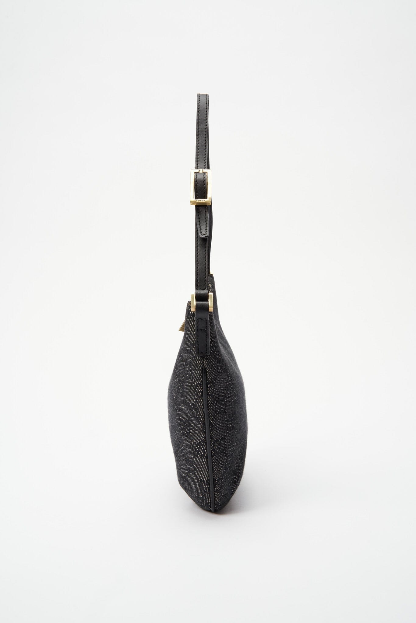 A stunning vintage Gucci pochette style shoulder bag made from the iconic GG black canvas with black leather trim and Gucci branded gold hardware.