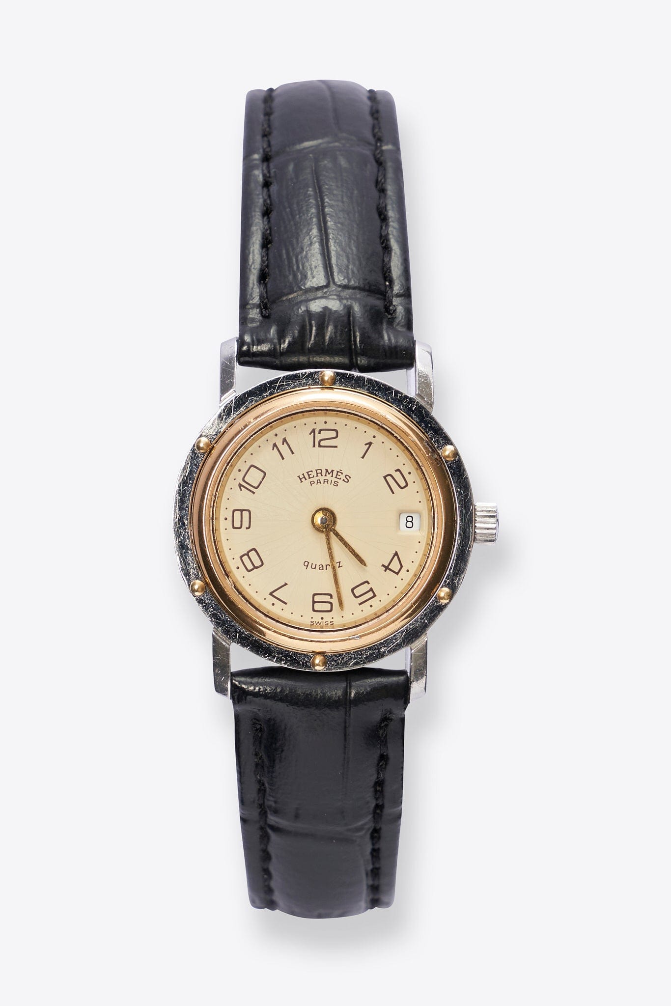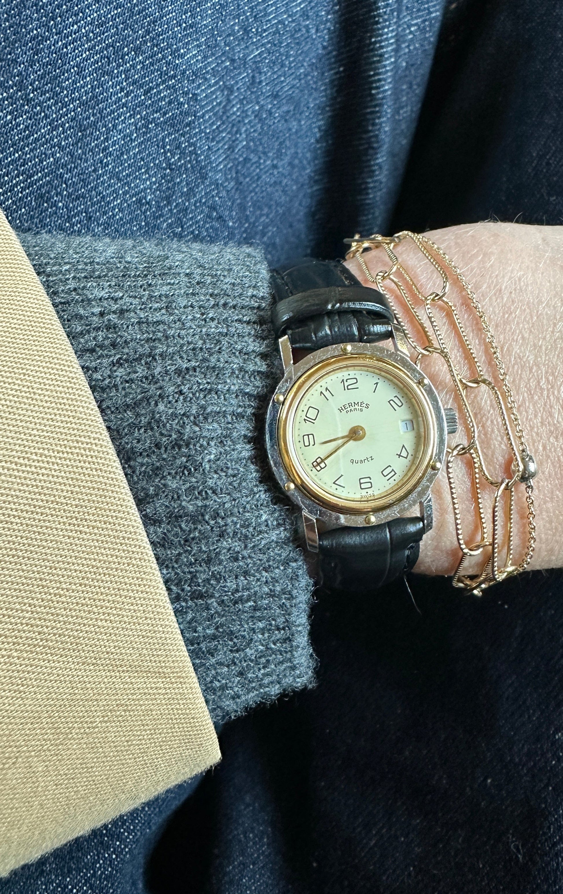 A super chic gold plated Hermès vintage Arceau watch with a black croc leather strap.