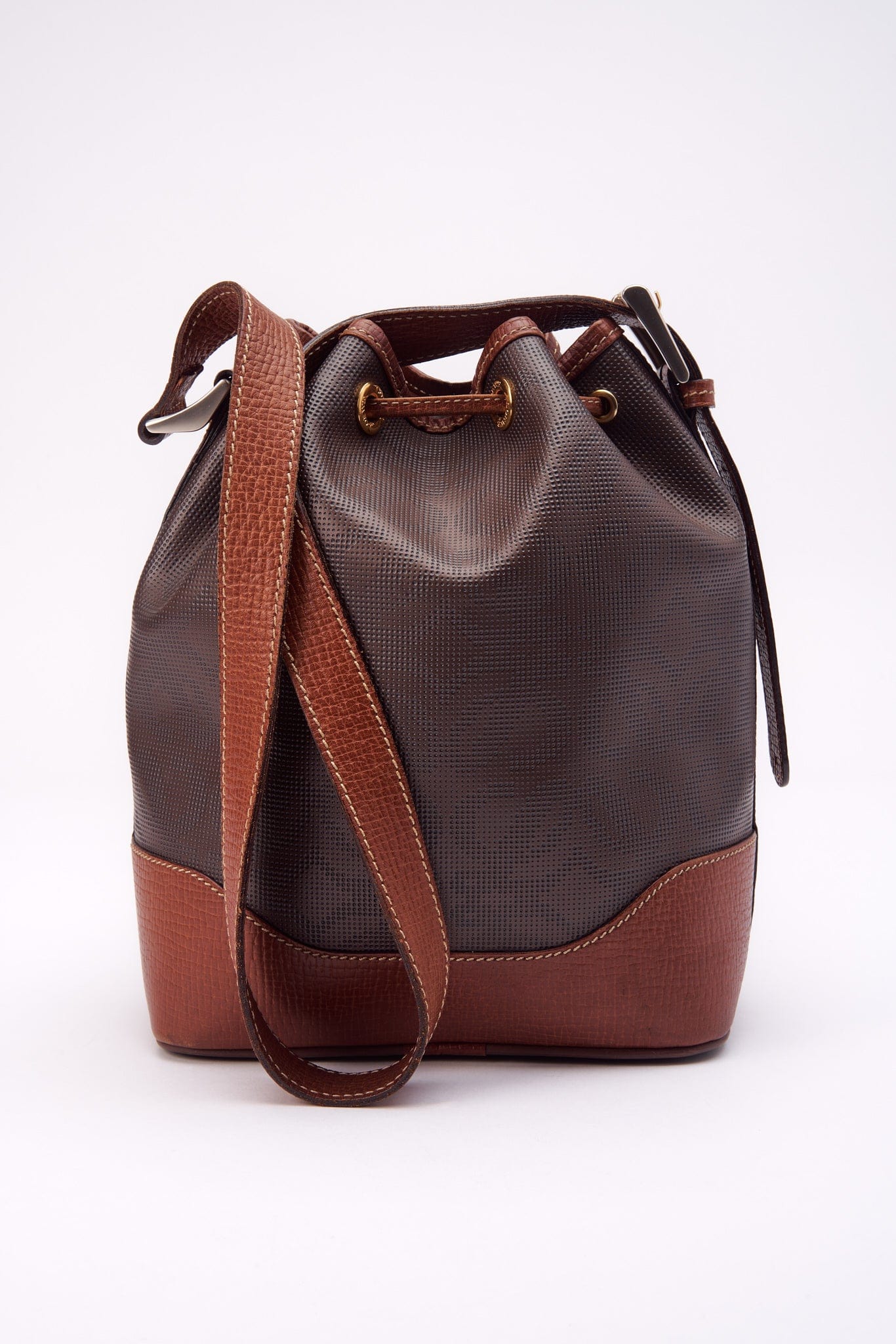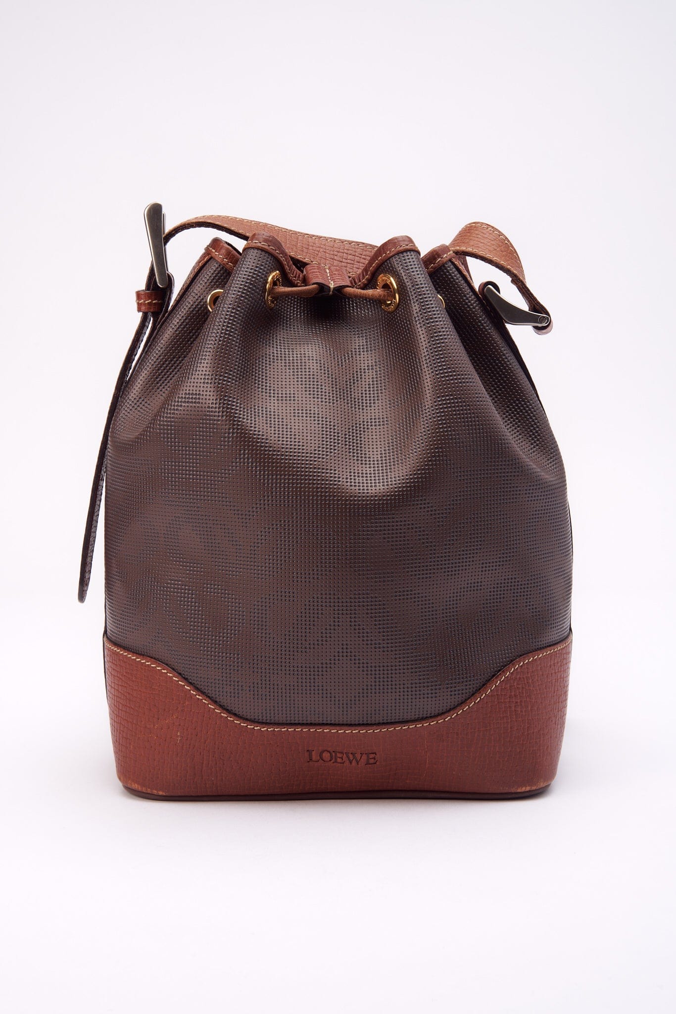 A great everyday Loewe bucket bag with some incredible design and branding details. Crafted from a textured brown Anagram canvas with tan leather trim and gold and silver hardware.