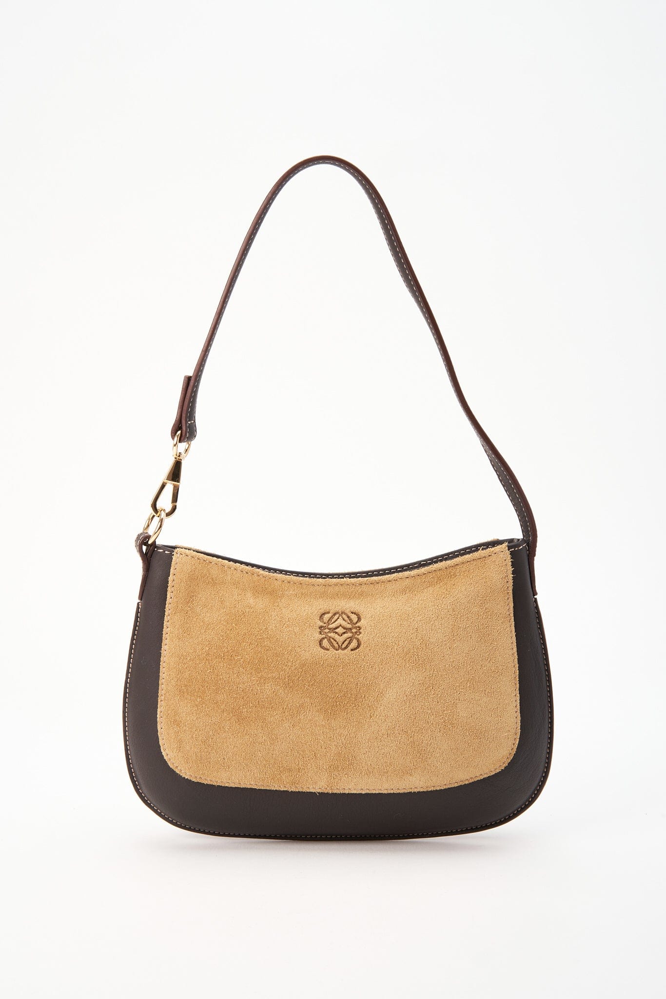 A super cute vintage Loewe shoulder bag crafted from a super soft beige suede embossed with the Loewe Anagram and brown leather trim and handles.
