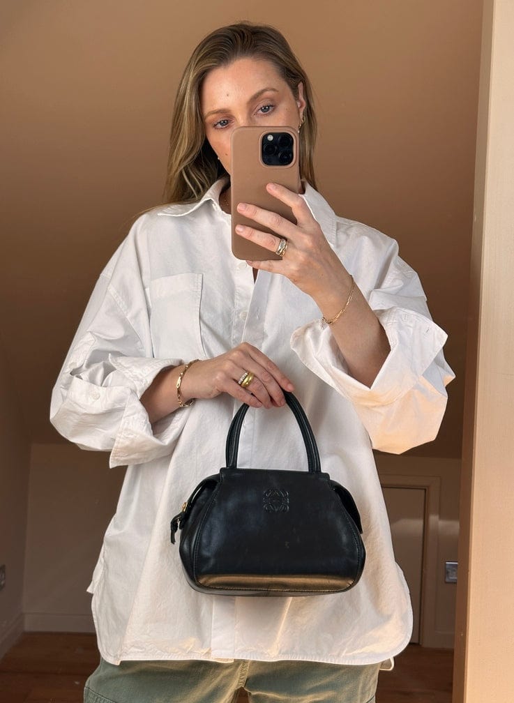 Inside, it’s lined with Loewe’s monogram lining and finished with a gold tone logo plaque and interior zipped pocket. The shape feels timeless and quietly elegant, easy to wear day or night.