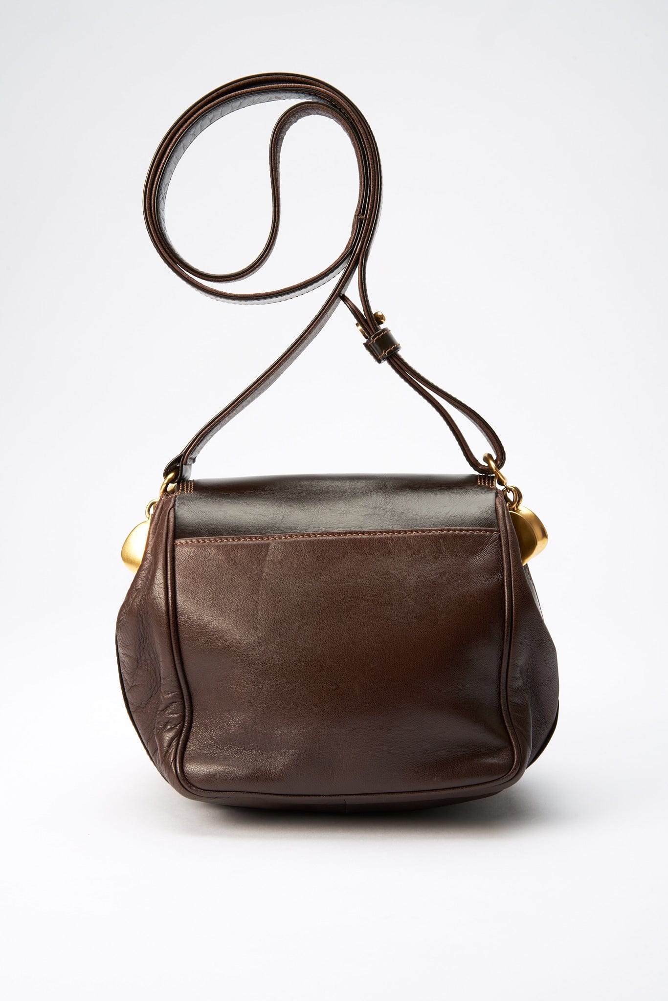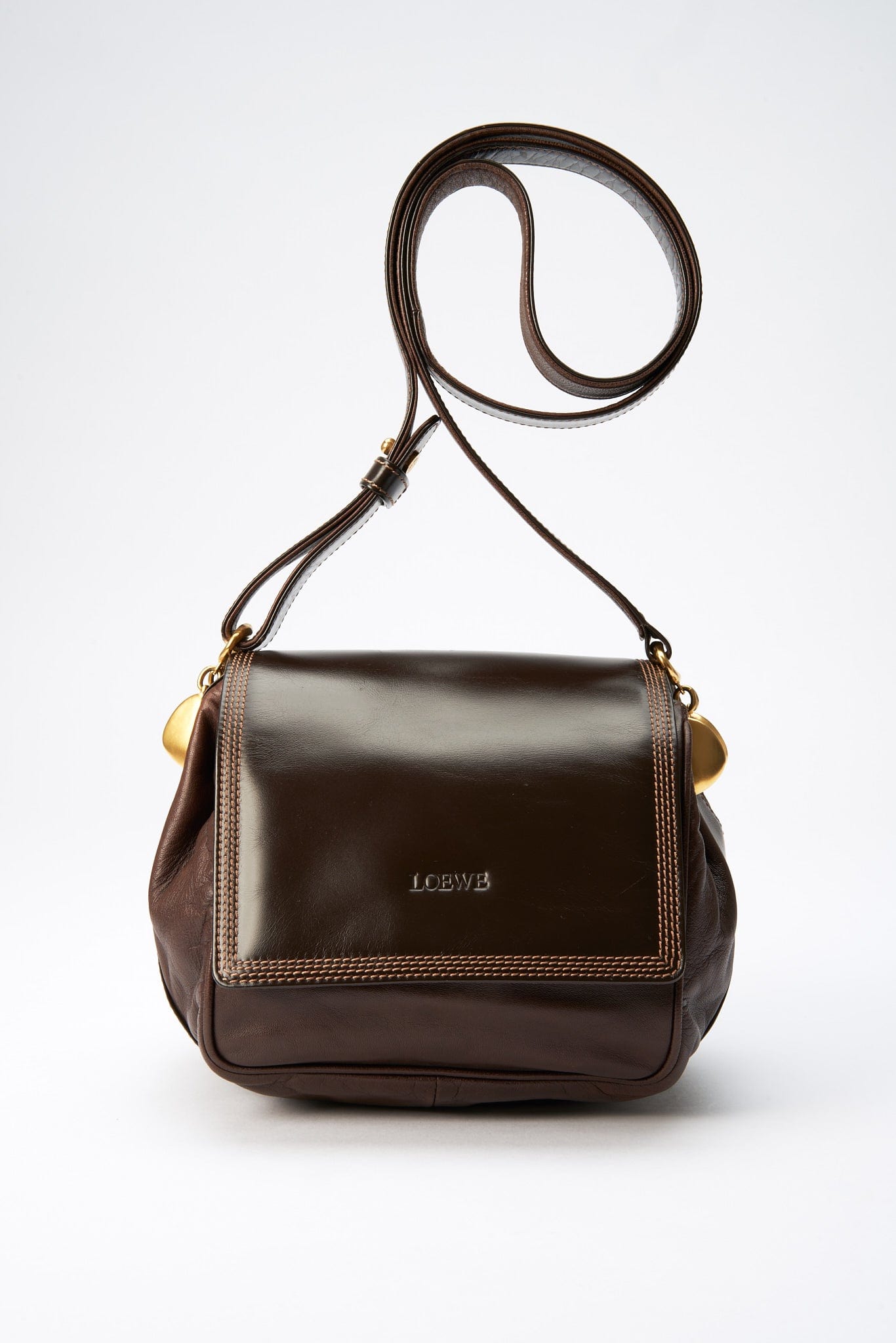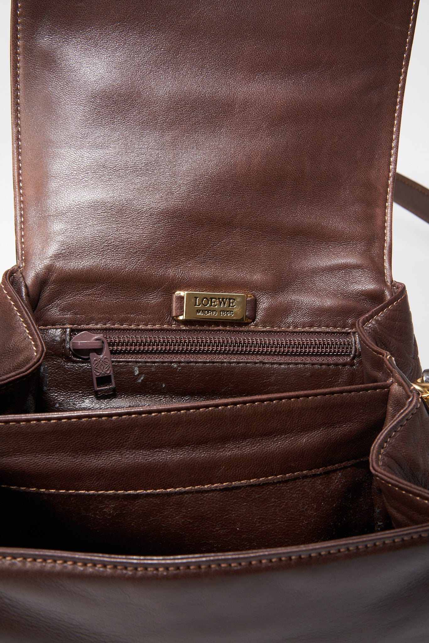 A timeless Loewe crossbody bag crafted from a smooth brown leather embossed with the Loewe logo. This bag features some chunky gold on the side panels.