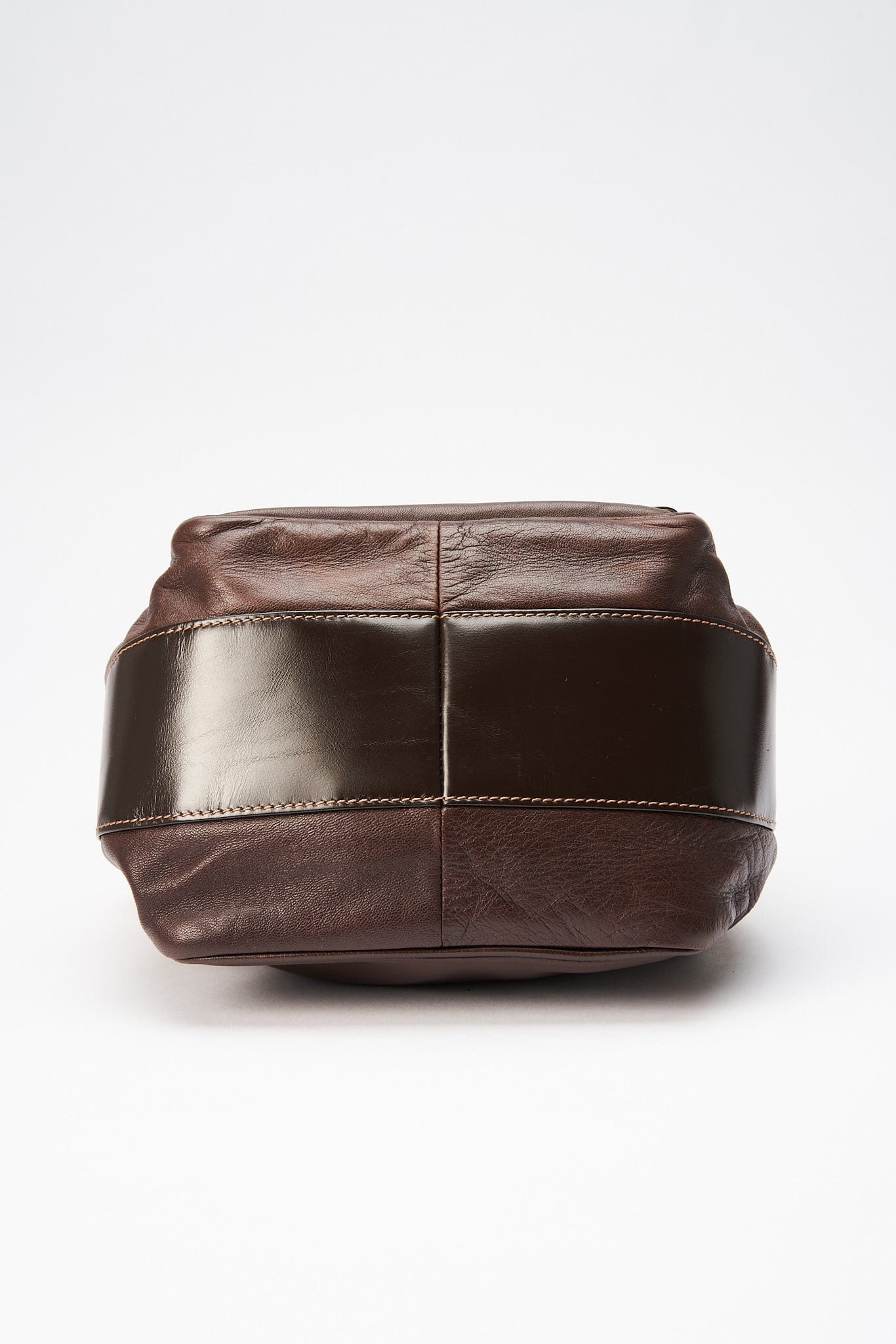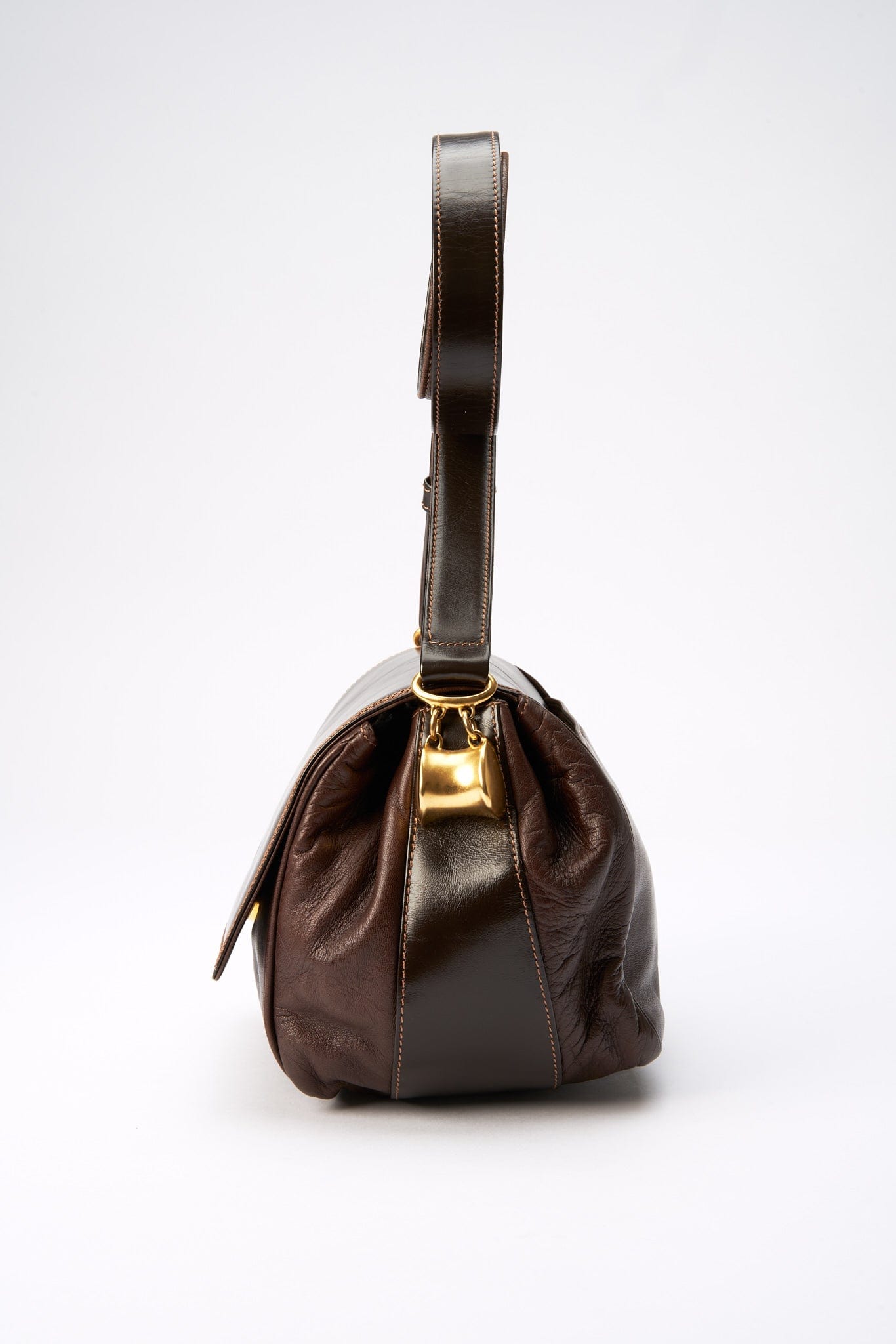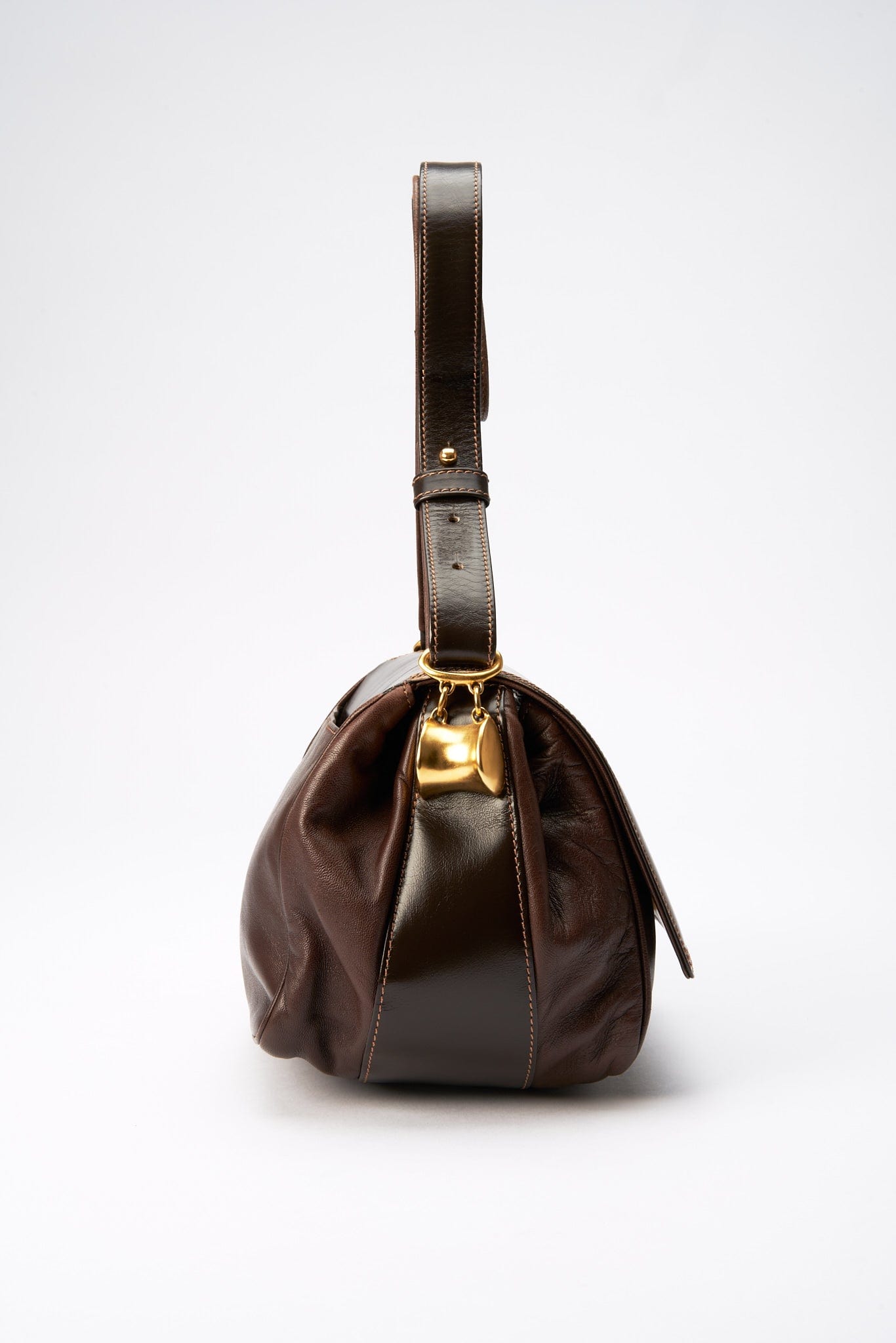 A timeless Loewe crossbody bag crafted from a smooth brown leather embossed with the Loewe logo. This bag features some chunky gold on the side panels.