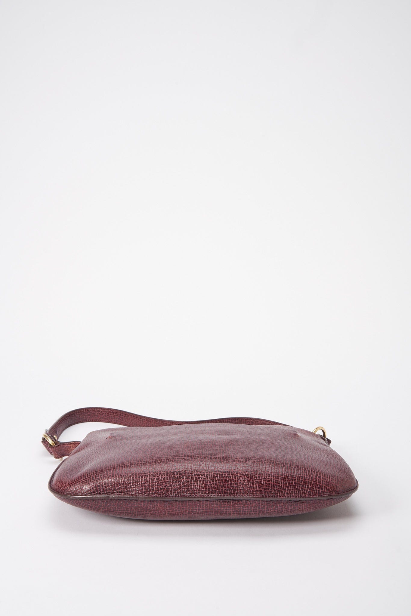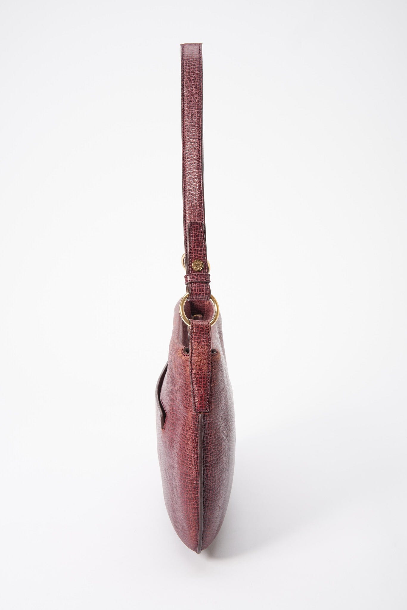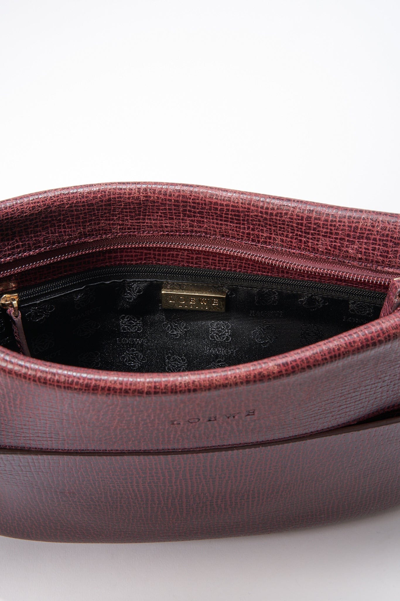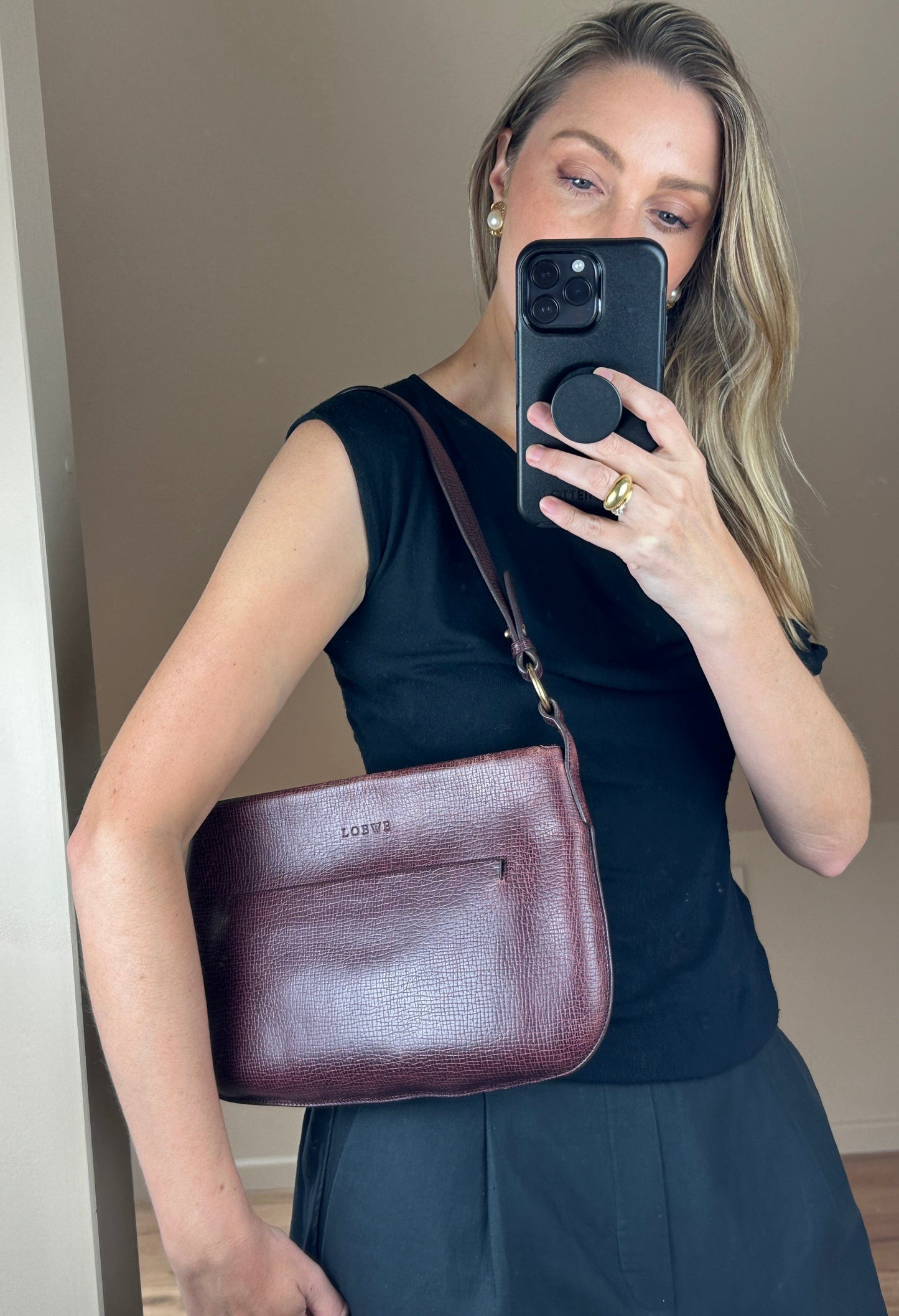 A classic style vintage Loewe shoulder bag, crafted from a wine textured leather with gold hardware. A beautifully minimal design with the Loewe logo blind embossed on the front above a discreet slip pocket in the leather. The Loewe monogram logo is etched into the gold hardware on strap.