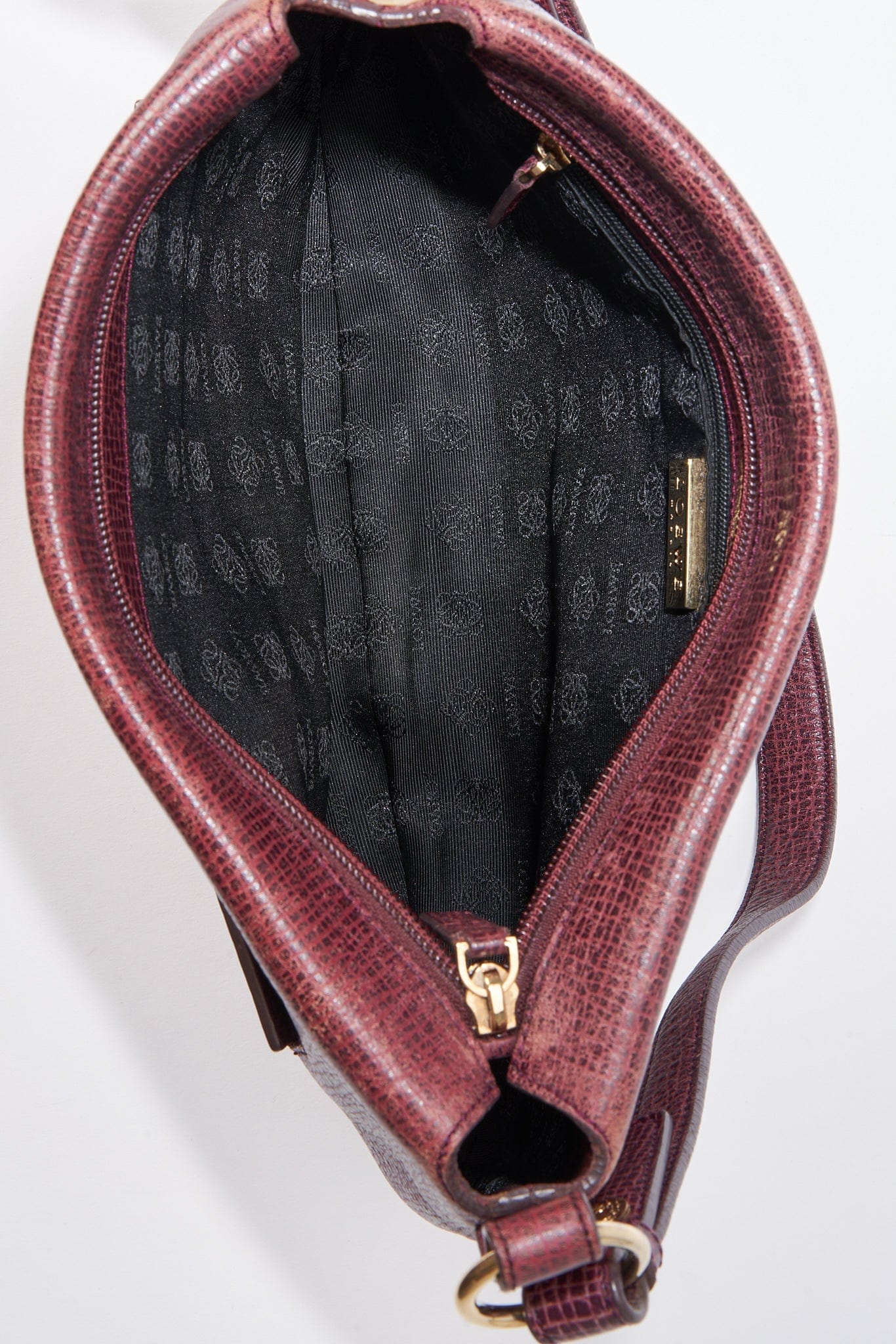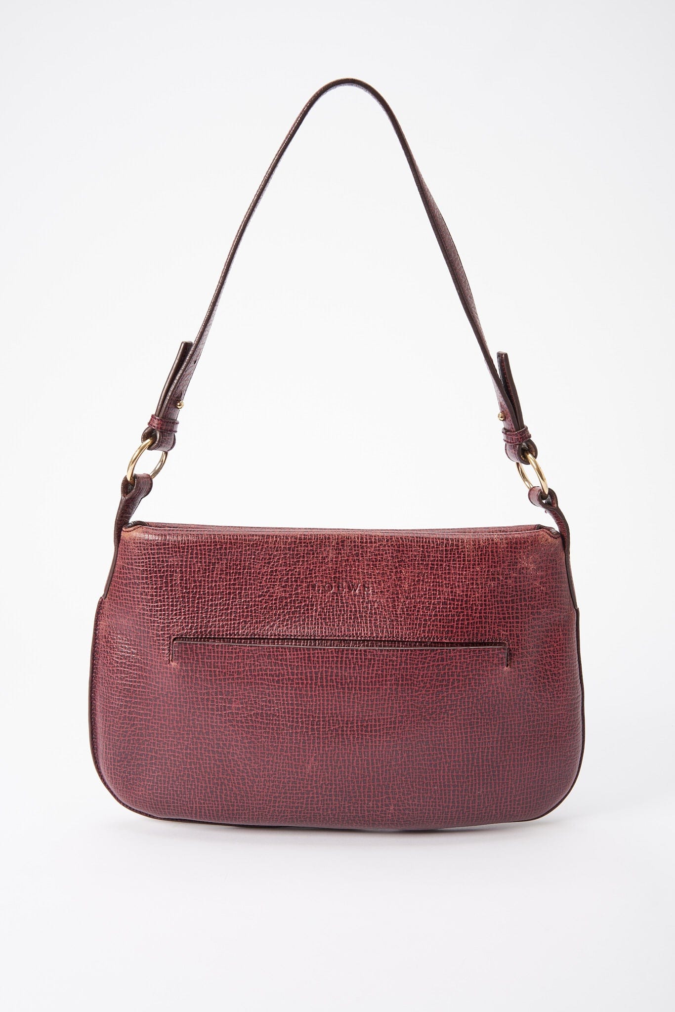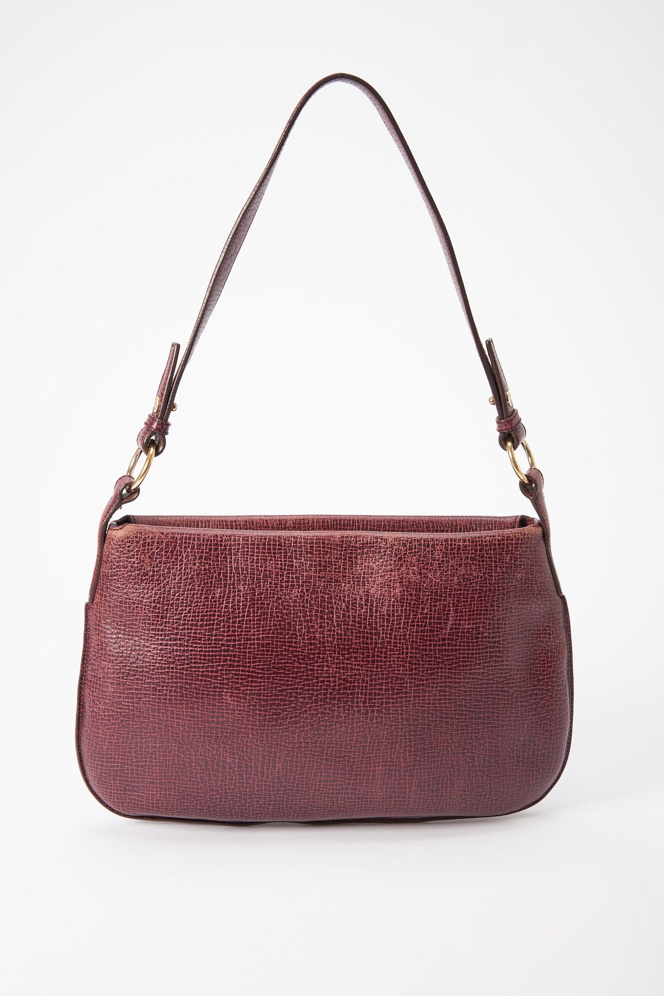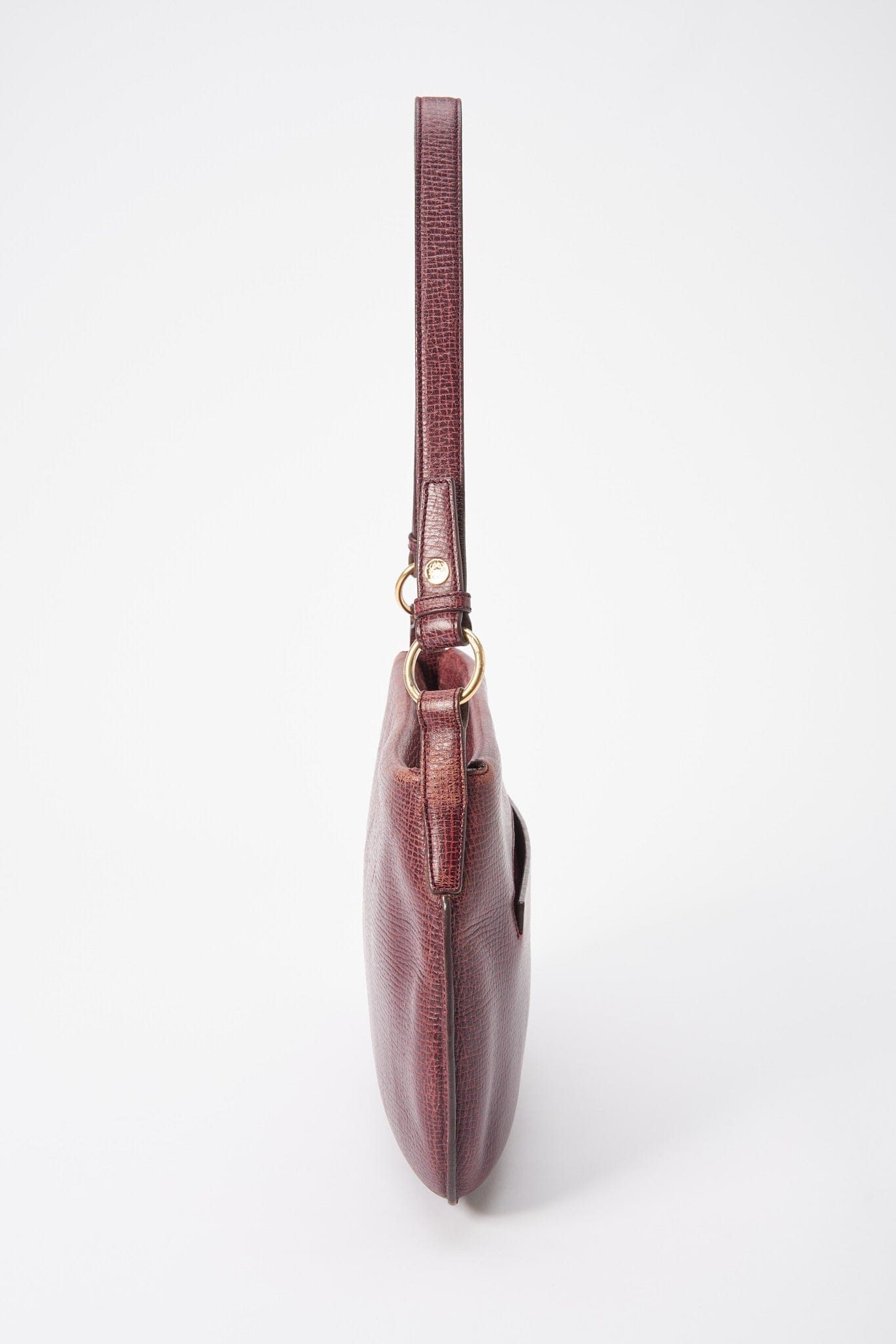 A classic style vintage Loewe shoulder bag, crafted from a wine textured leather with gold hardware. A beautifully minimal design with the Loewe logo blind embossed on the front above a discreet slip pocket in the leather. The Loewe monogram logo is etched into the gold hardware on strap.