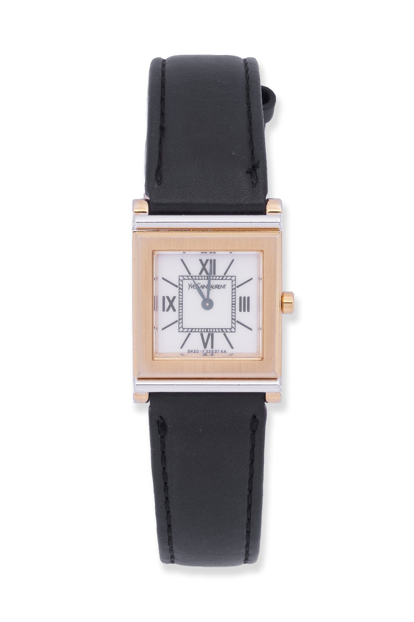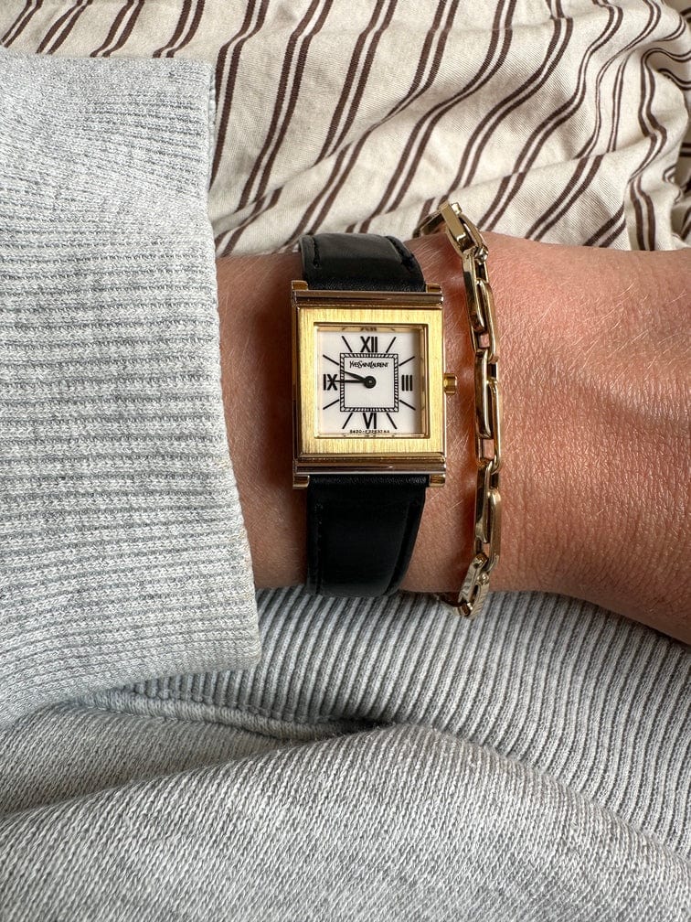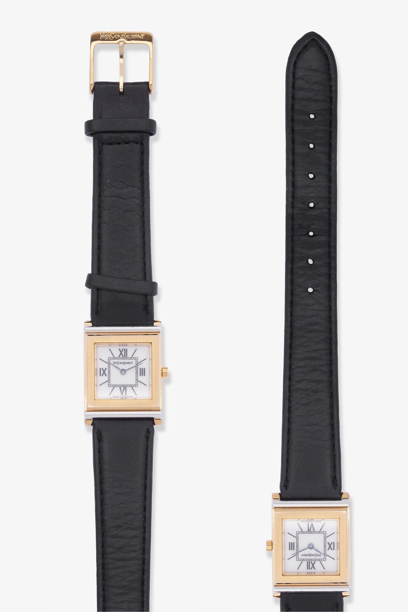 Vintage YSL Gold and Silver Plated Watch with Black Leather Strap