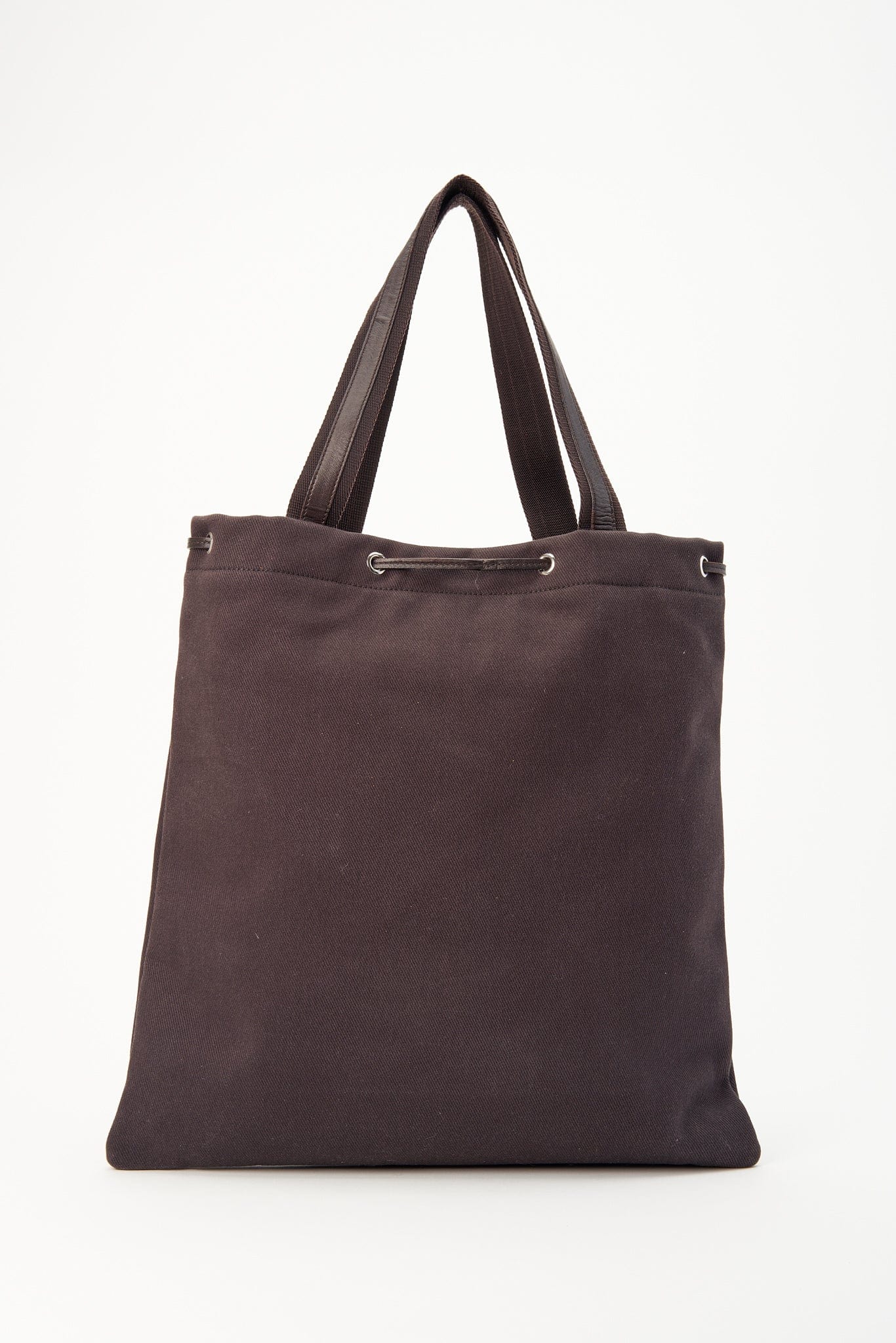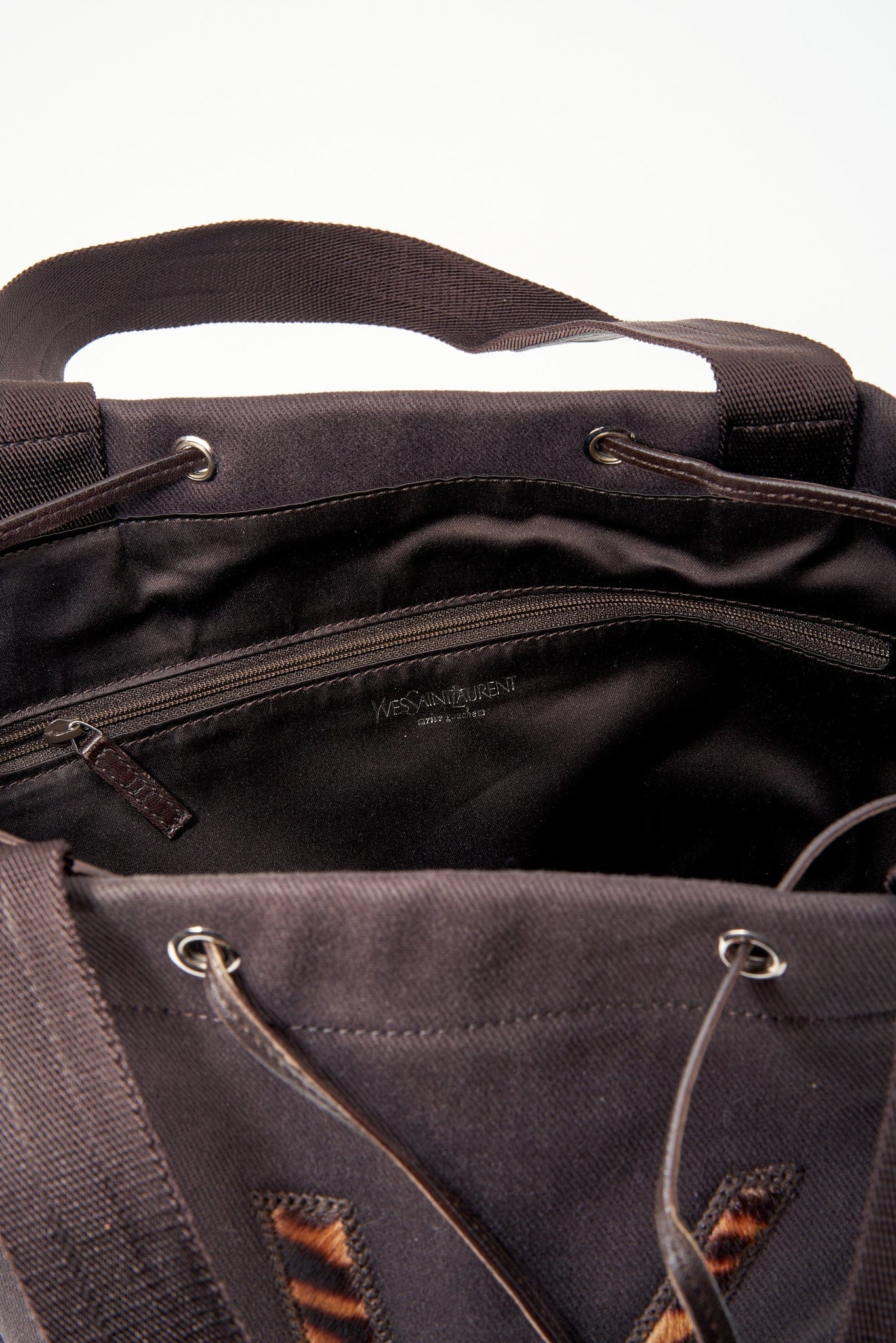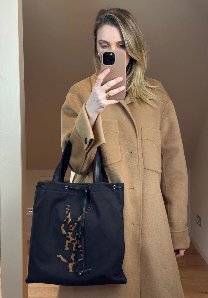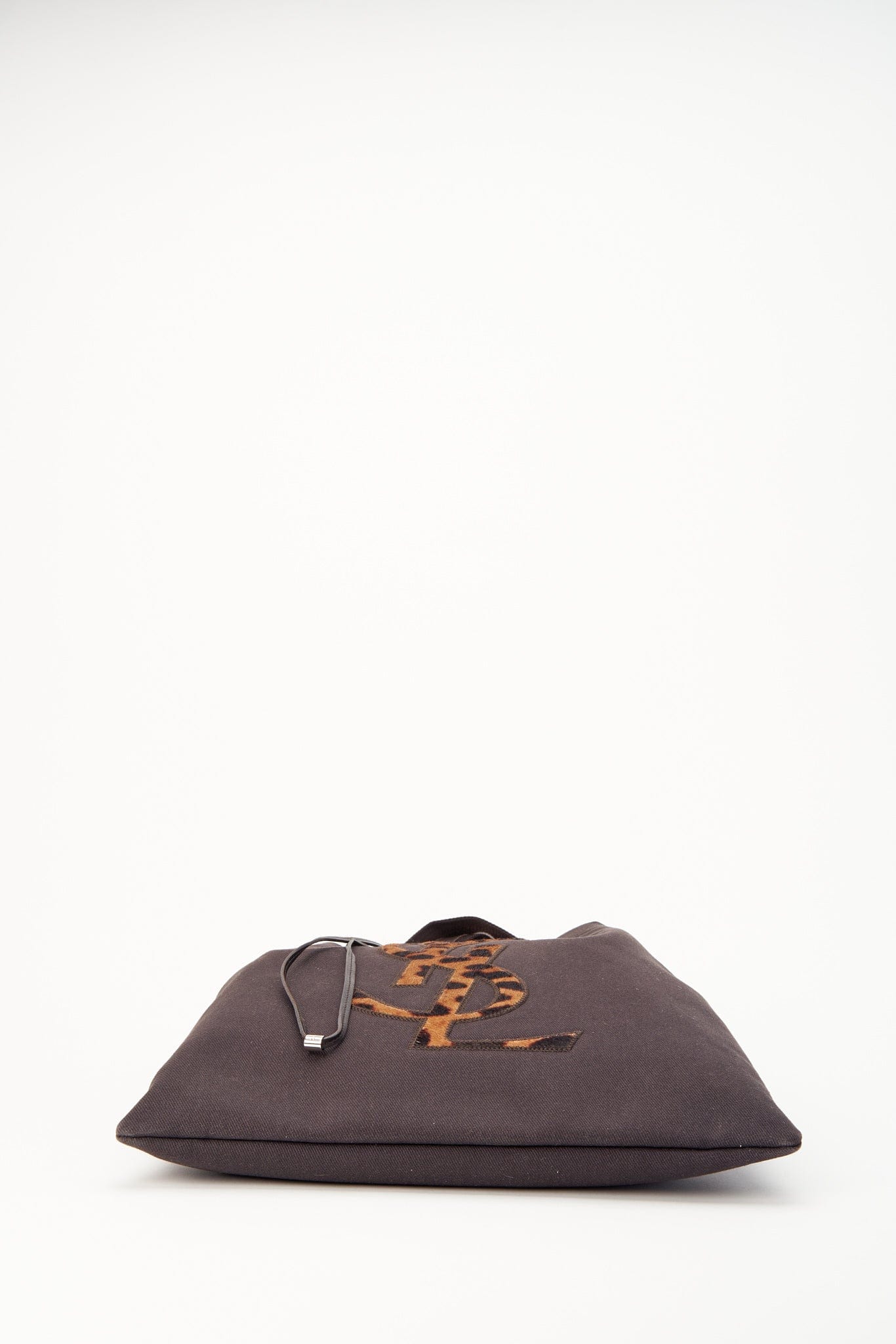 A super chic brown canvas tote bag with leopard printed calf hair logo detail, brown leather detail and silver hardware. There is a leather drawstring at the top edge.
